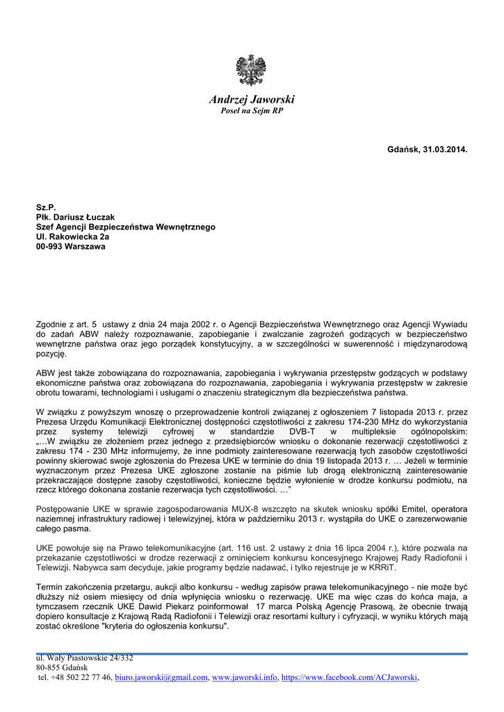 Andrzej Jaworski Poseł na Sejm RP Gdańsk, 31.03.2014. Sz.P. Płk. Dariusz Łuczak Szef Agencji Bezpieczeństwa Wewnętrznego Ul. Rakowiecka 2a 00-993 Warszawa Zgodnie z art. 5 ustawy z dnia 24 maja 2002 r. o Agencji Bezpieczeństwa Wewnętrznego oraz Agencji Wywiadu do zadań ABW należy rozpoznawanie, zapobieganie i zwalczanie zagrożeń godzących w bezpieczeństwo wewnętrzne państwa oraz jego porządek konstytucyjny, a w szczególności w suwerenność i międzynarodową pozycję. ABW jest także zobowiązana do rozpoznawania, zapobiegania i wykrywania przestępstw godzących w podstawy ekonomiczne państwa oraz zobowiązana do rozpoznawania, zapobiegania i wykrywania przestępstw w zakresie obrotu towarami, technologiami i usługami o znaczeniu strategicznym dla bezpieczeństwa państwa. W związku z powyższym wnoszę o przeprowadzenie kontroli związanej z ogłoszeniem 7 listopada 2013 r. przez Prezesa Urzędu Komunikacji Elektronicznej dostępności częstotliwości z zakresu 174-230 MHz do wykorzystania przez systemy telewizji cyfrowej w standardzie DVB-T w multipleksie ogólnopolskim: „…W związku ze złożeniem przez jednego z przedsiębiorców wniosku o dokonanie rezerwacji częstotliwości z zakresu 174 - 230 MHz informujemy, że inne podmioty zainteresowane rezerwacją tych zasobów częstotliwości powinny skierować swoje zgłoszenia do Prezesa UKE w terminie do dnia 19 listopada 2013 r. … Jeżeli w terminie wyznaczonym przez Prezesa UKE zgłoszone zostanie na piśmie lub drogą elektroniczną zainteresowanie przekraczające dostępne zasoby częstotliwości, konieczne będzie wyłonienie w drodze konkursu podmiotu, na rzecz którego dokonana zostanie rezerwacja tych częstotliwości. …” Postępowanie UKE w sprawie zagospodarowania MUX-8 wszczęto na skutek wniosku spółki Emitel, operatora naziemnej infrastruktury radiowej i telewizyjnej, która w październiku 2013 r. wystąpiła do UKE o zarezerwowanie całego pasma. UKE powołuje się na Prawo telekomunikacyjne (art. 116 ust. 2 ustawy z dnia 16 lipca 2004 r.), które pozwala na przekazanie częstotliwości w drodze rezerwacji z ominięciem konkursu koncesyjnego Krajowej Rady Radiofonii i Telewizji. Nabywca sam decyduje, jakie programy będzie nadawać, i tylko rejestruje je w KRRiT. Termin zakończenia przetargu, aukcji albo konkursu - według zapisów prawa telekomunikacyjnego - nie może być dłuższy niż osiem miesięcy od dnia wpłynięcia wniosku o rezerwację. UKE ma więc czas do końca maja, a tymczasem rzecznik UKE Dawid Piekarz poinformował 17 marca Polską Agencję Prasową, że obecnie trwają dopiero konsultacje z Krajową Radą Radiofonii i Telewizji oraz resortami kultury i cyfryzacji, w wyniku których mają zostać określone "kryteria do ogłoszenia konkursu". ul. Wały Piastowskie 24/332 80-855 Gdańsk tel. +48 502 22 77 46, [email protected], www.jaworski.info, https://www.facebook.com/ACJaworski, Powyższe, w świetle wypowiedzi także dla PAP dyrektora ds. regulacji w Emitelu pana Jarosława Niechcielskiego: "Otrzymaliśmy od UKE pismo, że do końca kwietnia rozpatrzy nasz wniosek. Jeżeli do tego czasu ta sprawa nie zostanie rozstrzygnięta, złożymy zażalenie na bezczynność regulatora", oznacza praktycznie brak jakiegokolwiek nadzoru nad przyszłością polskiego ładu medialnego w zakresie nadawania cyfrowego naziemnego. Dyrektora ds. regulacji w Emitelu pan Jarosław Niechcielski podkreślił, spółka występując z wnioskiem rozważała różne scenariusze, liczyła m.in. na zostanie aktywnym operatorem MUX 8. Oznaczałoby to, że Emitel zarządzałby multipleksem nie tylko pod względem technicznym, ale także pod względem doboru programów. Przygotowywany przetarg (konkurs) wygra zgodnie z przyjętym założeniem ten kto najwięcej zapłaci. Może to być więc równie dobrze firma rosyjska czy niezidentyfikowany podmiot zarejestrowany np. na Cyprze, który zamiast KRRiT sam decydowałby o doborze programów. Biorąc pod uwagę jak wielkie emocje wywołuje wybór programów ogólnie dostępnych na multipleksach np. kilka milionów podpisów i kilkaset marszy w sprawie TV TRWAM, i jak wielką wartość stanowi uzyskanie stosownej koncesji, wniosek o przeprowadzenie kontroli jest jak najbardziej zasadny. ul. Wały Piastowskie 24/332 80-855 Gdańsk tel. +48 502 22 77 46, [email protected], www.jaworski.info, https://www.facebook.com/ACJaworski,