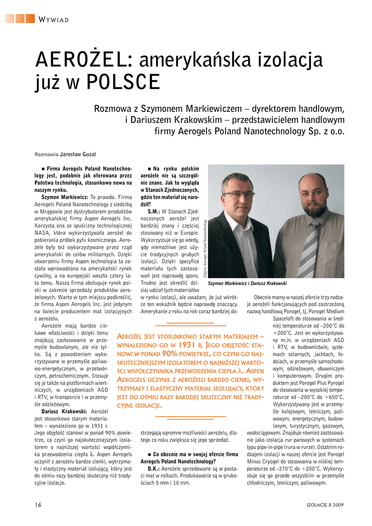 WYWIAD AEROŻEL: amerykańska izolacja już w POLSCE Rozmowa z Szymonem Markiewiczem – dyrektorem handlowym, i Dariuszem Krakowskim – przedstawicielem handlowym firmy Aerogels Poland Nanotechnology Sp. z o.o. Rozmawia Jarosław Guzal Firma Aerogels Poland Nanotechnology jest, podobnie jak oferowana przez Państwa technologia, stosunkowo nowa na naszym rynku. Szymon Markiewicz: To prawda. Firma Na rynku polskim aerożele nie są szczególnie znane. Jak to wygląda w Stanach Zjednoczonych, gdzie ten materiał się narodził? S.M.: W Stanach Zjed- Zdjęcie: Aerogels Poland Nanotechnology Aerogels Poland Nanotechnology z siedzibą w Mrągowie jest dystrybutorem produktów amerykańskiej firmy Aspen Aerogels Inc. noczonych aerożel jest Korzysta ona ze spuścizny technologicznej bardziej znany i częściej NASA, która wykorzystywała aerożel do stosowany niż w Europie. pobierania próbek pyłu kosmicznego. Aero- Wykorzystuje się go wtedy, żele były też wykorzystywane przez rząd gdy niemożliwe jest użyamerykański do celów militarnych. Dzięki cie tradycyjnych grubych utworzeniu firmy Aspen technologia ta zo- izolacji. Dzięki specyfice stała wprowadzona na amerykański rynek materiału tych zastosocywilny, a na europejski weszła cztery la- wań jest naprawdę sporo. ta temu. Nasza firma obsługuje rynek pol- Trudno jest określić dzi- Szymon Markiewicz i Dariusz Krakowski ski w zakresie sprzedaży produktów aero- siaj udział tych materiałów Obecnie mamy w naszej ofercie trzy rodzażelowych. Warto w tym miejscu podkreślić, w rynku izolacji, ale uważam, że już wkrótże firma Aspen Aerogels Inc. jest jedynym ce ten wskaźnik będzie naprawdę znaczący. je aerożeli funkcjonujących pod zastrzeżoną na świecie producentem mat izolacyjnych Amerykanie z roku na rok coraz bardziej do- nazwą handlową Porogel, tj. Porogel Medium Spaceloft do stosowania w średz aerożelu. niej temperaturze od –200°C do Aerożele mają bardzo cie+200°C. Jest on wykorzystywakawe właściwości i dzięki temu AEROŻEL JEST STOSUNKOWO STARYM MATERIAŁEM – ny m.in. w urządzeniach AGD znajdują zastosowanie w przemyśle budowlanym, ale nie tyl- WYNALEZIONO GO W 1931 R. JEGO OBJĘTOŚĆ STA- i RTV, w budownictwie, systeko. Są z powodzeniem wyko- NOWI W PONAD 90% POWIETRZE, CO CZYNI GO NAJ- mach solarnych, jachtach, łorzystywane w przemyśle paliwo- SKUTECZNIEJSZYM IZOLATOREM O NAJNIŻSZEJ WARTO - dziach, w przemyśle samochodowo-energetycznym, w przetwór- ŚCI WSPÓŁCZYNNIKA PRZEWODZENIA CIEPŁA λ. ASPEN wym, odzieżowym, obuwniczym i komputerowym. Drugim proczym, petrochemicznym. Stosuje się je także na platformach wiert- AEROGELS UCZYNIŁ Z AEROŻELU BARDZO CIENKI, WY- duktem jest Porogel Plus Pyrogel niczych, w urządzeniach AGD TRZYMAŁY I ELASTYCZNY MATERIAŁ IZOLUJĄCY, KTÓRY do stosowania w wysokiej tempei RTV, w transporcie i w przemy- JEST DO OŚMIU RAZY BARDZIEJ SKUTECZNY NIŻ TRADY- raturze od –200°C do +650°C. Wykorzystywany jest w przemyśle odzieżowym. CYJNE IZOLACJE. Dariusz Krakowski: Aerożel śle kolejowym, lotniczym, palijest stosunkowo starym materiawowym, energetycznym, budowłem – wynaleziono go w 1931 r. lanym, turystycznym, gazowym, Jego objętość stanowi w ponad 90% powie- strzegają ogromne możliwości aerożelu, dla- wodociągowym. Znajduje również zastosowatrze, co czyni go najskuteczniejszym izola- tego co roku zwiększa się jego sprzedaż. nie jako izolacja rur parowych w systemach torem o najniższej wartości współczynnitypu pipe-in-pipe (rura w rurze). Ostatnim ro Co obecnie ma w swojej ofercie firma ka przewodzenia ciepła λ. Aspen Aerogels dzajem izolacji w naszej ofercie jest Porogel uczynił z aerożelu bardzo cienki, wytrzyma- Aerogels Poland Nanotechnology? Minus Cryogel do stosowania w niskiej temD.K.: Aerożele sprzedawane są w postały i elastyczny materiał izolujący, który jest peraturze od –270°C do +200°C. Wykorzydo ośmiu razy bardziej skuteczny niż trady- ci mat w rolkach. Produkowanie są w grubo- stuje się go przede wszystkim w przemyśle ściach 5 mm i 10 mm. chłodniczym, lotniczym, paliwowym. cyjne izolacje. 16 IZOLACJE X 2009 WYWIAD producentów kriokomór. Są to konstrukcje o nietypowym kształcie, do izolacji których Porogel doskonale się nadaje, gdyż można go dowolnie kształtować. Oczekujemy także na zainteresowanie producentów sprzętem przemawiającym za wyborem Porogelu tu AGD i RTV. Może on być też z powodzejest wartość współczynnika λ. Waha się ona niem stosowany w segmencie izolacji techna poziomie 0,013–0,016 W/(m·K). nicznych. Zgodnie z aprobatą techMożliwości jest więc sporo niczną ITB Porogel przeznaczoi chcemy je wkrótce wykorzyny jest do wykonywania izolacji POROGEL MOŻNA STOSOWAĆ OD WEWNĘTRZNEJ STRO- stać. cieplnej sufitów, ścian i stropów NY ŚCIANY I NIE TRACIĆ PRZY TYM POWIERZCHNI, CO Aby jednak upowszechnić wewnątrz suchych pomieszczeń ze szkieletem drewnianym albo JEST SZCZEGÓLNIE ISTOTNE W BUDYNKACH STARYCH ten materiał na naszym rynku, ze ścianami z betonu lub z cegły, LUB ZABYTKOWYCH. W WIELKIEJ BRYTANII ISTNIEJE NA- czeka Państwa sporo pracy. izolacji cieplnej w ścianach war- WET SPECJALNY PROGRAM IZOLOWANIA STARYCH BU- Trzeba przede wszystkim przekonać potencjalnych nabywców stwowych oraz do wykonywania DYNKÓW WŁAŚNIE ZA POMOCĄ AEROŻELI. do tego typu izolacji. podkładów pod wylewki cemenS.M.: Wiemy, jak ważna jest towe, izolacji ościeży w bezspoedukacja przy wprowadzaniu noinowych systemach ociepleń, izolacji rurociągów i w obudowie domów rucho- nie w elewację. Duże nadzieje wiążemy rów- wego produktu. Dlatego już dziś planujemy mych takich jak przyczepy mieszkalne. Po- nież z izolacją podłóg. Mała grubość nasze- organizację wielu szkoleń, podczas których rogel można stosować od wewnętrznej stro- go materiału w wielu wypadkach będzie de- prezentowana będzie specyfika Porogelu. W tej chwili jes