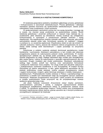 509 Stefan SZAŁACH Koszalińska Wyższa Szkoła Nauk Humanistycznych EDUKACJA A KSZTAŁTOWANIE KOMPETENCJI W światowej gospodarce jesteśmy świadkami głębokiego procesu globalizacji i funkcjonowania w warunkach wielokulturowych. Proces globalizacji i dalszego narastania zjawiska tworzenia się społeczeństw wielokulturowych, stawia przed człowiekiem nowe oczekiwania i nowe wyzwania. W społeczeństwach zachodnich proces ten ma swoją dynamikę i rozciąga się w czasie, ma również swoje przełożenie na społeczeństwo polskie. Skutki światowej globalizacji i przemian politycznych w naszym kraju nałożyły się na oczekiwania, jakie stawiane są człowiekowi. Dzisiaj oczekuje się umiejętności funkcjonowania w sytuacjach o poszerzonym zakresie wolności i dużej niepewności. We współczesnym świecie człowiek radzi sobie wówczas, gdy potrafi samodzielnie stawiać sobie cele, formułować sposoby ich realizacji i osiągać w praktyce to, co wcześniej zaplanował. Współczesny świat na tyle się zmienił, że człowiek posłuszny i bierny, jeszcze tak niedawno dobrze przygotowany do życia, dzisiaj zasila szeregi osób bezrobotnych i często pozostaje na utrzymaniu państwa. Dotychczas w polskim systemie edukacji dominował apodyktyczny model kształcenia i wychowania. Absolwent wykształcony w tym modelu jest właściwie przygotowany jedynie do wykonywania poleceń osoby podmiotowej. W modelu apodyktycznym zakłada się, że istnieje jeden prawidłowy obraz świata i jeden sposób reagowania na niego. Dlatego absolwent tego modelu jest ukształtowany jako osoba bierna i zdolna do wykonywania z zewnątrz zaproponowanych dla niej czynności. Drugim modelem jest model podmiotowy. Absolwent wykształcony według tego modelu potrafi być twórczy oraz samodzielnie formułować i praktycznie realizować nowe projekty. Ten drugi model jest aktualnie zalecanym i praktykowanym systemem kształcenia w Unii Europejskiej. W krajach Europy Zachodniej już dawno stwierdzono, iż tam, gdzie efektywnie wprowadza się do praktyki podmiotowy model edukacji, można uzyskać przyspieszony rozwój i wygrać konkurencję z krajami, gdzie dominuje edukacja w modelu tradycyjnym – apodyktycznym. Przekształcenie modelu edukacji w Polsce z apodyktycznego na podmiotowy w świetle tych doświadczeń staje się szczególnie cennym zadaniem narodowym. Właściwe przygotowanie nauczycieli i szkół (uczelni) do kształcenia w modelu podmiotowym może przyczynić się do przyspieszonego rozwoju społeczno-gospodarczego kraju. Jak pisze Tadeusz Lewowicki Zrozumienie relacji między państwem, społeczeństwem, jednostką i szkołą, a następnie zaproponowanie działań sprzyjających kształtowaniu właściwych relacji, to podstawowe zadanie nauki o szkole. To określenie społecznego miejsca i funkcji szkoły oraz przedstawienie koncepcji współczesnej szkoły stworzy szansę uporania się z licznymi problemami 1 szczegółowymi nękającymi tę instytucję. 1 T. Lewowicki, Państwo, jednostka a szkoła – uwagi na kanwie Nauki o Szkole Józefa Kuźmy, (w:) Szkoła w nauce i praktyce edukacyjnej, (red.) B. Muchacka, t. I. Kraków 2006, s. 81-82 510 1. Oczekiwania wobec współczesnej edukacji W rezultacie narastania procesu globalizacji i wielokulturowości oraz przemian politycznych w naszej części świata, powinny nastąpić również głębokie zmiany w sposobie kształcenia i przygotowania młodego pokolenia do życia, w tym 2 nauczycieli. Chodzi o to, aby absolwent potrafił to, czego oczekuje od niego współczesny rynek pracy. Funkcjonujący dotychczas system edukacji przygotowywał człowieka do biernego i bezdyskusyjnego wykonywania z góry zadanych obowiązków i poleceń. Natomiast ważnym elementem współczesnego działania jest umiejętność samodzielnego funkcjonowania w sytuacjach o poszerzonej wolności, czyli stawianie sobie celów, podejmowanie decyzji, praca w zespole i nie tylko kompetencje badawcze lecz również umiejętność wykorzystania dostępnej nam wiedzy do twórczego rozwiązywania problemów. Dzisiaj ważne są: wykazywanie postawy otwartości i odpowiedzialności za wykonywane zadania, zdolność do kierowania osobami samodzielnie podejmującymi decyzje, zarządzanie konfliktem oraz twórcze rozwiązywanie problemów i ciągłe zapotrzebowanie na nową wiedzę. Powstało zapotrzebowanie na wiedzę kompensującą niewydolność kultury w spełnianiu roli tego, co dobre i właściwe. Szybkie zmiany, podwajanie się wiedzy co 5 lat, migracja i nowe zadania wymagają poddawania weryfikacji wszystkich 3 zaleceń i wzorców kulturowych. Terminem „nowy indywidualizm”. Autor ten określa zmiany zachodzące w osobowości ludzi. Cechą charakterystyczną tego zjawiska jest nadanie wysokiej rangi w odkrywaniu przez człowieka swoich możliwości. Przyczynił się do tego brak spełniania przez kulturę funkcji inspirującej, kontrolującej i nauczającej, która nie daje możliwości określenia norm postępowania. Niezbędne staje się podejmowanie przez każdego człowieka trudu określania drogi samorealizacji. K. Obuchowski zwraca uwagę na konieczność odkrywania przez człowieka samego siebie, gdyż otaczający go świat stale się zmienia; dlatego też człowiek jest odpowiedzialny za kierunek zmian tego świata i samego siebie. Działania wychowawcze, zdaniem tegoż samego autora, powinny być skoncentrowane na pomocy człowiekowi w tym, aby potrafił wytworzyć sobie pogląd na dany temat, potrafił go zmieniać w wyniku negocjacji ze światem i pomagał innym w budowaniu własnych przekonań. Stwarzanie własnego poglądu na świat wymaga refleksji opartej na wysiłku i postrzeganiu świata jako szansy dla spełnienia swoich celów. Z przedstawionych wyżej postulatów wobec wychowania wynika zasadność uwzględniania - w procesie kształcenia zindywidualizowanego – podmiotowości 4 nauczyciela i ucznia (studenta) oraz respektowania zasady indywidualiz