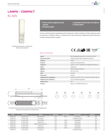 73 OŚWIETLENIE www.stego.pl KATALOG PRODUKTÓW STEGO DANE TECHNICZNE LAMPA – COMPACT KL 025 >>Prosty montaż magnetyczny lub szynowy >>Energooszczędna >>Z gniazdem lub bez (różne do wyboru) >>Z wyłącznikiem Lampa ta została specjalnie zaprojektowana dla zastosowania w szafach rozdzielczych. Dzięki magnesowi można ją zamocować w dowolnym miejscu na stalowej ścianie szafy sterowniczej. Wbudowane gniazdo elektryczne umożliwia zasilanie dalszych urządzeń. Rysunek pokazuje lampę z zamocowanym kloszem (patrz akcesoria) Jasność 900 Lm (odpowiada żarówce 75 W / 230 V, 60 W / 120 V) Rodzaj źródła światła żarówka energooszczędna z wbudowanym starterem Żywotność 5.000 h Wyłącznik wyłącznik 0-I dla źródła światła Podłączenie zaciski 3 x 2,5 mm2 z odciążeniem, siła dokręcania 0,8 Nm max. Montaż magnetyczny Obudowa tworzywo sztuczne, jasnoszare Wymiary 355 x 65 x 70 mm Ciężar ok. 1,0 kg Pozycja pracy dowolna Temperatura pracy i składowania -20 do +50 °C (-4 do +122 °F) / -45 do +70 °C (-49 do +158 °F) Wilgotność pracy i składowania max. 90 % RH (bez kondensacji) Stopień ochrony IP20 Akcesoria Osłona, nr art. 09520.0-00 (patrz rys.) W szafach z tworzyw sztucznych, aluminiowych lub z metali niemagnetycznych lampę można zamocować na szynę DIN 35 mm. Nr. art Napięcie pracy Gniazdo Pobór mocy Prąd nominalny Klasa ochrony 02500.0-00 AC 230V , 50 Hz Niemcy/Rosja (1) 11 W 16,0 A I (uziemienie) VDE Aprobacje EAC 02500.0-07 AC 230 V, 50 Hz Bez gniazda 11 W - II (podwójna izolacja) - EAC 02501.0-00 AC 230 V, 50 Hz F/PL/CZ/SK (2) 11 W 16,0 A I (uziemienie) - EAC 02502.0-00 AC 230 V, 50 Hz Szwajcaria (3) 11 W 10,0 A I (uziemienie) - EAC 02510.0-00 AC 230 V, 50 Hz Wielka Brytania/Irlandia (4) 11 W 13,0 A I (uziemienie) - EAC 02512.0-00 AC 230 V, 50 Hz Włochy (6) 11 W 16,0 A I (uziemienie) - EAC 02505.9-00 AC 120 V, 60 Hz USA/Kanada (5) 9W 15,0 A I (uziemienie) - EAC 02505.9-01 AC 120 V, 60 Hz Bez gniazda 9W - II (podwójna izolacja) - EAC 11.08.2016 | Zmiany techniczne zastrzeżone. Wszystkie parametry mogą podlegać zmianie. Poniższe informacje nie zwalniają nabywcy od samodzielnej kontroli instalacji. DANE TECHNICZNE