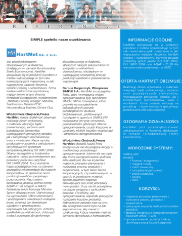 R E F E R E N C J SIMPLE spe³ni³o nasze oczekiwania Jest przedsiêbiorstwem zlokalizowanym w Radomiu, dzia³aj¹cym w ramach Tarnobrzeskiej Strefy Ekonomicznej. HartMet specjalizuje siê w produkcji wyrobów z metalu wykorzystuj¹c w tym celu nowoczesny park maszynowy, w jaki wyposa¿ono wydzia³y t³oczenia, obróbki cieplnej i narzêdziowni. Firma zosta³a wielokrotnie wyró¿niona, miêdzy innymi w tym dwoma Medalami Europejskimi, wyró¿nieniem „Panteon Polskiej Ekologii” Ministra Œrodowiska i Prezesa PCBC, rekomendacj¹ Business Centre Club. W³odzimierz Chojnacki,Prezes HartMet: Nasza dzia³alnoœæ obejmuje realizacjê zleceñ wykonania, z materia³u w³asnego b¹dŸ powierzonego, zarówno serii pojedynczych elementów, wymagaj¹cych precyzyjnej obróbki, jak i kompletnych mechanizmów, wraz z monta¿em. Nasze wyroby produkujemy zgodnie z wdro¿onym i certyfikowanym systemem zarz¹dzania jakoœci¹ ISO 9001:2000. Dbamy szczególnie o œrodowisko naturalne, czego potwierdzeniem jest posiadany przez nas certyfikat ISO:14001:2004. To co wyró¿nia nasze przedsiêbiorstwo, co stanowi szczególn¹ rekomendacjê dla naszych kooperantów, to spe³nienie norm produkcji wyrobów specjalnego przeznaczenia. Nasz system zarz¹dzania jakoœci¹ spe³nia normy AQAP-21.20 przyjête w NATO. Posiadamy tak¿e koncesjê Ministra Spraw Wewnêtrznych i Administracji na wytwarzanie i obrót elementami i podzespo³ami okreœlonych rodzajów broni, amunicji czy elementami wyrobów o przeznaczeniu wojskowym lub policyjnym. Jesteœmy spadkobierc¹ wieloletnich, chlubnych tradycji przemys³u zbrojeniowego zlokalizowanego w Radomiu. Wiêkszoœæ naszych pracowników to specjaliœci o wieloletnim doœwiadczeniu, niezbêdnym w wymagaj¹cej szczególnej precyzji produkcji wyrobów o przeznaczeniu wojskowym. Dariusz Kacperczyk, Wiceprezes SIMPLE S.A.: HartMet to szczególna firma, wiêc i wymagania wobec oprogramowania by³y specyficzne. SIMPLE.ERP to rozwi¹zanie, które pozwala na uwzglêdnienie indywidualnych potrzeb przedsiêbiorstw. Budowa dedykowanych, profilowanych rozwi¹zañ w oparciu o SIMPLE.ERP realizowana jest przy utrzymaniu powtarzalnoœci g³ównego rdzenia oprogramowania, co jest kluczowe w uzyskaniu niskich kosztów eksploatacji i utrzymania oprogramowania. W³odzimierz Chojnacki,Prezes HartMet: Rozwój naszej firmy zmotywowa³ nas do podjêcia decyzji o modernizacji posiadanego oprogramowania. Istotne dla nas by³o, aby nowe oprogramowanie spe³nia³o kilka istotnych dla nas kryteriów: wsparcie procesów planowania i rozliczania procesu produkcji i zaopatrzenia, w tym tak¿e zleceñ kooperacyjnych, czy realizowanych w oparciu o powierzony materia³. System powinien wspieraæ obowi¹zuj¹ce nas œciœle procedury norm jakoœci. Du¿y nacisk po³o¿yliœmy na obszar zwi¹zany z rachunkiem kosztów. Chcieliœmy, aby oprogramowanie wspiera³o precyzyjne rozliczanie kosztów produkcji. Jednoczeœnie zale¿a³o nam na tym, aby oprogramowanie by³o na tyle ergonomiczne, aby nawet ci u¿ytkownicy, którzy niewiele mieli do czynienia dotychczas z komputerami, E INFORMACJE OGÓLNE HartMet specjalizuje siê w produkcji wyrobów z metalu wykorzystuj¹c w tym celu nowoczesny park maszynowy, w jaki wyposa¿ono wydzia³y t³oczenia, obróbki cieplnej i narzêdziowni. HartMet posiada wdro¿ony system jakoœci ISO 9001:2000, ISO 14001:2004 oraz AQAP - 21.20 dla wyrobów wykorzystywanych w NATO. OFERTA HARTMET OBEJMUJE: Realizacjê zleceñ wykonania, z materia³u w³asnego b¹dŸ powierzonego, zarówno s e r i i p o j e d y n c z y c h e l e m e n t ó w, wymagaj¹cych precyzyjnej obróbki, jak i kompletnych mechanizmów, wraz z monta¿em. Firma posiada koncesjê na produkcjê i obrót wyrobami specjalnego przeznaczenia dla wojska i policji. GEOGRAFIA DZIA£ALNOŒCI: HartMet jest przedsiêbiorstwem zlokalizowanym w Radomiu, dzia³aj¹cym w r a m a c h Ta r n o b r z e s k i e j S t re f y Ekonomicznej. WDRO¯ONE SYSTEMY: SIMPLE.ERP modu³y: P finanse i ksiêgowoœæ P maj¹tek trwa³y P obrót towarowy P zarz¹dzanie personelem P proces produkcji P analizy P INFO KORZYŒCI: P wsparcie procesów planowania i rozliczania procesu produkcji i zaopatrzenia P precyzyjne wsparcie rozliczania kosztów produkcji Pg³êboka integracja z oprogramowaniem Microsoft Office - Excel Poprogramowanie posiada funkcje u³atwiaj¹ce pracê ka¿dej ksiêgowej R E F E byli je w stanie obs³ugiwaæ. Po rozpoznaniu potencjalnych dostawców oprogramowania zdecydowaliœmy siê wybraæ system SIMPLE.ERP. Robert Komorek, Kierownik Projektu Wdro¿eniowego HartMet: Zdecydowaliœmy siê zakupiæ kompletny system SIMPLE.ERP, obejmuj¹cy wszystkie dostêpne obszary: Produkcjê, Obrót towarowy, Personel, Maj¹tek Trwa³y, Finanse i Ksiêgowoœæ, Analizy. Poniewa¿ wczeœniejsze rozwi¹zanie nie wspiera³o naszych mened¿erów w zakresie podejmowania decyzji, szczególny nacisk po³o¿yliœmy na rozbudowê analiz. Wykorzystaliœmy funkcjonalnoœæ SIMPLE.ERP g³êbokiej integracji z oprogramowaniem Microsoft Office - Excel. Mo¿na by rzec, ¿e Excel sta³ siê w naszym przypadku czymœ w rodzaju dodatkowego interfejsu do systemu. To bardzo dobre po³¹czenie. Excel to oprogramowanie, które praktycznie znaj¹ wszyscy, a integracja z SIMPLE.ERP pozwala nam za pomoc¹ Excela budowaæ z³o¿one zestawienia, które s¹ zawsze aktualne. W³odzimierz Chojnacki,Prezes HartMet: Kiedyœ musia³em czekaæ na koniec okresu rozliczeniowego, ¿eby przeanalizowaæ wyniki firmy i op³acalnoœæ poszczególnych zleceñ w produkcji. Dziœ te dane mam dostêpne na bie¿¹co, w dodatku w prostej formie tabel Excel. Teresa Furmañska, G³ówna Ksiêgowa: Oprogramowanie SIMPLE.ERP umo¿liwi³o nam wprowadzenie usprawnieñ w organizacji pracy mojego dzia³u, co przek³ada siê na wy¿sz¹ jakoœæ obs³ugi ksiêgowej zarówno naszej firmy, jak i naszych kontrahentów. Jako ksiêgowa wysoko oceniam funkcjonalnoœæ oprogramowania SIMPLE.ERP, które jest zgodn