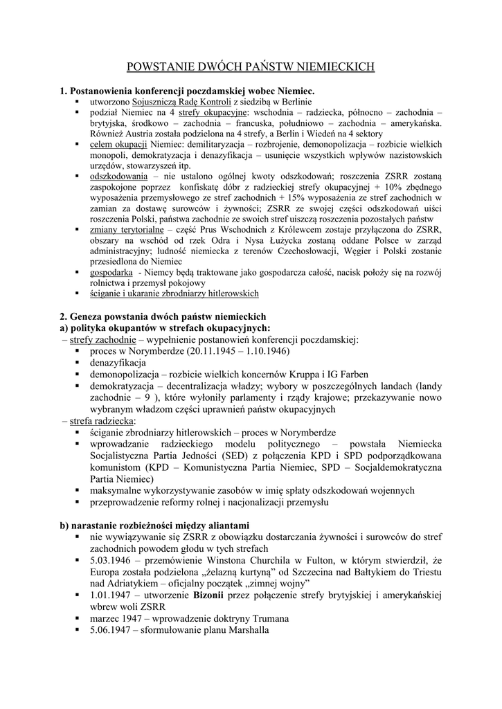 POWSTANIE DWÓCH PAŃSTW NIEMIECKICH 1. Postanowienia konferencji poczdamskiej wobec Niemiec. utworzono Sojuszniczą Radę Kontroli z siedzibą w Berlinie podział Niemiec na 4 strefy okupacyjne: wschodnia – radziecka, północno – zachodnia – brytyjska, środkowo – zachodnia – francuska, południowo – zachodnia – amerykańska. Również Austria została podzielona na 4 strefy, a Berlin i Wiedeń na 4 sektory celem okupacji Niemiec: demilitaryzacja – rozbrojenie, demonopolizacja – rozbicie wielkich monopoli, demokratyzacja i denazyfikacja – usunięcie wszystkich wpływów nazistowskich urzędów, stowarzyszeń itp. odszkodowania – nie ustalono ogólnej kwoty odszkodowań; roszczenia ZSRR zostaną zaspokojone poprzez konfiskatę dóbr z radzieckiej strefy okupacyjnej + 10% zbędnego wyposażenia przemysłowego ze stref zachodnich + 15% wyposażenia ze stref zachodnich w zamian za dostawę surowców i żywności; ZSRR ze swojej części odszkodowań uiści roszczenia Polski, państwa zachodnie ze swoich stref uiszczą roszczenia pozostałych państw zmiany terytorialne – część Prus Wschodnich z Królewcem zostaje przyłączona do ZSRR, obszary na wschód od rzek Odra i Nysa Łużycka zostaną oddane Polsce w zarząd administracyjny; ludność niemiecka z terenów Czechosłowacji, Węgier i Polski zostanie przesiedlona do Niemiec gospodarka - Niemcy będą traktowane jako gospodarcza całość, nacisk położy się na rozwój rolnictwa i przemysł pokojowy ściganie i ukaranie zbrodniarzy hitlerowskich 2. Geneza powstania dwóch państw niemieckich a) polityka okupantów w strefach okupacyjnych: – strefy zachodnie – wypełnienie postanowień konferencji poczdamskiej: proces w Norymberdze (20.11.1945 – 1.10.1946) denazyfikacja demonopolizacja – rozbicie wielkich koncernów Kruppa i IG Farben demokratyzacja – decentralizacja władzy; wybory w poszczególnych landach (landy zachodnie – 9 ), które wyłoniły parlamenty i rządy krajowe; przekazywanie nowo wybranym władzom części uprawnień państw okupacyjnych – strefa radziecka: ściganie zbrodniarzy hitlerowskich – proces w Norymberdze wprowadzanie radzieckiego modelu politycznego – powstała Niemiecka Socjalistyczna Partia Jedności (SED) z połączenia KPD i SPD podporządkowana komunistom (KPD – Komunistyczna Partia Niemiec, SPD – Socjaldemokratyczna Partia Niemiec) maksymalne wykorzystywanie zasobów w imię spłaty odszkodowań wojennych przeprowadzenie reformy rolnej i nacjonalizacji przemysłu b) narastanie rozbieżności między aliantami nie wywiązywanie się ZSRR z obowiązku dostarczania żywności i surowców do stref zachodnich powodem głodu w tych strefach 5.03.1946 – przemówienie Winstona Churchila w Fulton, w którym stwierdził, że Europa została podzielona „żelazną kurtyną” od Szczecina nad Bałtykiem do Triestu nad Adriatykiem – oficjalny początek „zimnej wojny” 1.01.1947 – utworzenie Bizonii przez połączenie strefy brytyjskiej i amerykańskiej wbrew woli ZSRR marzec 1947 – wprowadzenie doktryny Trumana 5.06.1947 – sformułowanie planu Marshalla luty 1948 – konferencja w Londynie w sprawie przyszłości Niemiec. Nie został na nią zaproszony przedstawiciel ZSRR – bezpośrednia przyczyna zerwania współpracy dawnych sojuszników. ZSRR uznał ją za zerwanie postanowień poczdamskich 20.03.1948 – zerwanie posiedzenia Sojuszniczej Rady Kontroli skutkiem odmowy przedstawienia postanowień konferencji londyńskiej przez państwa zachodnie 3. I Kryzys berliński 24.06.1948 – 4.05.1949 - bezpośrednia konfrontacja mocarstw a) przyczyny – wprowadzenie reformy walutowej w zachodnich strefach okupacyjnych i w Berlinie (20.06.1948) doprowadziło do chaosu i inflacji w radzieckim sektorze Berlina gdyż ludność z sektorów zachodnich wykupywała wszystko ze sklepów, za pieniądze, które nie podlegały wymianie. Berlin został podzielony na dwie strefy walutowe. ZSRR został zmuszony do przeprowadzenia reformy walutowej w swojej strefie – 23.06.1948 r. b) przebieg : 24.06.1948 – Rosjanie zablokowali wszystkie lądowe drogi komunikacyjne łączące strefy zachodnie z zachodnimi sektorami Berlina 28.06.1948 – decyzja o utworzeniu „mostu powietrznego” – dostarczanie surowców i żywności do zachodniej części Berlina drogą powietrzną. lipiec 1948 – rozwiązanie Sojuszniczej Komendantury Berlina. październik 1948 – powstanie władz miejskich Berlina Zachodniego. maj 1949 – zakończenie blokady Berlina. 4. Powstanie Republiki Federalnej Niemiec (RFN) 1.07.1948 – parlamentom krajowym wręczono Dokumenty Frankfurckie – do 1.09.1948 r. mają zwołać zgromadzenie konstytucyjne, które uchwali konstytucję przyszłych Niemiec. 1.09.1948 – posiedzenie Rady Parlamentarnej w Bonn. 8.04.1949 – utworzenie Trizonii (Bizonia plus strefa francuska) 8.05.1949 – uchwalenie konstytucji przez Radę parlamentarną. 14.08.1949 – wybory do Bundestagu. 12.09.1949 – prezydentem RFN został Theodor Heuss (FDP) 15.09.1949 – kanclerzem został Konrad Adenauer (CDU) 21.09.1949 – proklamowanie powstania Republiki Federalnej Niemiec (RFN 5. Powstanie Niemieckiej Republiki Demokratycznej. maj 1949 – wybory do Niemieckiego Kongresu Ludowego 7.10.1949 – proklamowanie powstania Niemieckiej Republiki Demokratycznej NRD. Prezydentem został Wilhelm Pieck (SED), premierem – Otto Grotewohl. FDP – Partia Liberalno – Demokratyczna CDU – Związek Chrześcijańskiej Demokracji