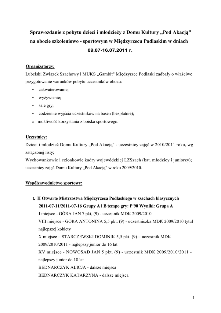 Sprawozdanie z pobytu dzieci i młodzieŜy z Domu Kultury „Pod Akacją" na obozie szkoleniowo - sportowym w Międzyrzecu Podlaskim w dniach 09,07-16.07.2011 r. Organizatorzy; Lubelski Związek Szachowy i MUKS „Gambit" Międzyrzec Podlaski zadbały o właściwe przygotowanie warunków pobytu uczestników obozu: • zakwaterowanie; • wyŜywienie; • sale gry; • codzienne wyjścia uczestników na basen (bezpłatnie); » moŜliwość korzystania z boiska sportowego. Uczestnicy: Dzieci i młodzieŜ Domu Kultury „Pod Akacją" - uczestnicy zajęć w 2010/2011 roku, wg załączonej listy; Wychowankowie i członkowie kadry wojewódzkiej LZSzach (kat. młodzicy i juniorzy); uczestnicy zajęć Domu Kultury „Pod Akacją" w roku 2009/2010. Współzawodnictwo sportowe: t. II Otwarte Mistrzostwa Międzyrzeca Podlaskiego w szachach klasycznych 2011-07-11/2011-07-16 Grupy A i B tempo gry: P'90 Wyniki: Grupa A I miejsce - GÓRA JAN 7 pkt, (9) - uczestnik MDK 2009/2010 VIII miejsce - GÓRA ANTONINA 5,5 pkt. (9) - uczestniczka MDK 2009/2010 tytuł najlepszej kobiety X miejsce – STARCZEWSKI DOMINIK 5,5 pkt. (9) – uczestnik MDK 2009/2010/2011 - najlepszy junior do 16 lat XV miejsce - NOWOSAD JAN 5 pkt. (9) - uczestnik MDK 2009/2010/2011 najlepszy junior do 18 lat BEDNARCZYK ALICJA - dalsze miejsca BEDNARCZYK KATARZYNA - dalsze miejsca 1 Grupa B I miejsce - GRZEGORCZYK JAKUB 7,5 pkt (9) - uczestnik MDK 2009/2010/2011 IV miejsce - WĘGRZYNIAK PAWEŁ 6,0 pkt. (9) - uczestnik MDK 2009/2010/2011, najlepszy do lat 10 VIII miejsce – POLESZCZUK MIKOŁAJ 5,5 pkt. (9) – uczestnik MDK 2009/2010/2011, najlepszy do lat 12 X miejsce - BOCHNIARZ KATARZYNA 5,5 pkt. (9) - uczestniczka MDK 2009/2010/2011, najlepsza do lat 10 XIV miejsce - POLESZCZUK MICHAŁ 5 pkt. (9) XVIII miejsce - SAMUJŁO AGNIESZKA 4,5 (9) XXII miejsce - SPRAWKA JAKUB 4 pkt (9) 2. Turniej Szachów Szybkich „Szachy to teŜ sport" 2011.07.09. tempo gry P'20 VII rund IM Zbigniew Księski 6,5 pkt. (7) - zwycięzca turnieju Open Michał Piasecki - najlepszy junior do lat 12, wychowanek p. Ireny Kasprzyk W turnieju startowali: Czerw Daniel, Góra Jan, Góra Antonina, Bochniarz Katarzyna, Topolan Paweł, Węgrzyniak Dominika, Sprawka Jakub, Samujło Agnieszka wychowankowie MDK „Pod Akacją" 2009/2010/2011 3. Symultana szachowa z IM Zbigniewem Ksicskim, nauczycielem MDK „Pod Akacją" 2011.07.10 Liczba startujących osób -35, wynik +26, - 3, - 6 Partie swoje wygrali: Czerw Dawid, Góra Antonina, Topolan Agata Remisy m.in. : Bochniarz Katarzyna, Nowosad Jan - wszyscy wychowankowie MDL „Pod Akacją" 2 Program szkoleniowy kadry wojewódzkiej i dzieci MDK „Pod Akacją” Trenerzy: Ryszard Bernard i Zbigniew Księski * Wykłady: Elementy poziomu sportowego zawodnika - Ryszard Bernard (2 godz.) 20 zasad prowadzenia gry w końcówce - Zbigniew Księski (2 godz,) 12 typowych i elementarnych końcówek wieŜowych (2 godz.) * Konsultacje indywidualne i zbiorowe: zajęcia podzielono na dwie grupy do obu trenerów - codziennie po ok. 4 godzin dla obu grup * Analiza partii na sali turniejowej z uczestnikami turnieju B - Zbigniew Księski 3