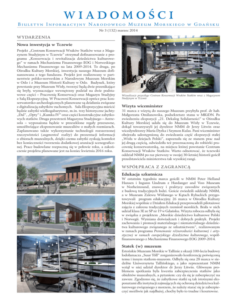 WIADOMOŚCI BIULETYN INFORMACYJNY NARODOWEGO MUZEUM MORSKIEGO W GDAŃSKU Nr 3 (132) marzec 2014 WY DARZENIA Nowa inwestycja w Tczewie Projekt „Centrum Konserwacji Wraków Statków wraz z Magazynem Studyjnym w Tczewie” otrzymał dofinansowanie z programu „Konserwacja i rewitalizacja dziedzictwa kulturowego” w ramach Mechanizmu Finansowego EOG i Norweskiego Mechanizmu Finansowego na lata 2009-2014. To druga, po Ośrodku Kultury Morskiej, inwestycja naszego Muzeum dofinansowana z tego funduszu. Projekt jest realizowany w partnerstwie polsko-norweskim z Narodowym Muzeum Morskim w Oslo i z Muzeum Historii Kultury w Oslo. Budynek, który powstanie przy Muzeum Wisły, tworzyć będą dwie przenikające się bryły, wyznaczające wewnętrzny podział na dwie podstawowe części – Pracownię Konserwacji oraz Magazyn Studyjny z Salą Ekspozycyjną. W Pracowni Konserwacji oprócz prac konserwatorsko-archeologicznych planowane są działania związane z digitalizacją zabytków ruchomych. Sala Ekspozycyjna mieścić będzie zabytki wielkogabarytowe, m.in. trzy historyczne jachty: „Dal”, „Opty” i „Kumka IV” oraz części konstrukcyjne zabytkowych statków. Druga przestrzeń Magazynu Studyjnego – Antresola – wyposażona będzie w przeszklone regały przesuwne, umożliwiające eksponowanie muzealiów o małych rozmiarach. Zaplanowano także wykorzystanie technologii rozszerzonej rzeczywistości (augmented reality) do prezentacji informacji o zbiorach muzealnych, dzięki czemu zabytki zyskają kontekst bez konieczności tworzenia dodatkowej aranżacji scenograficznej. Prace budowlane rozpoczną się w połowie roku, a zakończenie projektu planowane jest na koniec kwietnia 2016 roku. Wizualizacje przyszłego Centrum Konserwacji Wraków Statków wraz z Magazynem Studyjnym w Tczewie Wizyta wiceminister 31 marca z wizytą do naszego Muzeum przybyła prof. dr hab. Małgorzata Omilanowska, podsekretarz stanu w MKiDN. Po zwiedzeniu ekspozycji „21. Dekalog Solidarności” w Ośrodku Kultury Morskiej udała się do Muzeum Wisły w Tczewie, dokąd towarzyszyli jej dyrektor NMM dr Jerzy Litwin oraz wicedyrektorzy Maria Dyrka i Szymon Kulas. Pani wiceminister obejrzała udostępnioną do zwiedzania część ekspozycji stałej „Wisła w dziejach Polski”, zapoznała się ze stanem prac nad jej drugą częścią, odwiedziła też przeznaczoną do robiórki pracownię konserwatorską, na miejscu której powstanie Centrum Konserwacji Wraków Statków. Warto odnotować, że tczewski oddział NMM po raz pierwszy w swojej 30-letniej historii gościł przedstawiciela ministerstwa tak wysokiej rangi. W S P Ó ŁP R AC A Z Z A GR A NI C Ą Edukacja szkutnicza W ostatnim tygodniu marca gościli w NMM Peter Helland Hansen i Ingunn Undrum z Hardanger and Voss Museum w Norheimsund, znawcy i praktycy zawodów związanych z budową tradycyjnych łodzi. Goście zwiedzili oddziały NMM, a w Muzeum Zalewu Wiślanego w Kątach Rybackich przygotowywali program edukacyjny. 26 marca w Ośrodku Kultury Morskiej wspólnie z Działem Edukacji przeprowadzili pilotażowe zajęcia z zakresu tradycyjnych rzemiosł morskich. Brała w nich udział klasa 3E ze SP nr 19 w Gdańsku. Wizyta robocza odbyła się w związku z projektem „Morskie dziedzictwo kulturowe Polski i Norwegii. Wymiana doświadczeń i dobrych praktyk. Projekt zachowania i promocji materialnego i niematerialnego dziedzictwa kulturowego związanego ze szkutnictwem”, realizowanym w ramach programu Promowanie różnorodności kulturowej i artystycznej w ramach europejskiego dziedzictwa kulturowego, współfinansowanego z Mechanizmu Finansowego EOG 2009-2014. Statek (w) muzeum Estońskie Muzeum Morskie w Tallinie z okazji 100-lecia budowy lodołamacza „Suur Tõll” zorganizowało konferencję poświęconą temu i innym statkom-muzeom. Odbyła się ona 28 marca w siedzibie Uniwersytetu Tallińskiego, a jako reprezentant NMM wziął w niej udział dyrektor dr Jerzy Litwin. Głównym problemem spotkania była kwestia zabezpieczenia statków jako obiektów muzealnych, a pytaniem: czy da się je zabezpieczyć na zawsze. Zgodzono się, że zabytkowe statki są tak istotnymi eksponatami dla instytucji zajmujących się ochroną dziedzictwa kulturowego związanego z morzem, że należy starać się je zabezpieczyć możliwie jak najdłużej, choćby było to trudne i kosztowne. WY S TA WY Światło w ciemnościach Towarzystwo Przyjaciół CMM uzyskało dofinansowanie zadania Wystawa czasowa „Lux in tenebris” z programu Dziedzictwo Kulturowe, priorytet Wspieranie działań muzealnych. Jednym z podstawowych wątków ekspozycji będzie postęp techniczny, jaki dokonał się od momentu rozpalenia pierwszego ogniska na wybrzeżu morskim po zastosowanie światła elektrycznego w latarniach morskich. Drugi wątek to prawo nadbrzeżne, które ewoluowało od bezlitosnego grabienia i mordowania rozbitków do zasady ratowania ludzkiego życia, statków i mienia. Elementem łączącym oba motywy wystawy jest światło: świecąc w latarniach morskich zapewnia ratunek i bezpieczeństwo, rozpalane natomiast na brzegu, w celu rozbicia statku, może przynieść utratę majątku, niewolę lub śmierć. Na wystawie pojawią się nowoczesne formy prezentacji: stanowiska interaktywne i multimedialne wizualizacje 3D, które będą służyły umiejętnemu wprowadzaniu w narrację wystawy oraz budowie szerszego kontekstu dla przedstawianych muzealiów. Ekspozycja przygotowywana jest wspólnie z NMM i będzie prezentowana w naszej siedzibie głównej w Spichlerzach na Ołowiance w terminie od 19 grudnia 2014 r. do 28 września 2015 r. Do jej realizacji powołano zespół pod kierownictwem Wojciecha Ronowskiego. ARCH EOLOGIA PO DWO DN A Porcelanowiec w 3D Jednym z ostatnio badanych przez archeologów NMM wraków jest pochodzący z I poł. XIX wieku Porcelanowiec (nazwa niezidentyfikowanego dotychczas statku pochodzi od znalezionej we wnętrzu wraku ceramiki, głównie pozo