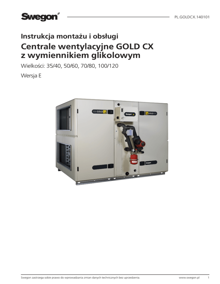PL.GOLDCX.140101 Instrukcja montażu i obsługi Centrale wentylacyjne GOLD CX z wymiennikiem glikolowym Wielkości: 35/40, 50/60, 70/80, 100/120 Wersja E Swegon zastrzega sobie prawo do wprowadzania zmian danych technicznych bez uprzedzenia. www.swegon.pl 1 PL.GOLDCX.140101 Spis treści 1. Informacje ogólne................................................................................... 3 1.1. Zakres zastosowania central GOLD CX ............................................... 3 1.2. Konstrukcja central GOLD CX.............................................................. 3 1.3. Wbudowany układ sterowania............................................................ 3 1.4. Transport central na miejsce budowy................................................... 3 2. Posadowienie i montaż central GOLD CX................................................. 4 2.1. Przygotowanie central do montażu..................................................... 4 2.2. Przestrzeń inspekcyjna......................................................................... 4 2.3. Posadowienie central.......................................................................... 4 2.4. Montaż central w pomieszczeniu......................................................... 6 2.5. Montaż central na zewnątrz................................................................ 6 3. Elementy składowe central...................................................................... 7 4. Wymogi bezpieczeństwa......................................................................... 8 4.1. Wyłącznik bezpieczeństwa (główny).................................................... 8 4.2. Zagrożenia.......................................................................................... 8 4.3. Osłony bezpieczeństwa....................................................................... 8 4.4. Glikol ................................................................................................. 8 5. Uruchomienie centrali............................................................................. 8 5.1. Informacje ogólne............................................................................... 8 5.2. Regulacja sieci kanałów i urządzeń wentylacyjnych.............................. 9 5.2.1. Kolejność regulacji......................................................................... 9 5.2.2. Procedura regulacji......................................................................... 9 6. Panel dotykowy IQnavigator, zarządzalne ekrany................................... 10 6.1. Panel dotykowy IQnavigator.............................................................. 10 6.1.1. Informacje ogólne........................................................................ 10 6.1.2. Jak korzystać z panelu dotykowego.............................................. 11 6.1.3. Przyciski....................................................................................... 12 6.1.4. Opis symboli................................................................................ 12 6.1.5. Klawiatura................................................................................... 12 6.2. Struktura menu................................................................................. 13 6.2.1. Wybór języka............................................................................... 14 6.2.2. Pulpit nawigacyjny....................................................................... 14 7. Dane techniczne .................................................................................. 15 7.1. Wymiary i wagi central...................................................................... 15 7.2. Opis układu sterowania IQlogic ........................................................ 17 7.3. Dane elektryczne ............................................................................. 18 7.3.1. Dane elektryczne GOLD CX ......................................................... 18 7.3.2. Skrzynka układu sterowania......................................................... 18 7.3.3. Błąd pomiaru .............................................................................. 18 7.3.4. Bezpieczniki w skrzynce układu sterowania.................................. 18 8. Informacje dodatkowe ......................................................................... 19 8.1. Deklaracja zgodności ....................................................................... 19 8.2. Dokumentacja ochrony środowiska................................................... 19 8.3. Informacje o serwisie . ...................................................................... 20 8.4. Informacje uzupełniające . ................................................................ 20 2 www.swegon.pl Swegon zastrzega sobie prawo do wprowadzania zmian danych technicznych bez uprzedzenia. PL.GOLDCX.140101 1. Informacje ogólne 1.4 Transport central na miejsce budowy Centrale GOLD CX dostępne są w 3 fizycznych wielkościach i 6 zakresach przepływu powietrza. GOLD CX wielkości 35/40: Centrale GOLD CX o wielkości 35/40 dostarczane są zawsze jako jedna całość. W razie potrzeby centrale można rozmontować na trzy części. Kable elektryczne i sterujące posiadają szybkozłączki, więc rozłączenie i złączenie jest bardzo szybkie i łatwe. W czasie dostawy centrale zabezpieczone są podwójną warstwą foli ochronnej i umieszczone na specjalnie przygotowanej palecie. W wypadku, gdy centrala GOLD CX zawiera sekcję recyrkulacyjną, dostarczana ona jest oddzielnie. Może jednak być dostarczona razem z centralą na wyraźne życzenie klienta. 1.1. Zakres zastosowania central GOLD CX Centrale wentylacyjne GOLD CX są przeznaczone do stosowania w obiektach użyteczności publicznej takich jak: biurowce, hotele, lokale gastronomiczne, szkoły, urzędy, sklepy itp. W celu pełnego wykorzystania wszystkich funkcji oferowanych przez system GOLD CX, należy uwzględnić właściwości ce