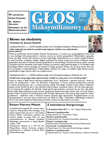 W numerze: DZIEŃ PAPIESKI BŁ. ANIELA SALAWA RÓŻANIEC ZE ŚW. MAKSYMILIANEM 2 PAŹDZIERNIKA 2011 R. • PISMO PARAFII PW. WNIEBOWZIĘCIA NMP W ZDUŃSKIEJ WOLI Słowo na niedzielę rozważa ks. Janusz Kęsicki 2 października 2011 r. — XXVII niedziela zwykła, rok A, Ewangelia według św. Mateusza 21,33–43 „Gdy nadszedł czas zbiorów, posłał swoje sługi do rolników, by odebrali plon Jemu należny” Winnica symbolizuje naród izraelski, Kościół Chrystusowy, a w końcu nas, poszczególnych ludzi. Któż z nas, słuchając dziś przypowieści o winnicy, nie jest po stronie gospodarza? Właścicielem i gospodarzem jest Bóg, winnica jest obrazem narodu wybranego. Dzierżawcami są ci, którzy rządzili Izraelem, a więc królowie, urzędnicy, kapłani. Sługami posłanymi by zebrać owoce są prorocy. Posłanym synem gospodarza jest Jezus Chrystus. Dramat gospodarza to dramat Boga. Dramat winnicy to także i przede wszystkim dramat człowieka. Dziś ludzie uważają, że świetnie radzą sobie bez Boga. A Ty? Radzisz sobie bez Boga? Można wyrzec się Boga, nie wierzyć w Niego, grzeszyć. Można, ale do czasu żniwa. Pan upomni się kiedyś o swoją dzierżawę. Trzeba będzie rozliczyć się z tego, co zrobiłeś z Jego darami, jak gospodarzyłeś w Jego winnicy, jakie ona wydaje owoce… 9 października 2011 r. — XXVIII niedziela zwykła, rok A, Ewangelia według św. Mateusza 22, 1-14 „Posłał więc swoje sługi, żeby zaproszonych zwołali na ucztę, lecz ci nie chcieli przyjść” Uczta to częsty w Biblii obraz wiecznej szczęśliwości. Król - Bóg Jahwe - zaprasza swój lud - Izrael na ucztę, do przebywania z Nim, do zbawienia. Przypowieść o uczcie ukazuje podstawową prawdę o naszym przeznaczeniu, ale i o naszej postawie wobec Pana Boga. Wolimy swoje własne codzienne zajęcia, pracę, handel itd. Już w raju człowiek wybrał własne rozeznanie dobra i zła. Na ucztę zaproszeni są wszyscy bez wyjątku, ale człowiek często gardzi zaproszeniem, wymawia się, nie chce, aby żaden król, żaden Bóg mieszał się w jego sprawy, decydował, dysponował jego czasem. Sam chce być Panem siebie. Gdzie Ty jesteś? W której grupie osób? Zostałeś zaproszony, ochrzczony, Bóg wysyła do Ciebie posłańców - kapłanów, ludzi, w których możesz odczytać Jego zaproszenie. Przygotowaniem do tej najwspanialszej z uczt jest nasze uczestnictwo we Mszy św. Bóg - Gospodarz niebieskiego królestwa chce na tej uczcie zaspokoić każdą naszą potrzebę. Czujmy się zaproszeni na tę ucztę. Święto Patrona Miasta 10 października przypada 29. rocznica kanonizacji św. Maksymiliana Marii Kolbego. Z tej okazji organizowane jest jak co roku Święto Patrona Miasta. Centralnym punktem obchodów będzie uroczysta Msza św. pod przewodnictwem ks. Biskupa Stanisława Gębickiego, sprawowana w naszej Bazylice o godz. 11.00. Uroczystości wpisane są w XVI Dni Św. Maksymiliana, których skrócony program zamieszczamy w bieżącym numerze Głosu Maksymilianowego. Z kalendarza liturgicznego 2-8 października 2011 r. - 67. Tydzień Miłosierdzia Wtorek 4 października Wspomnienie św. Franciszka z Asyżu Środa 5 października Wspomnienie św. Faustyny Kowalskiej, zakonnicy Piątek 7 października Wspomnienie Najświętszej Maryi Panny Różańcowej Czwartek 13 października Wspomnienie św. Honorata Koźmińskiego, kapłana Sobota 15 października Wspomnienie św. Teresy z Avila, dziewicy i Doktora Kościoła Str. 2 Nie zapłacimy abonamentu - bp Wiesław Mering odpowiada prezesowi TVP na list dotyczący Nergala Szanowny Panie Prezesie! W naszym zdecydowaniu i proteście próbowaliśmy prosić o zmianę decyzji dotyczącej obecności Nergala w TVP publicznej. Te prośby są zbywane: grzecznie, ale zbywane. Pan Prezes przypomina, że w 2 Programie są przecież programy religijne: „Ziarno”, „Słowo na niedzielę”, „Między niebem a ziemią”, transmisje modlitwy „Anioł Pański”... To prawda: tym bardziej brzydzi obecność „artysty”, który z wartości prezentowanych w wymienionych audycjach szydzi, pojawiając się na tym samym ekranie! Wychowuje się przecież nie tylko słowem i treścią, lecz także obrazem i przykładem. Nergal nie chce być przykładem DOBRA. A chrześcijanin nie może akceptować wątków, słów i zachowań wątpliwego „autorytetu”. Nie sądzę, by ktoś normalny uważał za „autorytet” człowieka głoszącego przemoc, bluźnierstwo, zło, wychwalającego zbrodnię... Dziś piszę w imieniu wielu, bardzo wielu polskich obywateli, chrześcijan, którym komercja – jaką jest promowanie Nergala – stosowana przez publiczną Telewizję, jest nie tylko niemiła, ale stanowi naruszenie ładu i pokoju społecznego; dla których darcie Biblii i nazywanie jej „gównem” jest hańbą i postępowaniem niedopuszczalnym! Nie tylko zresztą z religijnego punktu widzenia: to zwykłe chamstwo, brak najbardziej prymitywnej kultury i pogarda w stosunku do ludzi wierzących w naszym Kraju. Kiedy powszechnie broni się praw mniejszości – dlaczego nie liczą się głosy wierzącej mniejszości? Otrzymałem dziesiątki tysięcy listów, maili, telefonów; wiem, że przychodzą one także do sekretariatu TVP. Jesteśmy w przededniu wyborów: proszę pamiętać, że Polacy nie są półgłówkami – choć piszą nieraz „z małych miejscowości”, „starsi”, a także z różnym „wykształceniem”. Polskie społeczeństwo umie wyciągać wnioski z tego co widzi, słyszy, czego doświadcza: w telewizji, prasie, na drogach, kolei, w swoich portmonetkach. Nie wiem, czy TVP przysłuża się właściwej formacji dopuszczając „artystę” do głosu i na wizję! Akurat Kościół ogłasza pierwszy w historii Tydzień Wychowania; ponurym żartem 2 Programu jest ta odpowiedź! O ile z edukacją polskie szkoły radzą sobie kiepsko – to co z wychowaniem, czyli przekazem wartości, formowaniem postaw; propagowaniem odpowiedzialno