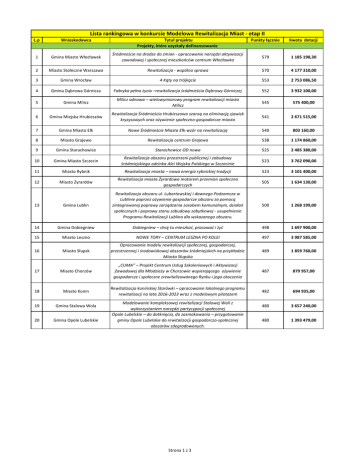 Lista rankingowa w konkursie Modelowa Rewitalizacja Miast - etap II L.p Wnioskodawca 1 Gmina Miasto Włocławek 2 Tytuł projektu Projekty, które uzyskały dofinansowanie Punkty łącznie Kwota dotacji Śródmieście na drodze do zmian - opracowanie narzędzi aktywizacji zawodowej i społecznej mieszkańców centrum Włocławka 579 1 185 198,30 Miasto Stołeczne Warszawa Rewitalizacja - wspólna sprawa 570 4 177 310,00 3 Gmina Wrocław 4 Kąty na trójkącie 553 2 753 086,50 4 Gmina Dąbrowa Górnicza Fabryka pełna życia –rewitalizacja śródmieścia Dąbrowy Górniczej 552 3 932 100,00 5 Gmina Milicz Milicz odnowa – wielowymiarowy program rewitalizacji miasta Milicz 545 575 400,00 6 Gmina Miejska Hrubieszów Rewitalizacja Śródmieścia Hrubieszowa szansą na eliminację zjawisk kryzysowych oraz ożywienie społeczno-gospodarcze miasta 541 2 671 515,00 7 Gmina Miasto Ełk Nowe Śródmieście Miasta Ełk-wzór na rewitalizację 540 803 160,00 8 Miasto Grajewo Rewitalizacja centrum Grajewa 538 1 174 860,00 9 Gmina Starachowice Starachowice OD nowa 525 2 485 380,00 10 Gmina Miasto Szczecin Rewitalizacja obszaru przestrzeni publicznej i zabudowy śródmiejskiego odcinka Alei Wojska Polskiego w Szczecinie 523 3 762 090,00 11 Miasto Rybnik Rewitalizacja miasta – nowa energia rybnickiej tradycji 523 3 101 400,00 Miasto Żyrardów Rewitalizacja miasta Żyrardowa motorem przemian społeczna gospodarczych 505 1 634 130,00 13 Gmina Lublin Rewitalizacja obszaru ul. Lubartowskiej i dawnego Podzamcza w Lublinie poprzez ożywienie gospodarcze obszaru za pomocą zintegrowanej poprawy zarządzania zasobem komunalnym, działań społecznych i poprawy stanu zabudowy zabytkowej - uzupełnienie Programu Rewitalizacji Lublina dla wskazanego obszaru. 500 1 268 199,00 14 Gmina Dobiegniew Dobiegniew – chcę tu mieszkać, pracować i żyć 498 1 697 900,00 15 Miasto Leszno NOWE TORY – CENTRUM LESZNA PO KOLEI 497 3 987 585,00 16 Miasto Słupsk Opracowanie modelu rewitalizacji społecznej, gospodarczej, przestrzennej i środowiskowej obszarów śródmiejskich na przykładzie Miasta Słupska 489 1 859 760,00 17 Miasto Chorzów „CUMA” – Projekt Centrum Usług Szkoleniowych i Aktywizacji Zawodowej dla Młodzieży w Chorzowie wspierającego ożywienie gospodarcze i społeczne zrewitalizowanego Rynku i jego otoczenia 487 879 957,00 18 Miasto Konin Rewitalizacja konińskiej Starówki – opracowanie lokalnego programu rewitalizacji na lata 2016-2023 wraz z modelowym pilotażem 482 694 935,00 19 Gmina Stalowa Wola 480 3 657 240,00 20 Gmina Opole Lubelskie 480 1 393 479,00 12 Modelowanie kompleksowej rewitalizacji Stalowej Woli z wykorzystaniem narzędzi partycypacji społecznej Opole Lubelskie – do dotknięcia, do zasmakowania – przygotowanie gminy Opole Lubelskie do rewitalizacji gospodarczo-społecznej obszarów zdegradowanych. Strona 1 z 3 Projekty, które nie uzyskały dofinansowania Tytuł projektu Bydgoszcz – rzeka możliwości. Opracowanie programu rewitalizacji Bydgoszczy wraz z wykorzystaniem potencjału społecznogospodarczego terenów nadrzecznych Opracowanie programu rewitalizacji dla Miasta Ostrowa Wielkopolskiego L.p Wnioskodawca 21 Miasto Bydgoszcz 22 Miasto Ostrów Wlkp. 23 Miasto Gorzów Wlkp. „SERCE BIJE! Program społeczno-gospodarczego ożywienia centrum miasta w ramach Programu Rewitalizacji Gorzowa Wielkopolskiego” 472 24 Gmina Miejska Ostróda Wypracowanie modelu rewitalizacji dla miasta Ostródy 462 25 Gmina Miejska Kraków 26 Miasto Pabianice 27 Gmina Biała Rawska Rewitalizacja historycznego centrum Miasta Biała Rawska 450 28 Miasto Radom Model ożywienia gospodarczego Miasta Kazimierzowskiego wraz z otoczeniem 448 29 Miasto Góra Kalwaria Rewitalizacja zabytkowego zespołu urbanistyczno-budowlanego Góry Kalwarii – miasta świętego w historii chrześcijan i żydów 446 30 Miasto Puławy Aktywność, innowacyjność, partycypacja – wspólnie zmieniamy Puławy 445 31 Gmina Nowa Sól - Miasto OŻYWIENIE GOSPODARCZE I ZWIĘKSZENIE ATRAKCYJNOŚCI INWESTYCYJNEJ UTWORZENIE CENTRUM AKTYWNOŚCI SPOŁECZNEJ (CAS)„ODRA” BĘDĄCEGO PLATFORMĄ STAŁEJ WSPÓŁPRACY I KOMUNIKACJI MIASTA Z INSTYTUCJAMI RYNKU PRACY, OTOCZENIA BIZNESU, PLACÓWEK OPIEKI SPOŁECZNEJ I ORGANIZACJI POZARZĄDOWYCH W CELU PRZECIWDZIAŁANIA ZJAWISKOM BEZROBOCIA I JEGO EFEKTOM NA OBSZARZE REWITALIZACJI 443 32 Miasto i Gmina Piwniczna Zdrój Piwniczna Zdrój - miasto warte powrotów i godne dobrej przyszłości 424 33 Miasto Kalisz Kalisz - miasto dobrej atmosfery 423 34 Miasto Kędzierzyn- Koźle Rewitalizujemy chemiczną twierdzę. Opracowanie i wdrożenie modelowego systemu finansowania i organizacji społeczno-przestrzennej integracji Kędzierzyna-Koźla. 418 35 Gmina Miasto Sierpc Rewitalizacja Miasta Sierpca dla stworzenia dobrych praktyk rewitalizacji małych miast - model rewitalizacji miast o trudnych uwarunkowaniach demograficznych 417 36 Miasto Zamość Zamojska Akademia Rewitalizacji 417 37 Miasto i Gmina Pleszew Modelowa rewitalizacja miasta Pleszewa 412 38 Gmina Wadowice Miasto Równych Możliwości – modelowy projekt rewitalizacji miasta Wadowice 408 39 Gmina Piaski Model rewitalizacji miast w oparciu o zasoby endogenne 407 40 Gmina Miasto Biłgoraj Zielony Biłgoraj - miasto przywrócone mieszkańcom 401 41 Gmina Jawor Jawor – dziedzictwo kulturowe i walory przyrodnicze platformą współpracy, integracji i komunikacji z mieszkańcami obszaru rewitalizacji 391 42 Miasto Radymno Rewitalizacja Miasta Radymna poprzez działania aktywizujące mieszkańców, zmniejszające bezrobocie oraz poprzez zbudowanie spójności przestrzennej pomiędzy Rynkiem a zalewem ZEK 390 43 Miasto Ryki Kompleksowa rewitalizacja centrum miasta Ryki 381 44 Miasto Łańcut Rewitalizacja Śródmieścia Łańcuta przykładem rozwiązywania problemów społecznych poprzez wykorzystanie potencjału kulturowego miasta zabytkowego 381 45 Gmina Żagań W słabości siła – stare centrum po nowemu 376 46 Gmina Za