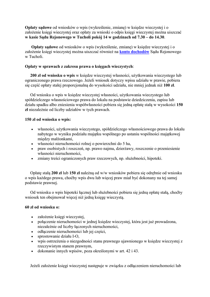 Opłaty sądowe od wniosków o wpis (wykreślenie, zmianę) w księdze wieczystej i o założenie księgi wieczystej oraz opłaty za wnioski o odpis księgi wieczystej można uiszczać w kasie Sądu Rejonowego w Tucholi pokój 14 w godzinach od 7.30 – do 14.30. Opłaty sądowe od wniosków o wpis (wykreślenie, zmianę) w księdze wieczystej i o założenie księgi wieczystej można uiszczać również na konto dochodów Sądu Rejonowego w Tucholi. Opłaty w sprawach z zakresu prawa o księgach wieczystych: 200 zł od wniosku o wpis w księdze wieczystej własności, użytkowania wieczystego lub ograniczonego prawa rzeczowego. Jeżeli wniosek dotyczy wpisu udziału w prawie, pobiera się część opłaty stałej proporcjonalną do wysokości udziału, nie mniej jednak niż 100 zł. Od wniosku o wpis w księdze wieczystej własności, użytkowania wieczystego lub spółdzielczego własnościowego prawa do lokalu na podstawie dziedziczenia, zapisu lub działu spadku albo zniesienia współwłasności pobiera się jedną opłatę stałą w wysokości 150 zł niezależnie od liczby udziałów w tych prawach. 150 zł od wniosku o wpis: własności, użytkowania wieczystego, spółdzielczego własnościowego prawa do lokalu nabytego w wyniku podziału majątku wspólnego po ustaniu wspólności majątkowej między małżonkami, własności nieruchomości rolnej o powierzchni do 5 ha, praw osobistych i roszczeń, np. prawo najmu, dzierżawy, roszczenie o przeniesienie własności nieruchomości, zmiany treści ograniczonych praw rzeczowych, np. służebności, hipoteki. Opłatę stałą 200 zł lub 150 zł należną od w/w wniosków pobiera się odrębnie od wniosku o wpis każdego prawa, choćby wpis dwu lub więcej praw miał być dokonany na tej samej podstawie prawnej. Od wniosku o wpis hipoteki łącznej lub służebności pobiera się jedną opłatę stałą, choćby wniosek ten obejmował więcej niż jedną księgę wieczystą. 60 zł od wniosku o: założenie księgi wieczystej, połączenie nieruchomości w jednej księdze wieczystej, która jest już prowadzona, niezależnie od liczby łączonych nieruchomości, odłączenie nieruchomości lub jej części, sprostowanie działu I-O, wpis ostrzeżenia o niezgodności stanu prawnego ujawnionego w księdze wieczystej z rzeczywistym stanem prawnym, dokonanie innych wpisów, poza określonymi w art. 42 i 43. Jeżeli założenie księgi wieczystej następuje w związku z odłączeniem nieruchomości lub jej części z istniejącej księgi wieczystej, pobiera się tylko jedną opłatę w kwocie 60 zł. Opłatę stałą w kwocie 60 zł, należną od w/w wniosków, pobiera się niezależnie od opłaty za dokonanie wpisu własności, użytkowania wieczystego lub spółdzielczego własnościowego prawa do lokalu. Od wniosku o wykreślenie wpisu pobiera się połowę opłaty należnej od wniosku o wpis.