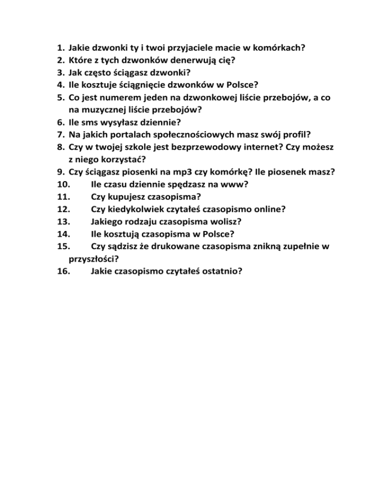 1. 2. 3. 4. 5. Jakie dzwonki ty i twoi przyjaciele macie w komórkach? Które z tych dzwonków denerwują cię? Jak często ściągasz dzwonki? Ile kosztuje ściągnięcie dzwonków w Polsce? Co jest numerem jeden na dzwonkowej liście przebojów, a co na muzycznej liście przebojów? 6. Ile sms wysyłasz dziennie? 7. Na jakich portalach społecznościowych masz swój profil? 8. Czy w twojej szkole jest bezprzewodowy internet? Czy możesz z niego korzystać? 9. Czy ściągasz piosenki na mp3 czy komórkę? Ile piosenek masz? 10. Ile czasu dziennie spędzasz na www? 11. Czy kupujesz czasopisma? 12. Czy kiedykolwiek czytałeś czasopismo online? 13. Jakiego rodzaju czasopisma wolisz? 14. Ile kosztują czasopisma w Polsce? 15. Czy sądzisz że drukowane czasopisma znikną zupełnie w przyszłości? 16. Jakie czasopismo czytałeś ostatnio?
