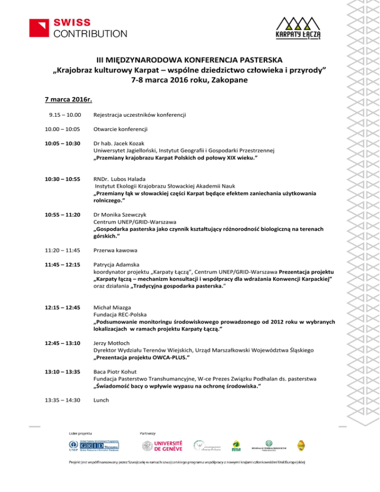 III MIĘDZYNARODOWA KONFERENCJA PASTERSKA „Krajobraz kulturowy Karpat – wspólne dziedzictwo człowieka i przyrody” 7-8 marca 2016 roku, Zakopane 7 marca 2016r. 9.15 – 10.00 Rejestracja uczestników konferencji 10.00 – 10:05 Otwarcie konferencji 10:05 – 10:30 Dr hab. Jacek Kozak Uniwersytet Jagielloński, Instytut Geografii i Gospodarki Przestrzennej „Przemiany krajobrazu Karpat Polskich od połowy XIX wieku.” 10:30 – 10:55 RNDr. Lubos Halada Instytut Ekologii Krajobrazu Słowackiej Akademii Nauk „Przemiany łąk w słowackiej części Karpat będące efektem zaniechania użytkowania rolniczego.” 10:55 – 11:20 Dr Monika Szewczyk Centrum UNEP/GRID-Warszawa „Gospodarka pasterska jako czynnik kształtujący różnorodność biologiczną na terenach górskich.” 11:20 – 11:45 Przerwa kawowa 11:45 – 12:15 Patrycja Adamska koordynator projektu „Karpaty Łączą”, Centrum UNEP/GRID-Warszawa Prezentacja projektu „Karpaty łączą – mechanizm konsultacji i współpracy dla wdrażania Konwencji Karpackiej” oraz działania „Tradycyjna gospodarka pasterska.” 12:15 – 12:45 Michał Miazga Fundacja REC-Polska „Podsumowanie monitoringu środowiskowego prowadzonego od 2012 roku w wybranych lokalizacjach w ramach projektu Karpaty Łączą.” 12:45 – 13:10 Jerzy Motłoch Dyrektor Wydziału Terenów Wiejskich, Urząd Marszałkowski Województwa Śląskiego „Prezentacja projektu OWCA-PLUS.” 13:10 – 13:35 Baca Piotr Kohut Fundacja Pasterstwo Transhumancyjne, W-ce Prezes Związku Podhalan ds. pasterstwa „Świadomość bacy o wpływie wypasu na ochronę środowiska.” 13:35 – 14:30 Lunch 14:30 – 14:55 Franciszek Bachleda- Księdzularz Regionalista „Ochrona swojszczyzny kiedyś i dzisiaj." 14:45 – 15:10 Tatrzański Park Narodowy (do potwierdzenia) Prezentacja na temat wypasu owiec na terenach Tatrzańskiego Parku Narodowego. 15:10 – 16:30 Wystąpienia gości (głos w dyskusji) Podsumowanie pierwszego dnia Konferencji 19:30 Uroczysta kolacja Kolację swoim występem uświetni Lubomír Tatarka - mistrz cechu słowackich dudziarzy, hodowca owiec, od lat interesujący się pasterską, wołoską kulturą Europy. Podczas kolacji będzie można obejrzeć wystawę pasterskich naczyń, czerpaków, kosturów, lasek, wiader oraz instrumenty pasterskie między innymi: piszczałkę pasterską, flet pasterski, fujarę, dudy słowackie, dudy-Multanki, drumle. 8 marca 2016r. 9.30 – 11:30 Panel przygotowany prze Karpacką Radę Naukową. Podczas panelu zostaną przedstawione krótkie prezentacje doktorantów i młodych naukowców. 11:30 – 12:00 Przerwa kawowa 12:00 – 13:00 PANEL 1 – Rozwój gospodarki pasterskiej w Karpatach - szanse, wyzwania, zagrożenia. Moderatorzy: Andrzej Gąsienica-Makowski – Doradca Marszałka Województwa Małopolskiego ds. Karpat Józef Michałek – Związek Podhalan, Oddział Górali Śląskich 13:00 – 14:00 PANEL 2 – Pasterstwo w krajobrazie Karpat - kształtowanie krajobrazu kulturowego i ochrona zasobów przyrodniczych i kulturowych Karpat. Moderatorzy: Monika Rusztecka – Centrum UNEP/GRID-Warszawa Michał Miazga – Fundacja REC-Polska 14:00 – 15:00 Podsumowanie konferencji 15:00 – 16:00 Obiad
