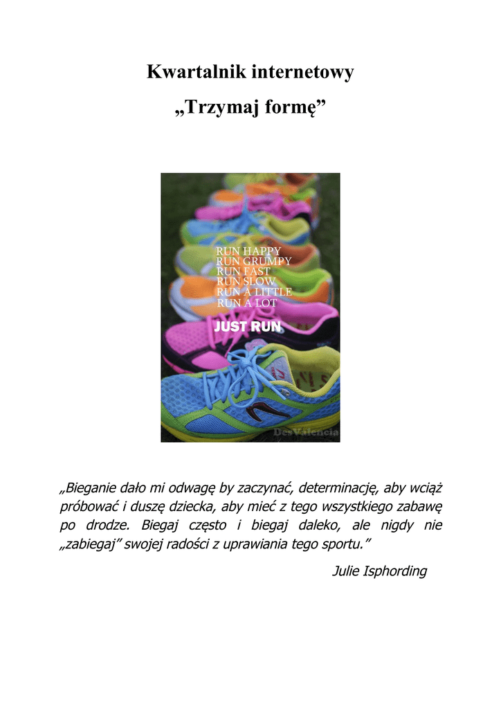 Kwartalnik internetowy „Trzymaj formę” „Bieganie dało mi odwagę by zaczynać, determinację, aby wciąż próbować i duszę dziecka, aby mieć z tego wszystkiego zabawę po drodze. Biegaj często i biegaj daleko, ale nigdy nie „zabiegaj” swojej radości z uprawiania tego sportu.” Julie Isphording Co ma piernik do wiatraka, czyli co ma but do biegania? Niektórzy twierdzą, że specjalne obuwie do różnych dziedzin sportu to tylko zbędna fanaberia. Jednak but niedobrany odpowiednio do naszej sportowej pasji może spowodować liczne kontuzje, zaburzyć naturalną mechanikę ruchu i ogółem sprawić wiele szkód. But biegowy ma podeszwę, która jest giętka w odpowiednim miejscu i sztywna w innym, co pozwala na prawidłową pracę stopy w czasie biegu. Podeszwa ułatwia odbicie, zabezpiecza przed poślizgami i jest trwalsza niż w butach innego typu. Odpowiednio zbudowana jest też cholewka buta. But biegowy jest po prostu projektowany z myślą o biegaczu i podobnie jak luksusowa limuzyna nie sprawdzi się w warunkach terenowych, tak nawet najdroższy but przeznaczony do innej aktywności nie dorówna butowi przeznaczonemu typowo do biegu. Podział butów biegowych Buty startowe Buty biegowe występują w kilku odmianach. Po pierwsze, istnieją buty startowe i buty treningowe. Te pierwsze służą do uzyskania jak najlepszego czasu w trakcie wyścigu, dlatego są lekkie, szybkie, ale mało trwałe i mniej bezpieczne dla przeciętnego biegacza. Startówki mają zwykle cieniutką podeszwę, która szybko się ściera, nie amortyzuje dobrze nóg i nie chroni przed nierównościami terenu. Stworzono również modele pośrednie, tzw. treningowo-startowe. Jest to pewien kompromis - lżejsze i szybsze niż treningówki, ale bezpieczniejsze i trwalsze niż startówki. Przydadzą się dla tych, którzy na treningu lubią biegać szybko lub nie lubią butów ciężkich, zabudowanych, sztywnych. Buty treningowe Buty treningowe występują w wielu odmianach. Istnieją buty terenowe, zwane też trailowymi. To sprzęt dla tych, którzy biegają w trudnym terenie, w błocie, śniegu, wodzie, po kamieniach. Zwykle są twardsze, cięższe niż przeciętne biegówki, często z nieprzemakalnego materiału. Buty terenowe potrafią być bardzo użyteczne, przede wszystkim dlatego, że zapewniają bardzo dobrą przyczepność oraz komfort termiczny. Buty do "naturalnego" biegania Buty dobrane do rodzaju stopy zabezpieczają w wielu przypadkach przed kontuzją, ale nie zawsze. Znowu skomplikuję całą sprawę: otóż część specjalistów po wieloletnich badaniach doszła do wniosku, że najlepszym modelem buta jest... goła stopa. Powstał więc cały szereg butów, które co prawda zabezpieczają przed nierównościami podłoża i amortyzują uderzenia nóg o ziemię, ale równocześnie pozwalają stopie ruszać się w sposób jak najbardziej zbliżony do naturalnego. ZALETY BIEGANIA Biegaczy z roku na rok jest coraz więcej, co cieszy. Ludzie są coraz bardziej świadomi potrzeby dbania o swoje ciało i zdrowie. Niestety wielu jest też biegaczy z tzw. potrzeby chwili, czyli biegający za autobusami, biegający przez ulicę, biegający do szkoły czy też na uczelnię. Niestety tego typu biegacze powinni zmienić czas, miejsce, a przede wszystkim okoliczności swojego biegania i zająć się tym na poważnie. Bieganie przyczynia się do zwiększenia objętości i pojemności serca, zwiększenia gęstości naczyń kapilarnych w mięśniach, zwiększenia ilości mitochondriów – magazynów energii w organizmie, zwiększenia objętości krwi, nasycenia krwi tlenem, zwiększenia wydolności fizycznej, a także do przyspieszenia metabolizmu, uelastycznienia ścian tętnic, wzmocnienia systemu immunologicznego, hamowania wypłukiwania soli mineralnych z kości oraz obniżenia częstości skurczów serca, obniżenia ciśnienia skurczowego i rozkurczowego, obniżenia stężenia cholesterolu frakcji LDL i stężenia trójglicerydów. Dokładniejsze zalety opisane są poniżej: 1. Chrząstka rośnie! Nie słuchaj „narzekaczy” – bieganie nie zniszczy Twoich kolan. Prawdopodobnie jest wręcz przeciwnie: badania naukowców z Australia’s Monach University sugerują, że bieganie może być impulsem do wzrostu chrząstki. To zaś chroni Cię przed zapaleniem stawów. 2. Wyostrza słuch Badacze z Bellarmine University odkryli, że kobiety dbające o swoją formę miały o 6 procent lepszy słuch niż ich mniej wysportowane koleżanki. Aktywność fizyczna usprawnia krążenie w uchu, co zapewnia lepszy dopływ substancji odżywczych wspomagających słyszenie. 3. Chroni skórę Według naukowców z Rutgers University, myszy, które piły wodę z kofeiną, a następnie biegały, miały mniejszą ilość guzków nowotworowych na skórze niż gryzonie, które dostały tylko wodę z kofeiną lub tylko biegały. Kofeina i ćwiczenia to sposób na mniejszą ilość rozwijających się chorych komórek. 4. Zapomnij o migrenie Odłóż środki przeciwbólowe i idź pobiegać. Badania przeprowadzone na Uniwersytecie w Goeteborgu pokazują, że osoby cierpiące na migrenę doświadczały o wiele mniej bólów głowy, gdy biegały 40 minut trzy razy w tygodniu przez trzy miesiące. 5. Regeneruje mięśnie Masa mięśniowa zmniejsza się z wiekiem – czy aby na pewno? Naukowcy z University of Illinois odkryli, że bieganie aktywuje rodzaj komórek macierzystych, które biorą udział w procesie tworzenia mięśni. Fakt ten może być kluczem do zapobiegania utracie mięśni z wiekiem. 6. Łagodzi stres Czujesz nerwy przed ważnym spotkaniem biznesowym? Idź pobiegać. Naukowcy z Southern Methodist University twierdzą, że ludzie reagują na stres łagodniej, gdy uprawiają regularnie intensywne ćwiczenia aerobowe. 7. Zapobiega nowotworom Fińscy badacze poddali badaniom 2560 mężczyzn w średnim wieku przez ponad 17 lat i odkryli, że ci najbardziej aktywni fizycznie byli najmniej narażeni na śmier