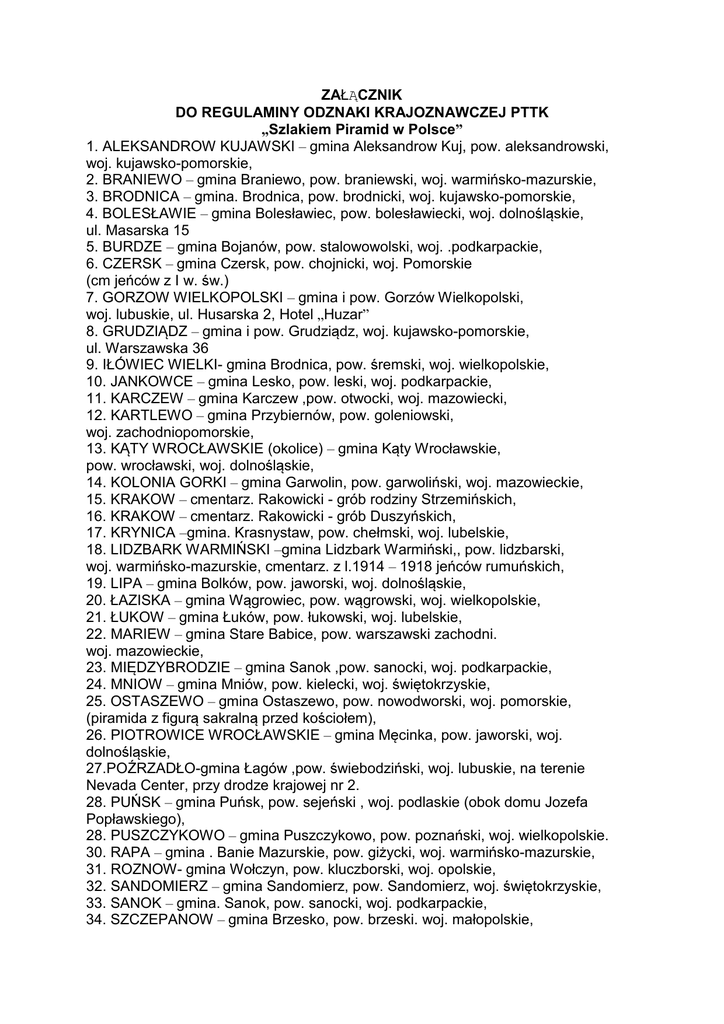 ZAŁĄCZNIK DO REGULAMINY ODZNAKI KRAJOZNAWCZEJ PTTK „Szlakiem Piramid w Polsce” 1. ALEKSANDROW KUJAWSKI – gmina Aleksandrow Kuj, pow. aleksandrowski, woj. kujawsko-pomorskie, 2. BRANIEWO – gmina Braniewo, pow. braniewski, woj. warmińsko-mazurskie, 3. BRODNICA – gmina. Brodnica, pow. brodnicki, woj. kujawsko-pomorskie, 4. BOLESŁAWIE – gmina Bolesławiec, pow. bolesławiecki, woj. dolnośląskie, ul. Masarska 15 5. BURDZE – gmina Bojanów, pow. stalowowolski, woj. .podkarpackie, 6. CZERSK – gmina Czersk, pow. chojnicki, woj. Pomorskie (cm jeńców z I w. św.) 7. GORZOW WIELKOPOLSKI – gmina i pow. Gorzów Wielkopolski, woj. lubuskie, ul. Husarska 2, Hotel „Huzar” 8. GRUDZIĄDZ – gmina i pow. Grudziądz, woj. kujawsko-pomorskie, ul. Warszawska 36 9. IŁÓWIEC WIELKI- gmina Brodnica, pow. śremski, woj. wielkopolskie, 10. JANKOWCE – gmina Lesko, pow. leski, woj. podkarpackie, 11. KARCZEW – gmina Karczew ,pow. otwocki, woj. mazowiecki, 12. KARTLEWO – gmina Przybiernów, pow. goleniowski, woj. zachodniopomorskie, 13. KĄTY WROCŁAWSKIE (okolice) – gmina Kąty Wrocławskie, pow. wrocławski, woj. dolnośląskie, 14. KOLONIA GORKI – gmina Garwolin, pow. garwoliński, woj. mazowieckie, 15. KRAKOW – cmentarz. Rakowicki - grób rodziny Strzemińskich, 16. KRAKOW – cmentarz. Rakowicki - grób Duszyńskich, 17. KRYNICA –gmina. Krasnystaw, pow. chełmski, woj. lubelskie, 18. LIDZBARK WARMIŃSKI –gmina Lidzbark Warmiński,, pow. lidzbarski, woj. warmińsko-mazurskie, cmentarz. z l.1914 – 1918 jeńców rumuńskich, 19. LIPA – gmina Bolków, pow. jaworski, woj. dolnośląskie, 20. ŁAZISKA – gmina Wągrowiec, pow. wągrowski, woj. wielkopolskie, 21. ŁUKOW – gmina Łuków, pow. łukowski, woj. lubelskie, 22. MARIEW – gmina Stare Babice, pow. warszawski zachodni. woj. mazowieckie, 23. MIĘDZYBRODZIE – gmina Sanok ,pow. sanocki, woj. podkarpackie, 24. MNIOW – gmina Mniów, pow. kielecki, woj. świętokrzyskie, 25. OSTASZEWO – gmina Ostaszewo, pow. nowodworski, woj. pomorskie, (piramida z figurą sakralną przed kościołem), 26. PIOTROWICE WROCŁAWSKIE – gmina Męcinka, pow. jaworski, woj. dolnośląskie, 27.POŹRZADŁO-gmina Łagów ,pow. świebodziński, woj. lubuskie, na terenie Nevada Center, przy drodze krajowej nr 2. 28. PUŃSK – gmina Puńsk, pow. sejeński , woj. podlaskie (obok domu Jozefa Popławskiego), 28. PUSZCZYKOWO – gmina Puszczykowo, pow. poznański, woj. wielkopolskie. 30. RAPA – gmina . Banie Mazurskie, pow. giżycki, woj. warmińsko-mazurskie, 31. ROZNOW- gmina Wołczyn, pow. kluczborski, woj. opolskie, 32. SANDOMIERZ – gmina Sandomierz, pow. Sandomierz, woj. świętokrzyskie, 33. SANOK – gmina. Sanok, pow. sanocki, woj. podkarpackie, 34. SZCZEPANOW – gmina Brzesko, pow. brzeski. woj. małopolskie, 35. TYCHY – Hotel Piramida, 36. USTROŃ- gmina Ustroń, pow. cieszyński, woj. śląskie, Hotele piramidy, 37. USTRONIE - ZAWODZIE – gmina Kłodzko, pow. kłodzki, woj. dolnośląskie (Dom Rosomak), 38. WARSZAWA – ul. Dźwigowa, na Woli, (Centrum Finansowe), 39. WĘGLINIEC – pow. zgorzelecki, woj. dolnośląskie, Park Miejski, 40. WROCŁAW – ogródek domowy na Zaciszu, śp. dr J. Baczewskiego, 41. ZAGORZANY – gmina Gorlice, pow. gorlicki, woj. podkarpackie.
