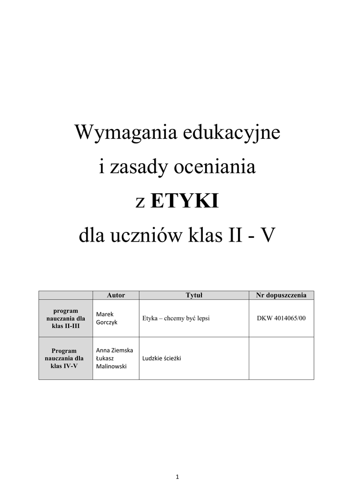 Wymagania edukacyjne i zasady oceniania z ETYKI dla uczniów klas II - V Tytuł Autor program nauczania dla klas II-III Marek Gorczyk Etyka – chcemy być lepsi Program nauczania dla klas IV-V Anna Ziemska Łukasz Malinowski Ludzkie ścieżki 1 Nr dopuszczenia DKW 4014065/00 ZASADY OCENIANIA Co podlega ocenie: ● aktywne uczestniczenie w lekcji, ● wypowiedzi ustne, ● prowadzenie zeszytu, ● prace domowe, ● sprawdziany, ● prace dodatkowe. Jak poprawić ocenę semestralną/roczną? Uczeń musi uzupełnić zaległe prace, zaliczyć sprawdziany lub poprosić o wyznaczenie prac dodatkowych i odrobić je w terminie ustalonym przez nauczyciela. 2 WYMAGANIA EDUKACYJNE bardzo dobry celujący Skala ocen Kryteria oceniania wiedzy i umiejętności wzorowe prowadzenie zeszytu, aktywny udział we wszystkich lekcjach, posługiwanie się ze zrozumieniem elementarnymi pojęciami z zakresu etyki, systematyczne przygotowanie do lekcji, odrobione prace domowe, podejmowanie zadań dodatkowych, zaliczone sprawdziany na ocenę celującą. wzorowe prowadzenie zeszytu, czynny udział w lekcjach, systematyczne przygotowanie do lekcji, posługiwanie się ze zrozumieniem elementarnymi pojęciami z zakresu etyki, odrobione prace domowe. 3 etyka klasy II - V dopuszczający dostateczny dobry WYMAGANIA EDUKACYJNE dobrze prowadzony zeszyt, systematyczne przygotowanie do lekcji, częsty udział w dyskusjach, rozumienie elementarnych pojęć z zakresu etyki, odrobione prace domowe. rozumienie omawianych zagadnień, sporadyczny udział w dyskusjach, prowadzenie zeszytu, bierny udział w lekcjach, prowadzenie zeszytu. 4 etyka klasy II - V niedostateczny WYMAGANIA EDUKACYJNE niespełnienie warunków na ocenę dopuszczającą. 5 etyka klasy II - V