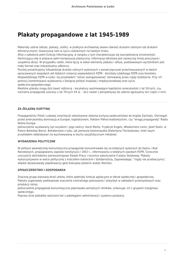 Archiwum Państwowe w Łodzi Plakaty propagandowe z lat 1945-1989 Materiały ulotne (afisze, plakaty, ulotki), w praktyce archiwalnej zwane również drukami ulotnymi lub drukami efemerycznymi, towarzyszą nam w życiu codziennym na każdym kroku. Afisz z założenia pełni funkcję informacyjną, w związku z tym charakteryzuje się oszczędnością ornamentyki. Dominującą rolę w plakacie pełni kompozycja plastyczna, informacja tekstowa jest zazwyczaj mniej precyzyjna i uzupełnia obraz. W przypadku ulotki, która łączy w sobie elementy plakatu i afisza, podstawowym wyróżnikiem jest mały format oraz indywidualny odbiorca. Poniżej prezentujemy kilkadziesiąt druków ulotnych wybranych z ponad pięciuset przechowywanych w dwóch opracowanych zespołach akt łódzkich instancji wojewódzkich PZPR - Komitetu Łódzkiego PZPR oraz Komitetu Wojewódzkiego PZPR w Łodzi. Są przykładem "sztuki zaangażowanej" sterowanej przez rządy totalitarne. Przy ich pomocy komentowano wydarzenia z bieżącej polityki krajowej i międzynarodowej oraz życia społeczno-gospodarczego. Niektóre plakaty mogą dziś bawić odbiorcę - karykatury wyśmiewające kapitalizm amerykański z lat 50-tych, czy nachalna propaganda sukcesu z lat 70-tych XX w. - lecz nawet z perspektywy lat uderza agresywny ton części z nich. ZA ŻELAZNĄ KURTYNĄ Propagandziści Polski Ludowej zniechęcali odizolowane żelazną kurtyną społeczeństwo do krajów Zachodu. Ostrzegali przed amerykańską dominacją w Europie, kapitalizmem, Paktem Północnoatlantyckim, czy "wrogą propagandą" Radia Wolna Europa. Jednocześnie wysławiany był socjalizm i jego twórcy: Karol Marks, Fryderyk Engels, Włodzimierz Lenin, Józef Stalin, w Polsce Bolesław Bierut. Bohaterowie z ludu, jak pierwsza kosmonautka Walentyna Tierieszkowa, mieli swym przykładem oddziaływać na wychowywaną w duchu socjalistycznym młodzież. WYDARZENIA POLITYCZNE W polityce wewnętrznej komunistyczna propaganda koncentrowała się na kolejnych wyborach do Sejmu i Rad Narodowych, propagowaniu zapisów konstytucji z 1952 r., informowaniu o kolejnych zjazdach PZPR. Corocznie uroczyście obchodzono pierwszomajowe Święto Pracy i rocznice zakończenia II wojny światowej. Plakaty wykorzystywano w walce politycznej z kościołem katolickim i Solidarnością. Zapowiadając: "nigdy nie przebaczymy", władze dezawuowały pojednawczy gest biskupów polskich wobec Niemiec. SPOŁECZEŃSTWO I GOSPODARKA Znaczną grupę stanowią druki ulotne, które spełniały funkcje agitacyjne w sferze społecznej i gospodarczej. Plakaty sugerowały podstawowe znaczenie centralnego planowania i statystyk w zakładach przemysłowych oraz produkcji rolnej. Jednocześnie propaganda komunistyczna piętnowała zamożnych rolników, zrównując ich z grupami marginesu społecznego. Poprzez druk plakatów walczono też z patologiami administracji i systemu produkcji. 1
