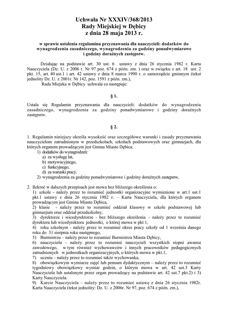 Uchwała Nr XXXIV/368/2013 Rady Miejskiej w Dębicy z dnia 28 maja 2013 r. w sprawie ustalenia regulaminu przyznawania dla nauczycieli: dodatków do wynagrodzenia zasadniczego, wynagrodzenia za godziny ponadwymiarowe i godziny doraźnych zastępstw. Działając na podstawie art. 30 ust. 6 ustawy z dnia 26 stycznia 1982 r. Karta Nauczyciela (Dz. U. z 2006 r. Nr 97 poz. 674 z późn. zm. ) oraz w związku z art. 18 ust. 2 pkt. 15, art. 40 ust.1 i art. 42 ustawy z dnia 8 marca 1990 r. o samorządzie gminnym (tekst jednolity Dz. U. z 2001r. Nr 142, poz. 1591 z późn. zm.), Rada Miejska w Dębicy uchwala co następuje: § 1. Ustala się Regulamin przyznawania dla nauczycieli: dodatków do wynagrodzenia zasadniczego, wynagrodzenia za godziny ponadwymiarowe i godziny doraźnych zastępstw. § 2. 1. Regulamin niniejszy określa wysokość oraz szczegółowe warunki i zasady przyznawania nauczycielom zatrudnionym w przedszkolach, szkołach podstawowych oraz gimnazjach, dla których organem prowadzącym jest Gmina Miasto Dębica: 1) dodatków do wynagrodzeń: a) za wysługę lat, b) motywacyjnego, c) funkcyjnego, d) za warunki pracy. 2) wynagrodzenia za godziny ponadwymiarowe i godziny doraźnych zastępstw, 2. Ilekroć w dalszych przepisach jest mowa bez bliższego określenia o: 1) szkole - należy przez to rozumieć jednostki organizacyjne wymienione w art.1 ust.1 pkt.1 ustawy z dnia 26 stycznia 1982 r. – Karta Nauczyciela, dla których organem prowadzącym jest Gmina Miasto Dębica, 2) klasie - należy przez to rozumieć oddział klasowy w szkole podstawowej lub gimnazjum oraz oddział przedszkolny, 3) dyrektorze i wicedyrektorze - bez bliższego określenia – należy przez to rozumieć dyrektora lub wicedyrektora jednostki, o której mowa w pkt 1, 4) roku szkolnym - należy przez to rozumieć okres pracy szkoły od 1 września danego roku do 31 sierpnia roku następnego, 5) Burmistrzu – należy przez to rozumieć Burmistrza Miasta Dębicy, 6) nauczycielu - należy przez to rozumieć nauczycieli wszystkich stopni awansu zawodowego, w tym również wychowawców i innych pracowników pedagogicznych zatrudnionych w jednostkach organizacyjnych, o których mowa w pkt.1, 7) uczniu – należy przez to rozumieć także wychowanka, 8) obowiązkowym wymiarze zajęć lub pensum dydaktycznym – należy przez to rozumieć tygodniowy obowiązkowy wymiar godzin, o którym mowa w art. 42 ust.3 Karty Nauczyciela lub ustalonym przez organ prowadzący na podstawie art. 42 ust.7 pkt.2) i 3) Karty Nauczyciela. 9) Karcie Nauczyciela – należy przez to rozumieć ustawę z dnia 26 stycznia 1982r. Karta Nauczyciela (tekst jednolity: Dz. U. z 2006r. Nr 97, poz. 674 z późn. zm.), 10) rozporządzeniu – należy przez to rozumieć rozporządzenie Ministra Edukacji Narodowej i Sportu z dnia 31 stycznia 2005r. w sprawie wysokości minimalnych stawek wynagrodzenia zasadniczego nauczycieli, ogólnych warunków przyznawania dodatków do wynagradzania zasadniczego oraz wynagradzania za pracę w dniu wolnym od pracy (Dz.U. z 2005 r., nr 22, poz.181, Dz.U. z 2006r. nr 43, poz. 293, Dz.U. z 2007 r. nr 56 poz. 372). 11) kwocie bazowej - należy przez to rozumieć kwotę bazową dla nauczycieli okreslaną corocznie w ustawie budżetowej na dany rok. 12) dodatku za wychowawstwo należy przez to rozumieć dodatek funkcyjny przyznawany dla nauczycieli szkół podstawowych i gimnazjów, którym powierzono wychowawstwo klasy oraz nauczycieli przedszkoli realizujących zadania opiekuńczowychowawcze w wymiarze co najmniej 0,5 etatu. 3. Tabelę zaszeregowania oraz minimalne stawki wynagrodzenia zasadniczego dla nauczycieli, a także sposób dokumentowania prawa do określonej stawki wynagrodzenia zasadniczego określa rozporządzenie. 4. Wysokość, warunki oraz zasady wypłacania nauczycielom: 1) dodatkowego wynagrodzenia za pracę w porze nocnej, 2) nagród jubileuszowych, 3) dodatkowego wynagrodzenia rocznego, 4) zasiłku na zagospodarowanie, 5) odpraw z tytułu rozwiązania stosunku pracy, 6) odpraw z tytułu przejścia na emeryturę, określają odpowiednie przepisy Karty Nauczyciela oraz przepisy rozporządzenia. 5. Wysokość, warunki oraz zasady wypłacania nauczycielom dotychczasowych dodatków specjalistycznych reguluje art. 9 ustawy z dnia 18 lutego 2000r. o zmianie ustawy – Karta Nauczyciela oraz o zmianie innych ustaw ( Dz. U. Nr 19 poz.239). § 3. 1. Wysokość dodatku za wysługę lat oraz zasady jego wypłacania określa art. 33 Karty Nauczyciela. 2. Dodatek za wysługę lat wypłacany jest nauczycielowi za okres urlopu dla poratowania zdrowia oraz za dni, za które otrzymuje on wynagrodzenie chyba, że przepis szczególny stanowi inaczej. Dodatek ten przysługuje również za dni nieobecności w pracy z powodu niezdolności do pracy wskutek choroby lub konieczności osobistego sprawowania opieki nad dzieckiem lub chorym członkiem rodziny, za które nauczyciel otrzymuje wynagrodzenie lub zasiłek z ubezpieczenia społecznego. 3. Dodatek za wysługę lat wypłacany jest: 1) począwszy od pierwszego dnia miesiąca kalendarzowego następującego po miesiącu, w którym nauczyciel nabył prawo do dodatku lub wyższej stawki dodatku, jeżeli nabycie prawa nastąpiło w ciągu miesiąca, 2) za dany miesiąc, jeżeli nabycie prawa do dodatku lub wyższej stawki dodatku nastąpiło pierwszego dnia miesiąca. 4. Dodatek za wysługę lat wypłaca się z góry w terminie wypłaty wynagrodzenia. § 4. 1. Dodatek motywacyjny przyznaje się nauczycielom zatrudnionym w szkołach w pełnym wymiarze godzin. 2. Nauczycielom zatrudnionym w szkołach w niepełnym wymiarze godzin przyznaje się dodatek motywacyjny proporcjonalnie do wymiaru zatrudnienia. 3. Dodatek motywacyjny przyznaje się w danym roku szkolnym, na czas określony trwający 6 miesięcy, w terminach: 1 września i 1 marca. 4. Dodatek motywacyjny przyznaje się nauczycielowi, w tym dyrektorowi szkoły, który na dzień przyznania tego dodatku pozostaje w zatrud