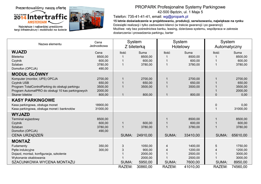 PROPARK Profesjonalne Systemy Parkingowe 42-500 Będzin, ul. 1 Maja 5 Telefon: 735-41-41-41, email: [email protected] 15 letnie doświadczenie w projektowaniu, produkcji, serwisowaniu, największe na rynku Dziesiątki realizacji i tylko zadowoleni klienci (w trakcie gwarancji i po gwarancji) Możliwe: raty bez pośrednictwa banku, leasing, dzierżawa systemu, współpraca w zakresie dostarczenia i prowadzenia parkingu, barter Nazwa elementu WJAZD Bileterka Czytnik Szlaban Domofon (OPCJA) System Z bileterką Cena Jednostkowa Cena 8500,00 600,00 3780,00 490,00 Ilość 1 1 1 Suma 8500,00 600,00 3780,00 System Hotelowy Ilość 1 1 1 System Automatyczny Suma 8500,00 600,00 3780,00 Ilość 1 1 1 Suma 8500,00 600,00 3780,00 MODUŁ GŁÓWNY Komputer (monitor, UPS) OPCJA Czytnik USB Program TotalControlParking do obsługi parkingu Program AutomatPRO do obsługi 10 kas parkingowych Skaner biletów 2700,00 650,00 3500,00 2000,00 800,00 1 1 1 2700,00 650,00 3500,00 1 1 1 2700,00 650,00 3500,00 1 800,00 1 800,00 1 1 1 1 0 2700,00 650,00 3500,00 2000,00 0,00 0 1 0,00 31000,00 1 1 1 8500,00 600,00 3780,00 KASY PARKINGOWE Kasa parkingowa, obsługa monet Kasa parkingowa, obsługa monet i banknotów 18900,00 31000,00 WYJAZD Terminal wyjazdowy Czytnik Szlaban Domofon (OPCJA) 8500,00 600,00 3780,00 490,00 CENA URZĄDZEŃ 1 1 SUMA: 600,00 3780,00 24910,00 1 1 1 SUMA: 8500,00 600,00 3780,00 33410,00 SUMA: 65610,00 MONTAŻ Fudamenty Pętle indukcyjne Dojazd, montaż, konfiguracja, szkolenie Wykonanie okablowania SZACUNKOWA WYCENA MONTAŻU 350,00 300,00 3 3 1 1 SUMA: RAZEM: 1050,00 900,00 2000,00 2000,00 5950,00 30860,00 4 4 1 1 SUMA: RAZEM: 1400,00 1200,00 2500,00 2500,00 7600,00 41010,00 5 4 1 1 SUMA: RAZEM: 1750,00 1200,00 3000,00 3000,00 8950,00 74560,00 Okablowanie zasilające i komunikacyjne Koszt wykonania okablowania zasilającego i komunikacyjnego kalkulowany jest indywidualnie jednak nasze wieloletnie doświadczenie wskazuje że zazwyczaj waha się ono od 7 do 15% wartości systemu. Zakup na raty Możliwy jest zakup na raty bezpośrednio w naszej firmie bez pośrednictwa banku. Przykładowa kalkulacja: zaliczka 20%, 10 rat po 8,5% Leasing Jest jednym z najlepszym sposób finansowania inwestycji. Stałe miesięczne raty są kosztem uzyskania przychodu. Często same oszczędności wynikające z instalacji naszego systemu pozwalają na pokrycie raty leasingowej. Dla nowych firm polecamy GrenkeLeasing, który ma mniejsze wymagania dla nowych firm. Dzierżawa systemu System może zostać wydzierżawiony na określony okres, np. 36 miesięcy. Przez cały okres dzierżawa udzielona jest gwarancja na cały system. Po 60 miesiącach system poddawany jest aktualizacji sterowników, oprogramowania oraz odnowieniu obudów. Współpraca Jeżeli dysponują Państwo parkingiem lub odpowiednim terenem możemy zaoferować montaż profesjonalnego systemu parkingowego i opcjonalnie zarządzanie parkingiem w zamian za udziały z zysku z parking Dzierżawa parkingu Jeżeli dysponują Państwo parkingiem lub odpowiednim terenem możemy w zamian za czynsz zająć się profesjonalną obsługą tego terenu Gwarancja Standardowa gwarancja na nasze systemy wynosi 24 miesiące. Istnieje możliwość ustalenia dłuższego okresu gwarancyjnego. Standardowa propozycja wygląda następująco - gwarancja na system dłuższa niż standardowe 24 miesiące: w każdym roku przegląd płatny jednorazowo kolejno: za 1 rok 3%, 2 rok 4%, 3 rok 5%, 4 rok 6%, 5 rok 7%. - możliwość ustalenia gwarancji bezterminowej. Warunki ustalane są indywidualnie - bezterminowa gwarancja na drukarki termiczne w standardzie. Kupując u nas papier termiczny będziesz posiadał bezterminową gwarancję na drukarki termiczne. Drukarka to element zużywający się (głowica, napęd). Część producentów systemów parkingowych odmawia ich naprawy nawet w trakcie gwarancji argumentując że uszkodzenie wynika z nieprawidłowego użytkowania. Żądając kwot rzędu 2000,3000 a nawet 5000 zł za nową drukarkę. Chcesz mieć najlepszy system, dobrą cenę i spokój także po gwarancji? Kup system PROPARK. Rabaty Standardowe rabaty: przy wykonaniu własnym okablowania zasilającego komunikacyjnego, dla klientów poleconych przez naszych klientów, przy zamówieniach z terminem realizacji dłuższym niż 4 tygodnie oraz rabaty indywidualne. Terminy realizacji Dzięki dużym nakładom inwestycyjnym (hale produkcyjne o powierzchni 1000m2) jesteśmy w stanie realizować zamówienia naszych klientów szybko, tanio i gwarantować najwyższą jakość naszych produktów. Nasze systemy są owocem 15 letniego doświadczenia w zakresie projektowania, produkcji, serwisowania systemów parkingowych. Terminy realizacji obecnie wynoszą od 2 do 4 tygodni od daty podpisania umowy i wpłaty zaliczki. Oczywiście przy specjalnych potrzebach terminy te możemy odpowiednio skrócić nawet do 3-5 dni. Jestem do Państwa dyspozycji Wiesław Górski, tel. 509-290-580, email: [email protected]