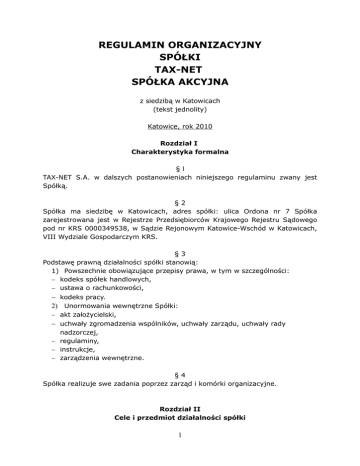 REGULAMIN ORGANIZACYJNY SPÓŁKI TAX-NET SPÓŁKA AKCYJNA z siedzibą w Katowicach (tekst jednolity) Katowice, rok 2010 Rozdział I Charakterystyka formalna §l TAX-NET S.A. w dalszych postanowieniach niniejszego regulaminu zwany jest Spółką. §2 Spółka ma siedzibę w Katowicach, adres spółki: ulica Ordona nr 7 Spółka zarejestrowana jest w Rejestrze Przedsiębiorców Krajowego Rejestru Sądowego pod nr KRS 0000349538, w Sądzie Rejonowym Katowice-Wschód w Katowicach, VIII Wydziale Gospodarczym KRS. §3 Podstawę prawną działalności spółki stanowią: 1) Powszechnie obowiązujące przepisy prawa, w tym w szczególności: − kodeks spółek handlowych, − ustawa o rachunkowości, − kodeks pracy. 2) Unormowania wewnętrzne Spółki: − akt założycielski, − uchwały zgromadzenia wspólników, uchwały zarządu, uchwały rady nadzorczej, − regulaminy, − instrukcje, − zarządzenia wewnętrzne. §4 Spółka realizuje swe zadania poprzez zarząd i komórki organizacyjne. Rozdział II Cele i przedmiot działalności spółki 1 §5 Spółka działa zgodnie z przepisami prawa, zasadami etyki i dobrymi obyczajami, kierując się interesem gospodarczym spółki i akcjonariuszy. §6 1. Przedmiotem działalności Spółki jest: 1) działalność rachunkowo-księgowa, 2) każda inna działalność zgodna z umową Spółki. 2. Celem spółki jest osiąganie w zakresie objętym przedmiotem jej działalności efektywnych ekonomicznie wyników sprzedaży. Cel ten osiągany będzie w szczególności poprzez: 1) wprowadzanie postępu organizacyjnego, technicznego, ekonomicznego, poprzez wdrażanie nowych rozwiązań informatycznych, organizacyjnych, podwyższanie wydajności pracy, obniżanie kosztów działalności, oszczędności, 2) efektywne wykorzystanie środków trwałych, 3) wprowadzanie na rynek nowych usług, efektywnych ekonomicznie zarówno z punktu widzenia spółki, jak i jej klientów, 4) stałe usprawnianie organizacji pracy i zarządzania, 5) prowadzenie rachunku ekonomicznego, 6) zapewnienie właściwych warunków bezpieczeństwa i higieny pracy, ochrony przeciwpożarowej i środowiska naturalnego, 7) kształtowanie właściwej polityki zatrudnienia, 8) tworzenie i doskonalenie na bieżąco warunków sprzyjających kształtowaniu się troski i dbałości o majątek Spółki, samodyscypliny pracowników. Rozdział III Organy spółki Postanowienia ogólne §7 Organami spółki są: 1) zarząd Spółki, 2) rada nadzorcza, 3) zgromadzenie akcjonariuszy. §8 Kompetencje organów spółki określają: 1) kodeks spółek handlowych, 2) umowa Spółki, 3) regulamin zgromadzenia akcjonariuszy 4) uchwały zgromadzenia akcjonariuszy, 2 5) regulamin rady nadzorczej 6) regulamin zarządu, 7) niniejszy regulamin organizacyjny, 8) regulamin pracy i wynagradzania Zarząd §9 Organizację zarządu Spółki, jego zakres działania oraz tryb odbywania posiedzeń i podejmowania uchwał określa Regulamin zarządu TAX-NET S.A. zatwierdzony uchwałą rady nadzorczej. Skład zarządu § 10 1. Zarząd Spółki jest organem kolegialnym. 2. W skład zarządu wchodzą: 1) prezes zarządu, 2) członkowie zarządu jako wiceprezesi - zarządzający oddziałami Spółki, 3) członek zarządu jako wiceprezes zarządu do spraw finansowych Spółki, 3. Wszyscy członkowie zarządu są zobowiązani do wykonywania swoich obowiązków ze szczególną starannością wymaganą przy prowadzeniu działalności gospodarczej oraz ponoszą odpowiedzialność za szkody wyrządzone Spółce, a będące następstwem ich zawinionego działania lub zaniechania. Rozdział IV Ogólne obowiązki, uprawnienia i odpowiedzialność członków zarządu Prezes zarządu § 11 zarządu kształtuje, organizuje, kieruje, nadzoruje, kontroluje działalność Spółki zgodnie z zakresem czynności. 2.. Prezes zarządu jest odpowiedzialny za terminowe regulowanie wszelkich zobowiązań, a w szczególności zobowiązań budżetowych. 3.. Na żądanie prezesa zarządu pozostali członkowie zarządu udzielają mu informacji niezbędnych do sprawowania jego funkcji. 1.. Prezes Członkowie zarządu § 12 1. Pozostali członkowie zarządu kształtują, organizują, kierują, nadzorują i kontrolują powierzony im zakres działalności Spółki oraz dokonują z 3 zachowaniem zasad reprezentacji określonych w umowie Spółki czynności prawnych, w granicach czynności powierzonych im na mocy niniejszego Regulaminu oraz zakresu czynności. 2. Członkowie współdziałają w zakresie pełnienia swoich obowiązków na zasadach równości i partnerstwa. Wiceprezes zarządu - do spraw finansowych Spółki § 13 1. Wiceprezes zarządu do spraw finansowych kształtuje, organizuje, kieruje, nadzoruje i kontroluje działalność finansowo-ekonomiczną Spółki oraz ponosi odpowiedzialność w tym zakresie. 2. Zakres odpowiedzialności wiceprezesa zarządu do spraw finansowych obejmuje powierzony mu zakres czynności, a w szczególności: 1) zapewnienie właściwego udokumentowania i przebiegu operacji gospodarczych Spółki, 2) nadzorowanie prowadzenia ksiąg i zapisów księgowych oraz sprawozdawczości finansowej Spółki, 3) terminowe i właściwe ustalanie zobowiązań należnych skarbowi państwa i jednostkom samorządu terytorialnego, 4) analizę i ocenę sytuacji ekonomicznej i finansowej Spółki, 5) kontrolę wewnętrzną Spółki. 3. Wiceprezes zarządu do spraw finansowych w drodze pisemnej przejmuje odpowiedzialność za rachunkowość Spółki oraz za rzetelność ksiąg oraz sprawozdań finansowych spółki. Wzór oświadczenia wiceprezesa zarządu do spraw finansowych stanowi Załącznik nr 1. Wiceprezesi zarządu - zarządzający oddziałami Spółki § 14 1. Wiceprezesi zarządu zarządzający oddziałami Spółki kierują na bieżąco działalnością powierzonych im oddziałów Spółki (dalej "oddział") i reprezentują Spółkę w ramach działalności oddziału na zewnątrz w zakresie jego działalności z zachowaniem 