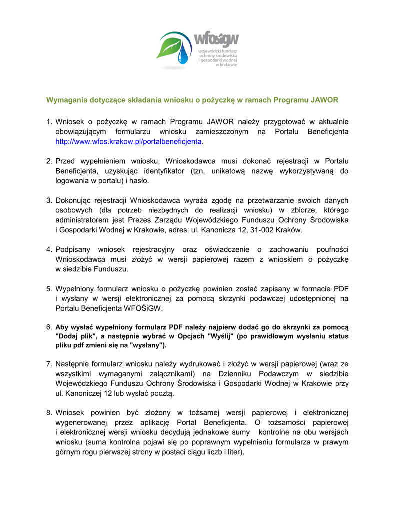 Wymagania dotyczące składania wniosku o pożyczkę w ramach Programu JAWOR 1. Wniosek o pożyczkę w ramach Programu JAWOR należy przygotować w aktualnie obowiązującym formularzu wniosku zamieszczonym na Portalu Beneficjenta http://www.wfos.krakow.pl/portalbeneficjenta. 2. Przed wypełnieniem wniosku, Wnioskodawca musi dokonać rejestracji w Portalu Beneficjenta, uzyskując identyfikator (tzn. unikatową nazwę wykorzystywaną do logowania w portalu) i hasło. 3. Dokonując rejestracji Wnioskodawca wyraża zgodę na przetwarzanie swoich danych osobowych (dla potrzeb niezbędnych do realizacji wniosku) w zbiorze, którego administratorem jest Prezes Zarządu Wojewódzkiego Funduszu Ochrony Środowiska i Gospodarki Wodnej w Krakowie, adres: ul. Kanonicza 12, 31-002 Kraków. 4. Podpisany wniosek rejestracyjny oraz oświadczenie o zachowaniu poufności Wnioskodawca musi złożyć w wersji papierowej razem z wnioskiem o pożyczkę w siedzibie Funduszu. 5. Wypełniony formularz wniosku o pożyczkę powinien zostać zapisany w formacie PDF i wysłany w wersji elektronicznej za pomocą skrzynki podawczej udostępnionej na Portalu Beneficjenta WFOŚiGW. 6. Aby wysłać wypełniony formularz PDF należy najpierw dodać go do skrzynki za pomocą "Dodaj plik", a następnie wybrać w Opcjach "Wyślij" (po prawidłowym wysłaniu status pliku pdf zmieni się na "wysłany"). 7. Następnie formularz wniosku należy wydrukować i złożyć w wersji papierowej (wraz ze wszystkimi wymaganymi załącznikami) na Dzienniku Podawczym w siedzibie Wojewódzkiego Funduszu Ochrony Środowiska i Gospodarki Wodnej w Krakowie przy ul. Kanoniczej 12 lub wysłać pocztą. 8. Wniosek powinien być złożony w tożsamej wersji papierowej i elektronicznej wygenerowanej przez aplikację Portal Beneficjenta. O tożsamości papierowej i elektronicznej wersji wniosku decydują jednakowe sumy kontrolne na obu wersjach wniosku (suma kontrolna pojawi się po poprawnym wypełnieniu formularza w prawym górnym rogu pierwszej strony w postaci ciągu liczb i liter).