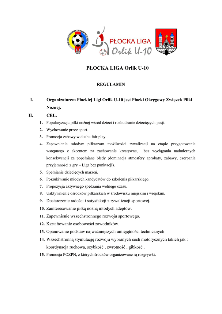 PŁOCKA LIGA Orlik U-10 REGULAMIN I. Organizatorem Płockiej Ligi Orlik U-10 jest Płocki Okręgowy Związek Piłki Nożnej. II. CEL. 1. Popularyzacja piłki nożnej wśród dzieci i rozbudzanie dziecięcych pasji. 2. Wychowanie przez sport. 3. Promocja zabawy w duchu fair play . 4. Zapewnienie młodym piłkarzom możliwości rywalizacji na etapie przygotowania wstępnego z akcentem na zachowanie kreatywne, bez wyciągania nadmiernych konsekwencji za popełniane błędy (dominacja atmosfery aprobaty, zabawy, czerpania przyjemności z gry – Liga bez punktacji). 5. Spełnianie dziecięcych marzeń. 6. Poszukiwanie młodych kandydatów do szkolenia piłkarskiego. 7. Propozycja aktywnego spędzania wolnego czasu. 8. Uaktywnienie ośrodków piłkarskich w środowisku miejskim i wiejskim. 9. Dostarczenie radości i satysfakcji z rywalizacji sportowej. 10. Zainteresowanie piłką nożną młodych adeptów. 11. Zapewnienie wszechstronnego rozwoju sportowego. 12. Kształtowanie osobowości zawodników. 13. Opanowanie podstaw najważniejszych umiejętności technicznych 14. Wszechstronną stymulację rozwoju wybranych cech motorycznych takich jak : koordynacja ruchowa, szybkość , zwrotność , gibkość . 15. Promocja POZPN, z których środków organizowane są rozgrywki. PŁOCKA LIGA Orlik U-10 DRUŻYNY. III. 1. Płocka Liga Orlik U-10 (rocznik 2005 i młodsi) ma charakter szkoleniowy odbywa się na zasadzie Turniejów, bez klasyfikacji, bez punktów, bez zapisywania wyników, dla radości z samej gry i rywalizacji, w celu podnoszenia sprawności fizycznej młodych piłkarzy i umiejętności technicznych oraz taktycznych nie zaś dla wyników. 2. drużyny te nie są brane pod uwagę jako zespoły młodzieżowe wymagane do licencji. 3. W Turnieju mogą brać udział tylko zespoły klubowe, zrzeszone w POZPN. 4. W kadrze meczowej drużyny znajduje się 14 zawodników, na boisku grają zespoły siedmioosobowe (6+1) 5. Zespoły biorące udział w rozgrywkach muszą zgłosić swych zawodników przed rozgrywkami, a w trakcie Turnieju przedstawić do weryfikacji ważne legitymacje szkolne lub dokument ze zdjęciem. 6. Zawodnicy zgłoszonej drużyny muszą posiadać aktualne, indywidualne karty zdrowia zawodnika, zaś drużynę musi prowadzić trener z ważną licencją trenerską. IV. BOISKO 1. Orlik w Ogrodzie Jordanowskim, pełne boisko orlik, bramki 5x2. V. ZAWODNICY. 1. Zawodnicy urodzeni w 2005 roku i młodsi do 2007 roku włącznie. 2. Zawodnicy mają obowiązek występowania w obuwiu halowym lub piłkarskim typu lanki, bądź turfy zaleca się także grę w ochraniaczach. 3. Istnieje możliwość występu dziewcząt, dopuszcza się zawodniczki dwa lata starsza czyli z rocznika 2003, także całą drużynę dziewcząt rocznik 2003 i młodsze. 4. W przypadku rozgrywek U-12,U-11,U-10, U-9 zawodnik może uczestniczyć w spotkaniu swojej drużyny z innego rocznika dopiero w następnej kolejce rozgrywanej nie wcześniej jak po upływie 48 godzin. Zalecenie to nie dotyczy bramkarza. PŁOCKA LIGA Orlik U-10 CZAS TRWANIA SPOTKAŃ. VI. 1. Mecze trwają 3 x 6 minut ze zmianą stron. Pierwsze dwie tercje w różnych składach ostatnia w dowolnym. Przed trzecią tercją drużyna, która przegrywa wybiera na której połowie chce grać. Jeżeli drużyna nie ma wystarczającej ilości zawodników to dopuszczamy grę w częściowo zmienionych składach. VII. ZASADY GRY. 1. Brak spalonych. 2. Piłka rozmiar 4. 3. Wrzut z autu: zawodnik przesuwa nogą piłkę z linii autowej na boisko i piłka jest już w grze. Można wykonać podanie, ale na wysokości kolan, nie na zasadzie rzutu wolnego lub strzału na bramkę. 4. Zakaz gry wślizgiem. 5. Wszystkie rzuty wolne z wyjątkiem rzutu karnego, rzutu rożnego są rzutami pośrednimi. 6. Odległość muru od piłki 5 m. 7. Rzut karny wykonywany jest z odległości 7m. 8. Po wyjściu piłki za linię końcową bramkarz rozpoczyna grę w dowolny sposób do polowy boiska. 9. Zmiany powrotne (hokejowe), w wyznaczonym miejscu. 10. W przypadku gdy jedna z drużyn wygrywa różnicą 3 bramek, zespół przegrywający może wprowadzić dodatkowego zawodnika i grać nawet przez dalszą część meczu, jeśli wynik zmniejszy się do dwubramkowej różnicy dodatkowy zawodnik schodzi. VIII. KARY INDYWIDUALNE. 1. Kary minutowe – 2 ,3 minuty, z możliwością powrotu po stracie bramki przez ukarany zespół. PŁOCKA LIGA Orlik U-10 PUNKTACJA. IX. 1. NIE ISTNIEJE PUNKTACJA, NIE MA ŻADNYCH TABEL, SĘDZIA NIE PODAJE NIKOMU WYNIKU DO ZAPISANIA. LICZY SIĘ DOBRA GRA ZESPOŁÓW, ZAANGAŻOWANIE, RYWALIZACJA FAIR PLAY I ŚWIETNA ZABAWA!!!!!!! POSTANOWIENIA KOŃCOWE. X. 1. Uczestnictwo w Płockiej Lidze Orlik U-10 jest równoznaczne z akceptacją regulaminu. 2. Drużyny zgłaszające chęć udziału w Płockiej Lidze Orlik U-10 wpłacają na konto POZPN wpisowe w wysokości 250 zł ( z dopiskiem w tytule: „Wpisowe drużyny do Płockiej Ligi Orlik U-10”) 3. Za porządek w szatniach i w miejscach wyznaczonych jako ławka rezerwowych odpowiada trener wraz z drużyną. 4. POZPN nie bierze odpowiedzialności za rzeczy pozostawione w szatniach i na terenie rozgrywania Turnieju. 5. Władze klubów biorących udział w Płockiej Lidze Orlik U-10 ubezpieczają swych zawodników na czas trwania rozgrywek. 6. Sędziów oraz opiekę medyczną zapewnia organizator PŁOCKIEJ LIGI ORLIK U-10 – Płocki Okręgowy Związek Piłki Nożnej. 7. Kluby biorące udział w rozgrywkach promują Ligę, umieszczając na swoich stronach internetowych logo PŁOCKIEJ LIGI Orlik U-10 oraz logo POZPN. 8. Zgłoszenie zawodników wygląda tak jak w drużynach seniorskich i juniorskich, wypełnione karty zgłoszeniowe złożone przed rozpoczęciem rozgrywek w biurze POZPN wraz z wnioskiem o karty chipowe. 9. W przypadku drastycznych naruszeń Regulaminu rozgrywek, a zwłaszcza zasad fair –play i dobrego wychowania przez zawodników, trenerów, rodziców bądź kibiców danego klubu, istnieje na wniosek sędziego