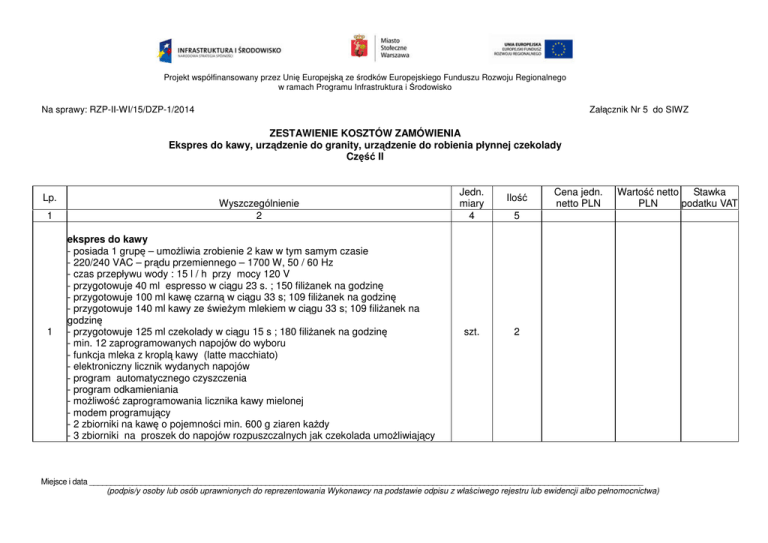 Projekt współfinansowany przez Unię Europejską ze środków Europejskiego Funduszu Rozwoju Regionalnego w ramach Programu Infrastruktura i Środowisko Na sprawy: RZP-II-WI/15/DZP-1/2014 Załącznik Nr 5 do SIWZ ZESTAWIENIE KOSZTÓW ZAMÓWIENIA Ekspres do kawy, urządzenie do granity, urządzenie do robienia płynnej czekolady Część II Lp. 1 1 Wyszczególnienie 2 ekspres do kawy - posiada 1 grupę – umożliwia zrobienie 2 kaw w tym samym czasie - 220/240 VAC – prądu przemiennego – 1700 W, 50 / 60 Hz - czas przepływu wody : 15 l / h przy mocy 120 V - przygotowuje 40 ml espresso w ciągu 23 s. ; 150 filiżanek na godzinę - przygotowuje 100 ml kawę czarną w ciągu 33 s; 109 filiżanek na godzinę - przygotowuje 140 ml kawy ze świeżym mlekiem w ciągu 33 s; 109 filiżanek na godzinę - przygotowuje 125 ml czekolady w ciągu 15 s ; 180 filiżanek na godzinę - min. 12 zaprogramowanych napojów do wyboru - funkcja mleka z kroplą kawy (latte macchiato) - elektroniczny licznik wydanych napojów - program automatycznego czyszczenia - program odkamieniania - możliwość zaprogramowania licznika kawy mielonej - modem programujący - 2 zbiorniki na kawę o pojemności min. 600 g ziaren każdy - 3 zbiorniki na proszek do napojów rozpuszczalnych jak czekolada umożliwiający Jedn. miary 4 szt. Ilość Cena jedn. netto PLN Wartość netto Stawka PLN podatku VAT 5 2 Miejsce i data _________________________________________________________________________________________________________________________________ (podpis/y osoby lub osób uprawnionych do reprezentowania Wykonawcy na podstawie odpisu z właściwego rejestru lub ewidencji albo pełnomocnictwa) podanie 1 kg proszku każdy - wewnętrzny zbiornik na wodę o pojemności : 3, 5 l - ociekacz o pojemności 1 l - dodatkowy, zewnętrzny pojemnik zwiększając pojemność do 0,8 kg ziaren kawy - panel dotykowy i ekran LCD: wszystkie opcje są dostępne po naciśnięciu 1 przycisku - intuicyjny panel dotykowy i wyświetlacz LCD, jest przeznaczony do samodzielnego użytku, nie wymaga obsługi baristy - korpus wytrzymały, front korpusu jest ze stali nierdzewnej - metalowa obudowa - masa : 50 kg - wymiary: 442 mm (+/-5%) 564 mm (+/-5%) 815 mm (+/-5%) - podstawa szuflady mieszcząca odpad 50 filiżanek napojów kawowych - technika oznakowania: grawer w 1 wzorze graficznym (składający się z 37 liter: „Muzeum Warszawy” „Muzeum Warszawskiej Pragi”) zgodnie z załącznikiem Nr 12 do SIWZ, w 1 miejscu 2 ekspres do kawy - moc: 1400 W - 220/240 VAC – prądu przemiennego – 1400 W, 50 / 60 Hz - czas przepływu wody : 15 l / h przy mocy 120 V - przygotowuje 40 ml espresso w ciągu 23 s. ; 150 filiżanek na godzinę - przygotowuje 100 ml kawę czarną w ciągu 33 s; 109 filiżanek na godzinę - przygotowuje 140 ml kawy ze świeżym mlekiem w ciągu 33 s; 109 filiżanek na godzinę - min. 8 zaprogramowanych napojów do wyboru - funkcja mleka z kroplą kawy (latte macchiato) - elektroniczny licznik wydanych napojów - program automatycznego czyszczenia - program odkamieniania - możliwość zaprogramowania licznika kawy mielonej - modem programujący - zbiornik na kawę 0,3 kg ziaren - wewnętrzny zbiornik na wodę o pojemności : 3, 5 l szt. 4 Strona 2 z 4 Miejsce i data ___________________________________________________________________________________________________________________________ (podpis/y osoby lub osób uprawnionych do reprezentowania Wykonawcy na podstawie odpisu z właściwego rejestru lub ewidencji albo pełnomocnictwa) - ociekacz o pojemności 0,7 l - korpus wytrzymały, front korpusu jest ze stali nierdzewnej - metalowa obudowa - masa : 25 kg - wymiary: 299 mm (+/-5%) 452 mm (+/-5%) 445 mm (+/-5%) - podstawa szuflady mieszcząca odpad po 40 filiżankach napojów kawowych - technika oznakowania: grawer w 1 wzorze graficznym (składający się z 37 liter: „Muzeum Warszawy” „Muzeum Warszawskiej Pragi”) zgodnie z załącznikiem Nr 12 do SIWZ, w 1 kolorze w jednym miejscu 3 4 Urządzenie do granity - umożliwia przygotowanie napojów zimnych typu granita - możliwość wykorzystania na wolnym powietrzu - 2 pojemniki, każdy o pojemności 12 l - wymiary 56 cm (+/- 5%) 40 cm (+/- 5%) 85 cm (+/- 5%) - waga 60 kg (+/- 5%) - moc 940 W - korpus ze stali nierdzewnej - technika oznakowania: grawer w 1 wzorze graficznym (składający się z 37 liter: „Muzeum Warszawy” „Muzeum Warszawskiej Pragi”) zgodnie z załącznikiem Nr 12 do SIWZ, w 1 kolorze w jednym miejscu Urządzenie do robienia płynnej czekolady - Wysokość całkowita: 92 cm – 94 cm - wysokość górnej części: 48 cm – 50 cm - szerokość podstawy: 30cm – 32 cm - wysokość podstawy: 27 cm – 29 cm - szerokość płyty podstawy: 41 cm – 43 cm - waga maszyny: 18 kg – 20 kg - zasilanie elektryczne 230V - 50Hz szt. 2 szt. 1 Strona 3 z 4 Miejsce i data ___________________________________________________________________________________________________________________________ (podpis/y osoby lub osób uprawnionych do reprezentowania Wykonawcy na podstawie odpisu z właściwego rejestru lub ewidencji albo pełnomocnictwa) - moc znamionowa 250W - technika oznakowania: grawer w 1 wzorze graficznym (składający się z 37 liter: „Muzeum Warszawy” „Muzeum Warszawskiej Pragi”) zgodnie z załącznikiem Nr 12 do SIWZ, w 1 kolorze w jednym miejscu RAZEM NETTO ……………….. x KWOTA PODATKU VAT ……………….. x RAZEM BRUTTO ……………….. x Strona 4 z 4 Miejsce i data ___________________________________________________________________________________________________________________________ (podpis/y osoby lub osób uprawnionych do reprezentowania Wykonawcy na podstawie odpisu z właściwego rejestru lub ewidencji albo pełnomocnictwa)