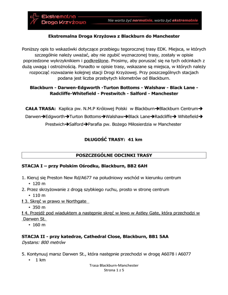 Ekstremalna Droga Krzyżowa z Blackburn do Manchester Poniższy opis to wskazówki dotyczące przebiegu tegorocznej trasy EDK. Miejsca, w których szczególnie należy uważać, aby nie zgubić wyznaczonej trasy, zostały w opisie poprzedzone wykrzyknikiem i podkreślone. Prosimy, aby poruszać się na tych odcinkach z dużą uwagą i ostrożnością. Ponadto w opisie trasy, wskazane są miejsca, w których należy rozpocząć rozważanie kolejnej stacji Drogi Krzyżowej. Przy poszczególnych stacjach podana jest liczba przebytych kilometrów od Blackburn. Blackburn - Darwen-Edgworth -Turton Bottoms - Walshaw - Black Lane Radcliffe-Whitefield - Prestwitch - Salford - Manchester CAŁA TRASA: Kaplica pw. N.M.P Królowej Polski w BlackburnBlackburn Centrum DarwenEdgworthTurton BottomsWalshawBlack LaneRadcliffe Whitefield PrestwichSalfordParafia pw. Bożego Miłosierdzia w Manchester DŁUGOŚĆ TRASY: 41 km POSZCZEGÓLNE ODCINKI TRASY STACJA I – przy Polskim Ośrodku, Blackburn, BB2 6AH 1. Kieruj się Preston New Rd/A677 na południowy wschód w kierunku centrum • 120 m 2. Przez skrzyżowanie z drogą szybkiego ruchu, prosto w stronę centrum • 110 m ! 3. Skręć w prawo w Northgate • 350 m ! 4. Przejdź pod wiaduktem a następnie skręć w lewo w Astley Gate, która przechodzi w Darwen St. • 160 m STACJA II - przy katedrze, Cathedral Close, Blackburn, BB1 5AA Dystans: 800 metrów 5. Kontynuuj marsz Darwen St., która następnie przechodzi w drogę A6078 i A6077 • 1 km Trasa Blackburn-Manchester Strona 1 z 5 6. Na rondzie koło stacji Texaco, idź prosto pod górę ulicą Brandy House Brow, która przechodzi w Roman Road • 2,8 km STACJA III - pod autostradą, Roman Road, BB1 Dystans: 4,7 km 7. Trzymaj się Roman Road ! Uwaga, droga wąska, kręta bez chodnika • 3,3 km STACJA IV – po prawej stronie, na parkingu, Blacksnape Rd, Hoddlesden, Darwen, BB3 3PN Dystans: 8 km 8. Kontynuuj Roman Road ! Uwga, droga wąska i bez chodnika • 2 km STACJA V – po prawej stronie pod kościołem St. Marys Mission Church, BB3 3RS Dystans: 10 km 9. Kontynuuj dalej Roman Rd. ! Uważaj brak chodnika • 3 km STACJA VI – po prawej stronie, pod kościołem St. James Church, Blackburn Road, Edgworth, BL7 0PL Dystans: 13 km 10. Kontynuuj Blackburn Rd. • 750 m 11. Na skrzyżowaniu koło pubu White Horse, prosto wzdłuż Bury Rd. ! Uważaj większość drogi jest bez chodnika • 1.9 km STACJA VII – po lewej stronie, nad brzegiem jeziora, Bury Rd, Bolton, BL7 0HT Dystans: 15,5 km 12. Kontynuuj drogą Bury Rd. ! Uważaj większość drogi jest bez chodnika • 350 m 13. Na skrzyżowaniu koło India Gata, idź prosto • 100 m Trasa Blackburn-Manchester Strona 2 z 5 14. Skręć lekko w prawo w Watling St. • 1.6 km STACJA VIII – po lewej stronie, pod Congregational Chapel, Watling Street, Tottington, BL8 3QW Dystans: 17,5 km 15. Kontynuuj Watling St. ! Uważaj większość drogi jest wąska i bez chodnika • 1,1 km 16. Skręć w lewo w Bradshaw Rd. • 1,4 km 17. Kontynuuj wzdłuż Hall St. • 500 m 18. Kontynuuj wzdłuż High St. • 200 m STACJA IX – po prawej stronie, pod kościołem Christ Church Walshaw, High Street, Bury, BL8 3FS Dystans: 21 km 19. Kontynuuj High St. • 170 m 20. Idź dalej Lower Croft Rd. • 1.1 km ! 21. Na światłach koło pubu Black Bull, lekko w prawo i prosto w Starling Road • 950 m 22. Na skrzyżowaniu z główną drogą, koło pubu Toby Carvery Ainsworth idź prosto • 1.1 km ! 23. Skręć po skosie w lewo w Greenbank Road, następnie kieruj się ścieżką Bannana Path, przez park, wzdłuż Greenbank Road • 800 m 24. Na tej ścieżce, na drugiej bramce, po prawej stronie będzie widoczny kościół. STACJA X - pod kościołem St Mary i St Philip Neri RC, Belgreve Street, Radciffe, M26 4DG Dystans: 25 km 25. Wróć na ścieżkę • 300 m 26. Przejdź przez czerwony most nad kanałem i idź prosto, upewniając się, że zabudowania są po prawej stronie Trasa Blackburn-Manchester Strona 3 z 5 • 400 m 27. Po dojściu do jezdni, przejdź jezdnią na wprost przez parking, po lewej stronie powinien znajdować się parking dwu poziomwy • 200 m 28. Po dojściu do stacji kolejowej, poruszaj się chodnikiem po skosie w prawo, w dół • 80 m 29. Na końcu ścieżki, skręć w prawo w Church Street West. • 300 m 30. Za Boston Pizza, skręć w lewo w Church Street, która przechodzi w Stand Lane • 300 m 31. Na światłach w lewo, na drogę A56, (znaki w kierunku autostrady M60) • 1,7 km 32. Na końcu drogi koło Betfreed, skręć po skosie w prawo w Bury New Rd. • 1,8 km 33. Przejdź przejściem podziemnym, do białego mostku nad autostradą STACJA XI - na mostku nad autostradą, Bury New Road, Prestwich, M45 Dystans: 30 km 34. Opuść mostek , idź przejściem podziemnym, by znaleźć się po lewej stronie, na Bury New Rd. • 3 km STACJA XII – po lewej stronie, pod kościołem Our Lady of Dolurs RC, 500 Bury New Road, Salford, M7 4ND Dystans: 33 km 35. Kontynuuj Bury New Rd. w kierunku centrum (na każdym skrzyżowaniu prosto) • 2 km 36. Koło salonu samochodowego Hundai i Lexus, skręć w prawo w Fenney Street. • 260 m 37. Skręć w lewo w Great Clowes Street (A5066) • 1,1 km ! 38. Na skrzyżowaniu przed szkołą, skręć w prawo w Silk St. • 350 m ! 39. Za ostatnim wieżowcem skręć w lewo w North George Street • 350 m 40. Na końcu drogi poruszaj się lekko w lewo i prosto Great George St. • 120 m STACJA XIII – przy katedrze St. John the Evangelist, 3 Ford St, Salford, M3 6DP Dystans: 37 km Trasa Blackburn-Manchester Strona 4 z 5 41. Po wyjściu z katedry idź w lewo Chapel St. • 150 m 42. Na skrzyżowaniu ze światłami, skęć w prawo w Trinity Way (A34), cały czas tą drogą prosto, przechodzi w New Quay St, następnie Quay St, Peter St. i Oxford Rd • 2,9 km STACJA XIV – po lewej stronie, pod kościołem Church of the Holy Name of Jesus RC, 339 Oxford Road, Manchester, M13 9PG Dystans: 40 km 43. Kontunuuj Oxford Rd.