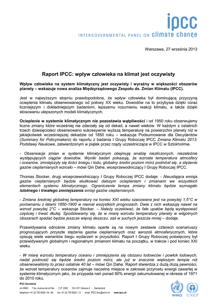 Do Not Cite, Quote or Distribute Warszawa, 27 września 2013 Raport IPCC: wpływ człowieka na klimat jest oczywisty Wpływ człowieka na system klimatyczny jest oczywisty i wyraźny w większości obszarów planety – wskazuje nowa analiza Międzyrządowego Zespołu ds. Zmian Klimatu (IPCC). Jest w najwyższym stopniu prawdopodobne, że wpływ człowieka był dominującą przyczyną ocieplenia klimatu obserwowanego od połowy XX wieku. Dowodów na to przybywa dzięki coraz liczniejszym i dokładniejszym badaniom, lepszemu rozumieniu reakcji klimatu, a także dzięki stosowaniu ulepszonych modeli klimatycznych. Ocieplenie w systemie klimatycznym nie pozostawia wątpliwości i od 1950 roku obserwujemy liczne zmiany które wcześniej nie zdarzały się od dekad, a nawet wieków. W każdym z ostatnich trzech dziesięcioleci obserwowano sukcesywnie wyższą temperaturę na powierzchni planety niż w jakiejkolwiek wcześniejszej dekadzie od 1850 roku – wskazuje Podsumowanie dla Decydentów (Summary for Policymakers) do raportu z badania I Grupy Roboczej IPCC Zmiana Klimatu 2013: Podstawy Naukowe, zatwierdzonym w piątek przez rządy uczestniczące w IPCC w Sztokholmie. - Obserwacje zmian w systemie klimatycznym obejmują analizę niezliczonych, niezależnie występujących ciągów dowodów. Wyniki badań pokazują, że wzrosła temperatura atmosfery i oceanów, zmniejszyły się ilości śniegu i lodu, globalny średni poziom mórz podniósł się, a stężenie gazów cieplarnianych wzrosło – mówi Qin Dahe, wiceprzewodniczący I Grupy Roboczej IPCC. Thomas Stocker, drugi wiceprzewodniczący I Grupy Roboczej IPCC dodaje: - Nieustająca emisja gazów cieplarnianych będzie skutkować dalszym ociepleniem i zmianami we wszystkich elementach systemu klimatycznego. Ograniczenie tempa zmiany klimatu będzie wymagało istotnego i trwałego zmniejszenia emisji gazów cieplarnianych. - Zmiana średniej globalnej temperatury na koniec XXI wieku szacowana jest na powyżej 1,5°C w porównaniu z latami 1850-1900 w niemal wszystkich prognozach. Dwie z nich wskazują nawet na wzrost powyżej 2°C – wskazuje Stocker. – Należy oczekiwać, że fale upałów będą występować częściej i trwać dłużej. Spodziewamy się, że w miarę wzrostu temperatury planety w wilgotnych obszarach spadać będzie jeszcze więcej deszczu, zaś w suchych jeszcze mniej – dodaje. Przewidywania odnośnie zmiany klimatu oparte są na nowym zestawie czterech scenariuszy prognozujących przyszłe stężenia gazów cieplarnianych oraz aerozoli atmosferycznych, które opisują wiele wariantów biegu wydarzeń w przyszłości. Raport I Grupy Roboczej poświęcony był przewidywanym globalnym i regionalnym zmianom klimatu na początku, w trakcie i pod koniec XXI wieku. - W miarę wzrostu temperatury oceanu i zmniejszenia się obszaru lodowców i powłok lodowych, nadal podnosić się będzie średni poziom mórz, ale już w znacznie większym tempie niż obserwowaliśmy to przez ostatnie 40 lat – mówi Qin Dahe. Raport stwierdza z dużą dozą pewności, że wzrost temperatury oceanów zajmuje naczelne miejsce w zakresie przyrostu energii zawartej w systemie klimatycznym jako, że przypada nań ponad 90% energii zakumulowanej w okresie of 1971 do 2010 roku. IPCC Secretariat c/o WMO · 7 bis, Avenue de la Paix · C.P: 2300 · CH-1211 Geneva 2 · Switzerland telephone +41 22 730 8208 / 54 / 84 · fax +41 22 730 8025 / 13 · email [email protected] · www.ipcc.ch W wyniku emisji dwutlenku węgla, której dokonywaliśmy, dokonujemy i prawdopodobnie dokonywać będziemy, przyczyniliśmy się do zmiany klimatu planety. Konsekwencje naszych działań utrzymają się przez stulecia, nawet jeśli teraz całkowicie zaniechalibyśmy dalszej emisji – konkluduje Thomas Stocker konkluduje. - Podsumowanie dla Decydentów autorstwa I Grupy Roboczej zapewnia cenny wgląd w naukowe podłoże zmiany klimatu. Stanowi twardą podstawę dla rozważania wpływu zmiany klimatu na człowieka, jak też możliwych naturalnych środków, jakie można podjąć by stawić czoła temu wyzwaniu. Te aspekty objęte zostały zakresem analiz II oraz III Grupy Roboczej, przeznaczonych do publikacji w marcu i kwietniu 2014 roku. Cykl V Raportu z analiz IPCC zakończy publikacja raportu podsumowującego w październiku 2014 roku - mówi Rajendra Pahauri, przewodniczący IPCC. - Chciałbym podziękować wiceprzewodniczącym I Grupy Roboczej oraz setkom naukowców i ekspertów którzy pracowali jako autorzy i redaktorzy nad stworzeniem tego kompleksowego, solidnego naukowo opracowania. Moje podziękowania kieruję także do ponad tysiąca ekspertów na całym świecie, którzy włożyli swoją wiedzę i doświadczenie w weryfikację naszego materiału – powiedział Rajendra Pachauri, przewodniczący IPCC. Podsumowanie dla Decydentów z wkładu I Grupy Roboczej do V Raportu z Analiz IPCC (WGI AR5) dostępne jest na stronach www.climatechange2013.org oraz www.ipcc.ch. Główne wnioski Zapraszamy do zapoznania się z zestawieniem głównych wniosków z Podsumowania dla Decydentów I Grupy Roboczej AR5 dostępnym pod adresem www.climatechange2013.org. Tło Wiceprzewodniczącymi I Grupy Roboczej są Qin Dahe z Chińskiej Administracji Meteorologicznej w Pekinie oraz Thomas Stocker z Uniwersytetu Berneńskiego w Szwajcarii. Zespół wsparcia technicznego I Grupy Roboczej pracuje na Uniwersytecie Berneńskim i finansowany jest przez rząd szwajcarski. W kwietniu 2008 roku, na 28 posiedzeniu IPCC członkowie postanowili o sporządzeniu V Raportu z Analiz (AR5). W lipcu 2009 roku odbyło się spotkanie dla określenia zakresu oraz struktury raportu. Wynikłe z niego ramy opracowań dla trzech Grup Roboczych AR5 zostały zatwierdzone na 31 posiedzeniu IPCC w październiku 2009 roku. Podsumowanie dla Decydentów z opracowania I Grupy Roboczej AR5 zostało zatwierdzone na 12 posiedzeniu Grupy w Sztokholmie w dniach 23-26 września 2013 r. i opublikowane 27 wrześ