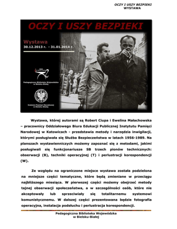 OCZY I USZY BEZPIEKI WYSTAWA Wystawa, której autorami są Robert Ciupa i Ewelina Małachowska – pracownicy Oddziałowego Biura Edukacji Publicznej Instytutu Pamięci Narodowej w Katowicach - przedstawia metody i narzędzia inwigilacji, którymi posługiwała się Służba Bezpieczeństwa w latach 1956-1989. Na planszach wystawienniczych możemy zapoznać się z metodami, jakimi posługiwali się funkcjonariusze SB trzech pionów technicznych: obserwacji (B), techniki operacyjnej (T) i perlustracji korespondencji (W ). Ze względu na ograniczone miejsce wystawa została podzielona na mniejsze części tematyczne, które będą zmieniane w przeciągu najbliższego miesiąca. W pierwszej części możemy obejrzeć metody tajnej obserwacji społeczeństwa, a w szczególności osób, które nie akceptowały lub sprzeciwiały się totalitarnemu systemowi komunistycznemu. W dalszej części prezentowana będzie fotografia operacyjna, instalacja podsłuchu i perlustracja korespondencji. Pedagogiczna Biblioteka Wojewódzka w Bielsku-Białej OCZY I USZY BEZPIEKI WYSTAWA Końcowa część ekspozycji ikonograficznej obejmuje fotografie zatytułowane „W obiektywie bezpieki”, na których będziemy mogli zobaczyć m.in. zdjęcia i zbierane informacje dotyczące kościoła – kurii i biskupów, uczestników pielgrzymek na Jasną Górę czy uroczystości Bożego Ciała. Piony techniczne rejestrowały również, za pomocą zdjęć i nagranych filmów, próby zrzucenia totalitarnego jarzma, które służyły władzy ludowej do identyfikacji uczestników zrywów niepodległościowych. Ekspozycja planszowa obejmuje materiały z manifestacji w Poznaniu w 1956 roku, Warszawie i Gliwicach z 1968 roku, a także w Gdańsku i Gdyni z 1970 roku. Wywiadowcy obejmowali obserwacją także powstające Pierwsze Wolne Związki Zawodowe w 1978 r. i powstającą Solidarność. W zapisie zdjęciowym możemy również zobaczyć materiały ze stanu wojennego i manifestacje organizowane przez opozycję. Dorota Pająk Pedagogiczna Biblioteka Wojewódzka w Bielsku-Białej