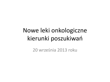 Nowe leki onkologiczne kierunki poszukiwań 20 września 2013 roku Wyzwania • Nowotwór ma być wyleczalny. • Nowotwór ma z choroby śmiertelnej stać się chorobą przewlekłą o długim horyzoncie czasowym. Problemy stojące przed konstruktorami nowych cząsteczek • Konieczność bieżącego poznawania mechanizmów powstawania nowotworów. • Konieczność personalizacji terapii. Zły wybór leku jest atakiem z szablą w dłoni na samoloty F-16. • Konieczność minimalizacji działań niepożądanych oraz obniżanie toksyczności nowych leków onkologicznych. • Konieczność zwalczanie nabywania oporności - . • Poszukiwanie biomarkerów predykcyjnych i prognostycznych dla nowowprowadzanych produktów leczniczych. Kierunki poszukiwań leków onkologicznych • Stymulujące układ odpornościowy pacjenta samoobrona organizmu przed rozwojem nowotworu. • Zwalczające powstały nowotwór: • a/ hamowanie rozrostu pierwotnych ognisk komórek nowotworowych; • b/ apoptoza komórek nowotworowych. • Hamujące powstawanie przerzutów - wydłużanie czasu do momentu progresji choroby nowotworowej. • Niszczące nowotworowe komórki macierzyste . • Stymulujące zdrowe komórki macierzyste mające za zadanie odbudowanie uszkodzonych miejsc. • Nowe postacie gwarantujące dotarcie leku do celu bez strat transportowych. Stymulacja układu odpornościowego • Wiroterapia • Nienaciekający rak pęcherza moczowego leczy się 6 tygodniowymi instylacjami BCG przez rok do 3 lat. • Prądki gruźlicy aktywują makrofagi i limfocyty T do produkcji interleukiny, która z kolei aktywuje system immunologiczny pacjenta. • Makrofagi poza prądkami gruźlicy usuwają komórki guza. Prace nad nowymi lekami onkologicznymi • Inhibitory kinaz MNK1/2. Kinazy modulują translokacje w komórkach nowotworowych. • Metaloproteinazy wykazują istotna role w procesie tworzenia przerzutów. Ich inaktywacja noże blokować powstawanie przerzutów w okresie progresji choroby nowotworowej. • Bada się intensywnie kinom białkowy /geny dla kinaz białkowych /. Prace nad nowymi lekami onkologicznymi • Sukces iniparibu zwiekszył tempo prac nad inhibitorami PARP / polimerazy poli ADR rybozy /. PARP aktywuje się gdy dochodzi do uszkodzenia DNA , inaktywacja PARP prowadzi do kumulacji zmian dalej dochodzi do uszkodzenia dwuniciowego DNA i dalej do apoptozy , powstaje tzw sztuczna letalność / synthetic lethality /. Inhibitory PARP wykazują synergistyczne działanie z cytostatykami genotoksycznymi. • Jako ciekawostkę podaję , ze obecne prace nad nowymi lekami onkologicznymi w ramach tzw. sztucznej letalności wywodzą się z efektów prac prowadzonych w 1946 roku Dobzansky i badań z 1922 roku Bridges. Białko TRAIL • Występuje naturalnie; • Hamuje fizjologicznie nowotwory; • Kandydaci na leki aktywujące przekaźnikowe białko p53 stymulują powstawanie białka TRAIL. • Ostatni otrzymano niskocząsteczkowe substancje stymulujące białko TRAIL z ominięciem białka p53, uzyskano bardzo dobre wyniki przeżycia myszy. Prace nad nowymi lekami onkologicznymi • Pracuje się nad multiwalentnymi białkami fuzyjnymi rozpoznającymi komórki nowotworowe z równoczesnym omijaniem komórek zdrowych. Pracuje się na panelach nowotworowych linii komórkowych opracowanych przez Narodowy Instytut Raka w USA, który pozwala na prowadzeniu badań referencyjnych i porównywanie uzyskanych wyników w różnych ośrodkach badawczych. • Blokujemy szlaki sygnałowe procesów nowotworowych. Prace nad nowymi lekami onkologicznymi • Izoluje się cząsteczki pochodzące z rabdowirusów / wirus wścieklizny / nie mające w przeciwieństwie do samych wirusów zdolności do replikacji co podnosi bezpieczeństwo terapii. • Wywołują one w kontakcie z komórkami białaczki lizę tych komórek bez niszczenia zdrowych komórek krwi. Normalne linie komórkowe okazują się oporne na izolaty rabdowirusów. • Wirusy zdolne do replikacji są niebezpieczne dla pacjenta. Prace nad nowymi lekami onkologicznymi • „Proste cząsteczki”- relatywnie małe cząsteczki. • Białka różnego pochodzenia / cząsteczki wirusów, białka rekombinowane/. • Humanizowane i himeryzowane przeciwciała monoklonalne z reorganizacja struktur w obszarze CDR. • Wzajemne konjugaty. Własne komórki macierzyste • Nobel w 2012 roku przyznany Japończykowi Shinya Yamanaka za prace nad konwersją dojrzałych komórek w indukowane pluripotencjalne komórki macierzyste / ang. Induced pluripotent stem cells-iPSC /. • Metoda polega na pobraniu dojrzałych komórek skóry od chorego, indukcji ich właściwości pluripotencjalnych i ponownym wprowadzeniu do organizmu , gdzie mają odbudować uszkodzone miejsca. Własne komórki macierzyste • Autologiczne przeszczepy komórek macierzystych / ang. Autologus Stem Cell Transplantation / jako opcja leczenia. • Rozwiązanie dla dość młodych organizmów będących w stanie znieść obciążające skutki takiej interwencji. • Allogeniczne przeszczepy komórek macierzystych / ang Allogeneic Stem Cell Transplantation / wydają się mniej przydatne. Własne komórki macierzyste • Indukuje się jelitowe komórki macierzyste w celu utrzymania prawidłowej czynności jelit w trakcie i po chemioterapii. • Normalna intensywność działania komórek macierzystych jest wystarczają. dla człowieka, jednak po chemioterapii i radioterapii nie potrafią nadążyć z naprawą zniszczeń. Dlatego zmienia się ich szlak sygnałowy zwiększając intensywność regeneracji. Możemy dawać większe dawki chemioterapii. Nowe postacie-różne sposoby aplikacji • Leki dostarczamy do miejsca w organizmie w nanoklatkach zbudowanych z fragmentów DNA i molekuł lipidowych spełniających rolę zaprawy murarskiej do budowania pudełek o wielkości cząsteczek molekularnych. • To nie jest technologia matryc lipidowych rozmieszczających substancje czynne w różnych partiach przewodu pokarmow