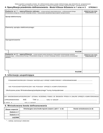 NaleŜy wypełnić w przypadku wniosku dot. dofinansowania zakupu sprzętu elektronicznego, jego elementów lub oprogramowania oraz szkoleń w zakresie obsługi nabytego w ramach programu sprzętu elektronicznego i oprogramowania 4. Specyfikacja przedmiotu dofinansowania - Moduł I/Obszar B/Zadanie nr 1 oraz nr 2 Z ad an ie n r 1 - sp ecyf ikacja z aku p u STRONA 5 ORIENTACYJNA CENA brutto (kwota w zł) - p roszę wymienić sprzęt elektroniczny, o dofinansowanie którego Wnioskodawca ubiega się w ramach niniejszego wniosku – nazwy sprzętu specjalistycznego/urządzeń/ oprogramowania: Sprzęt elektroniczny: Elementy sprzętu elektronicznego: Oprogramowanie: R AZ E M Z ad an ie n r 2 - sp ecyf ikacja - p roszę wymienić zakres tematyczny i liczbę godzin wnioskowanego szkolenia komputerowego, o dofinansowanie którego Wnioskodawca ubiega się w ramach niniejszego wniosku, nazwę podmiotu prowadzącego szkolenie ORIENTACYJNA CENA brutto (kwota w zł) R AZ E M 5. Informacje uzupełniające POSIADAM/PODOPIECZNY POSIADA* NASTĘPUJĄCY SPRZĘT KOMPUTEROWY I OPROGRAMOWANIE: ............................... ...................................................................................................................................................................................... NIE POSIADAM/PODOPIECZNY NIE POSIADA* SPRZĘTU KOMPUTEROW EGO Ukończone przez Wnioskodawcę/podopiecznego* kursy komputerowe: ........................................................ ..................................................................................................................................................................... CZY WNIOSKODAWCA/PODOPIECZNY* UZYSKAŁ WCZEŚNIEJ POMOC ZE ŚRODKÓW PFRON W ZAKUPIE SPRZĘTU KOMPUTEROWEGO i OPROGRAMOWANIA: NIE T AK w . . . . . . . . . . . . r o k u w r a m a c h . . . . . . . . . . . . . . . . . . . . . . . . . . . . . . . . . . . . . . . . . . . . . . . . . . . . . . . . . . . . . . . . . . . . a takŜe w .................... roku w ramach ........................................................................................................... 6. Wnioskowana kwota dofinansowania Obszar wsparcia* Orientacyjna cena brutto łącznie (razem z pkt 4 – w zł) Zadanie nr 1 Zadanie nr 2 ŁĄCZNIE * - naleŜy zaznaczyć właściwe Kwota wnioskowana (w zł) Oświadczam, Ŝe: ST RO NA 6 1. o wnioskowane w ramach niniejszego wniosku dofinansowanie ze środków PFRON, ubiegam się wyłącznie za pośrednictwem samorządu ..................... tak - nie, 2. informacje podane we wniosku i załącznikach są zgodne z prawdą oraz przyjmuję do wiadomości, Ŝe podanie przez Wnioskodawcę informacji niezgodnych z prawdą, eliminuje wniosek z dalszego rozpatrywania, 3. zapoznałam(em) się z zasadami udzielania pomocy w ramach pilotaŜowego programu „Aktywny samorząd”, które przyjmuję do wiadomości i stosowania oraz przyjęłam(em) do wiadomości, Ŝe tekst programu jest dostępny pod adresem: www.pfron.org.pl, a takŜe:................................................................ 4. w okresie ostatnich 3 lat uzyskałam(em) pomoc ze środków PFRON (w tym za pośrednictwem powiatu) na zakup sprzętu elektronicznego, jego elementów lub oprogramowania: tak - nie, 5. posiadam środki finansowe na pokrycie udziału własnego w zakupie wnioskowanego sprzętu elektronicznego i/lub jego elementów i/lub oprogramowania (w zaleŜności od wysokości przyznanej pomocy finansowej – co najmniej 10% ceny brutto sprzętu elektronicznego i/lub jego elementów i/lub oprogramowania), 6. przyjmuję do wiadomości i stosowania, iŜ złoŜenie niniejszego wniosku o dofinansowanie nie gwarantuje uzyskania pomocy w ramach realizacji programu oraz, Ŝe warunkiem zawarcia umowy dofinansowania jest spełnianie warunków uczestnictwa określonych w programie takŜe w dniu podpisania umowy, 7. przyjmuję do wiadomości i stosowania, Ŝe ewentualne wyjaśnienia, uzupełnienia zapisów lub brakujących załączników do wniosku naleŜy dostarczyć niezwłocznie, w terminie wyznaczonym przez Realizatora programu oraz, Ŝe prawidłowo zaadresowana korespondencja, która pomimo dwukrotnego awizowania nie zostanie odebrana, uznawana będzie za doręczoną, 8. w ciągu ostatnich 3 lat byłem(am) stroną umowy dofinansowania ze środków PFRON i rozwiązanej z przyczyn leŜących po mojej stronie: tak - nie, 9. przyjmuję do wiadomości i stosowania, iŜ w przypadku przyznanego dofinansowania, przelanie środków finansowych PFRON następuje na rachunek sprzedawcy przedmiotu zakupu, na podstawie przedstawionej i podpisanej przez Wnioskodawcę faktury VAT. Wnioskodawca nie mogący pisać, lecz mogący czytać, zamiast podpisu moŜe uczynić na dokumencie tuszowy odcisk palca, a obok tego odcisku inna osoba wypisze jej imię i nazwisko umieszczając swój podpis; zamiast Wnioskodawcy moŜe takŜe podpisać się inna osoba, z tym Ŝe jej podpis musi być poświadczony przez notariusza lub wójta (burmistrza, prezydenta miasta), starostę lub marszałka województwa z zaznaczeniem, Ŝe podpis został złoŜony na Ŝyczenie nie mogącego pisać, lecz mogącego czytać. ................................. dnia ....../ ....../ 20... r. ................................ podpis Wnioskodawcy 7. Załączniki wymagane do wniosku oraz dodatkowe (wiersze 7-12) WYPEŁNIA WYŁĄCZNIE REALIZATOR (naleŜy zaznaczyć właściwe) Nazwa załącznika 1. Kserokopia aktualnego orzeczenia o znacznym stopniu niepełnosprawności lub orzeczenia równowaŜnego albo orzeczenia o niepełnosprawności podopiecznego (osoby do 16 roku Ŝycia) 2. Oświadczenie o wysokości średnich miesięcznych dochodów w przeliczeniu na jednego członka rodziny pozostającego we wspólnym gospodarstwie domowym (sporządzone wg wzoru określonego w załączniku nr 1do formularza wniosku) 3. Zaświadczenie wydane przez lekarza specjalistę zawierające opis rodzaju schorzenia będącego przyczyną orzeczenia o stopniu niepełnos