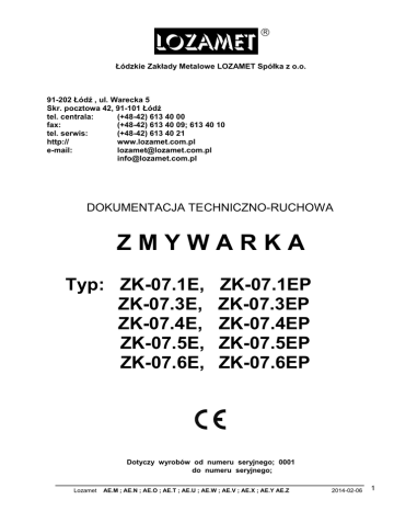 LOZAMEt Łódzkie Zakłady Metalowe LOZAMET Spółka z o.o. 91-202 Łódź , ul. Warecka 5 Skr. pocztowa 42, 91-101 Łódź tel. centrala: (+48-42) 613 40 00 fax: (+48-42) 613 40 09; 613 40 10 tel. serwis: (+48-42) 613 40 21 http:// www.lozamet.com.pl e-mail: [email protected] [email protected] DOKUMENTACJA TECHNICZNO-RUCHOWA ZMYWARKA Typ: ZK-07.1E, ZK-07.3E, ZK-07.4E, ZK-07.5E, ZK-07.6E, ZK-07.1EP ZK-07.3EP ZK-07.4EP ZK-07.5EP ZK-07.6EP Dotyczy wyrobów od numeru seryjnego; 0001 do numeru seryjnego; Lozamet AE.M ; AE.N ; AE.O ; AE.T ; AE.U ; AE.W ; AE.V ; AE.X ; AE.Y AE.Z 2014-02-06 1 SPIS TREŚCI 1 strona CHARAKTERYSTYKA ZMYWARKI 3 1.1 Zastosowanie zmywarki 3 1.2 Wykonanie zmywarki 3 1.3 Charakterystyka techniczna zmywarki 4 Ogólny opis zmywarki 1.5 Panel sterowniczy zmywarki 2 5 6 INSTRUKCJA MONTAŻU 7 2.1 Ustawienie zmywarki w pomieszczeniu 7 2.2 Rozpakowanie zmywarki 7 2.3 Przyłączenie do instalacji elektrycznej, wodnej i kanalizacyjnej. 7 2.3.1 2.3.2 2.3.3 2.3.4 3 Przyłączenie do instalacji elektrycznej. Przyłączenie do instalacji wodnej Przyłączenie do instalacji kanalizacyjnej Podłączenie do zbiorników ze środkami myjącymi i płuczącymi 7 8 9 10 INSTRUKCJA OBSŁUGI 3.1 3.1.1 3.1.2 3.1.3 3.2 3.3 3.3.1 3.3.2 3.4 3.4.1 3.4.2 3.4.3 3.5 11 Przygotowanie zmywarki do pracy 11 Ogólny przegląd zmywarki Napełnianie płynem układu dozownika płynu płuczącego Napełnianie zbiornika komory mycia 11 11 12 Próbny rozruch Uruchamianie programów użytkowych zmywarki 12 12 Uruchamianie programów mycia i płukania Uruchamianie programu samooczyszczania i opróżniania 12 14 Czynności podczas pracy 14 Przygotowanie naczyń i koszy Czynności podczas zmywania Czynności po zakończeniu zmywania 14 18 18 Uwagi eksploatacyjne 18 Środki myjące i płuczące oraz ich dozowanie Dozownik płynu płuczącego i jego regulacja Dozownik płynu myjącego i jego regulacja 18 20 20 4 WSKAZANIA BEZPIECZEŃSTWA I HIGIENY PRACY 21 5 INSTRUKCJA KONSERWACJI I NAPRAWY 22 3.5.1 3.5.2 3.5.3 5.1 Konserwacja bieżąca 22 5.2 Konserwacja okresowa 22 5.3 Naprawy i remonty 23 5.4 Wykaz możliwych usterek i zalecane sposoby naprawy 23 6 WYPOSAŻENIE STANDARDOWE I DODATKOWE 25 6.1 Wyposażenie standardowe 25 6.2 Wyposażenie dodatkowe 25 7 WYKAZ CZĘŚCI ZAMIENNYCH 26 8 WYKAZ RYSUNKÓW I SCHEMATÓW 28 9 SCHEMATY ELEKTRYCZNE 36 2 Lozamet AE.M ; AE.N ; AE.O ; AE.T ; AE.U ; AE.W ; AE.V ; AE.X ; AE.Y AE.Z 2014-02-06 1 CHARAKTERYSTYKA ZMYWARKI 1.1 Zastosowanie zmywarki Zmywarki typoszeregu ZK-07 przeznaczone są do zmywania talerzy, zastawy stołowej oraz tac w zakładach zbiorowego żywienia. Zmywarka jest urządzeniem półautomatycznym, obsługa jej ogranicza się do wkładania i wyjmowania kosza z naczyniami i włączenia odpowiedniego programu. 1.2 Wykonanie zmywarki Dostępne są dwa typy zmywarek: - ZK- 07.E bez pompy spustowej, - ZK- 07.EP z pampą spustową. Dla każdego typu dostępne są wersję zmywarki o różnych mocach grzałki podgrzewacza wody: - ZK-07.1E, ZK-07.1EP, ZK- 07.4E, ZK- 07.4EP jednofazowa 1N ~ 230V, 50Hz, o mocy grzałki 3,35kW, przeznaczona wyłącznie do zasilania wodą ciepłą 55°C, ZK-07.3E, ZK-07.3EP, ZK- 07.5E, ZK- 07.5EP trójfazowa 3N ~ 400V, 50Hz, o mocy grzałki 4.2kW, zalecana do zasilania wodą ciepłą 55°C, ZK- 07.6E i ZK- 07.6EP trójfazowa 3N ~ 400V, 50Hz, o mocy grzałki 6.0kW, zalecana do zasilania wodą zimną 15 ‚20°C. Zmywarki jednofazowe ZK-07.1E, ZK-07.1EP, ZK- 07.4E, ZK-07.4EP należy zasilać wyłącznie wodą ciepłą. W przypadku zasilania wodą zimną zmywarka nie osiągnie odpowiedniej temperatury płukania i będzie sygnalizowała błąd (miganie lampki L2) Zmywarki ZK-07.3E, ZK-07.3EP, ZK- 07.5E, ZK- 07.5EP, ZK- 07.6E, ZK- 07.6EP można zasilać wodą ciepła lub zimną. W zależności od temperatury wody zasilającej zmienia się wydajność użytkowa zmywarek. Temperatura wody płukania – wyparzania zmywarki nastawiona jest na 90ºC. TABLICA 1 WERSJA ZMYWARKI ZASILANIE ELEKTRYCZNE ZK-07.1E 1N ~ 230V, 50Hz MOC GRZAŁKI ILOŚĆ PODGRZEWACZA PROGRAMÓW 3.35kW 1 ZK-07.3E 3N ~ 400V, 50Hz ZK-07.1EP 1N ~ 230V, 50Hz 4.2kW 180 sek. 3.35kW 1 ZK-07.3EP 3N ~ 400V, 50Hz ZK-07.4E 1N ~ 230V, 50Hz 4.2kW 3.35kW ZK-07.5E 3N ~ 400V, 50Hz 4.2kW ZK-07.6E 3N ~ 400V, 50Hz 6.0kW ZK-07.4EP 1N ~ 230V, 50Hz 3.35kW ZK-07.5EP 3N ~ 400V, 50Hz 4.2kW ZK-07.6EP 3N ~ 400V, 50Hz 6.0kW Lozamet 195 sek. 3 120 sek. 180 sek. 600 sek. 3 135 sek. 195 sek. 615 sek. WYKONANIE PODSTAWOWE OPCJA NA ZAMÓWIENIE - Dozownik płynu płuczącego - Dozownik płynu płuczącego - Pompa spustowa - Dozownik płynu myjącego - Dozownik płynu - Dozownik płynu myjącego, płuczącego - Pompa podnosząca ciśnienie wody zasilającej - Dozownik płynu - Dozownik płynu płuczącego myjącego, - Pompa - Pompa podnosząca spustowa ciśnienie wody zasilającej AE.M ; AE.N ; AE.O ; AE.T ; AE.U ; AE.W ; AE.V ; AE.X ; AE.Y AE.Z 2014-02-06 3 1.3 Charakterystyka techniczna zmywarki TABLICA 2 DANE TECHNICZNE ZK-07.1E ZK-07.4E ZK-07.3E ZK-07.5E ZK-07.6E A 3,9 1N ~230V 50Hz 17 4,75 3N ~400V 50Hz 13,7 6,55 3N ~400V 50Hz 13,7 3,9 1N ~230V 50Hz 17 4,75 3N ~400V 50Hz 13,7 6,55 3N ~400V 50Hz 13,7 A 25 16 16 25 16 16 WERSJE WYKONANIA ZK-07.1EP ZK-07.3EP ZK-07.4EP ZK-07.5EP ZK-07.6EP ZASILANIE ELEKTRYCZNE Znamionowy pobór mocy Zasilanie elektryczne – przewód o długości 2,5m bez wtyczki Prąd znamionowy Wymagane zabezpieczenie instalacji elektrycznej ZASILANIE WODĄ kW Ciśnienie wody zasilającej MPa Przyłączenie wody – wąż gumowy 2,5 mb ‘’ Zalecana temperatura wody zasilającej Ciepła Zimna Gwint zewnętrzny G ¾ (DN20) 55 55 55 55 55 55 Nd. 15‚20 15‚20 Nd. 15‚20 15‚20 °N Rodzaj odprowadzenia Średnica węża mm WYMIARY Głębokość zmyw. zamkniętej mm Szerokość mm Wysokość - regulowana mm Wysokość prześwitu drzwi mm Wymiary kosza mm MASA Masa zmywarki kg ZBIORNIK WODY MYJĄCEJ Moc grzejnika wody myjącej kW Pojemność zbiornika dm³ Temperatura wody myjącej °C ZBIORNIK WODY