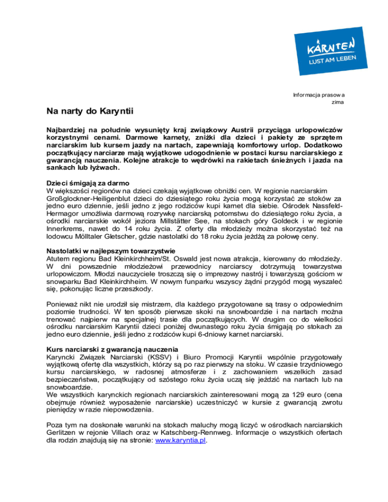 Infor macja prasow a zima Na narty do Karyntii Najbardziej na południe wysunięty kraj związkowy Austrii przyciąga urlopowiczów korzystnymi cenami. Darmowe karnety, zniżki dla dzieci i pakiety ze sprzętem narciarskim lub kursem jazdy na nartach, zapewniają komfortowy urlop. Dodatkowo początkujący narciarze mają wyjątkowe udogodnienie w postaci kursu narciarskiego z gwarancją nauczenia. Kolejne atrakcje to wędrówki na rakietach śnieżnych i jazda na sankach lub łyżwach. Dzieci śmigają za darmo W większości regionów na dzieci czekają wyjątkowe obniżki cen. W regionie narciarskim Großglockner-Heiligenblut dzieci do dziesiątego roku życia mogą korzystać ze stoków za jedno euro dziennie, jeśli jedno z jego rodziców kupi karnet dla siebie. Ośrodek NassfeldHermagor umożliwia darmową rozrywkę narciarską potomstwu do dziesiątego roku życia, a ośrodki narciarskie wokół jeziora Millstätter See, na stokach góry Goldeck i w regionie Innerkrems, nawet do 14 roku życia. Z oferty dla młodzieży można skorzystać też na lodowcu Mölltaler Gletscher, gdzie nastolatki do 18 roku życia jeżdżą za połowę ceny. Nastolatki w najlepszym towarzystwie Atutem regionu Bad Kleinkirchheim/St. Oswald jest nowa atrakcja, kierowany do młodzieży. W dni powszednie młodzieżowi przewodnicy narciarscy dotrzymują towarzystwa urlopowiczom. Młodzi nauczyciele troszczą się o imprezowy nastrój i towarzyszą gościom w snowparku Bad Kleinkirchheim. W nowym funparku wszyscy żądni przygód mogą wyszaleć się, pokonując liczne przeszkody. Ponieważ nikt nie urodził się mistrzem, dla każdego przygotowane są trasy o odpowiednim poziomie trudności. W ten sposób pierwsze skoki na snowboardzie i na nartach można trenować najpierw na specjalnej trasie dla początkujących. W drugim co do wielkości ośrodku narciarskim Karyntii dzieci poniżej dwunastego roku życia śmigają po stokach za jedno euro dziennie, jeśli jedno z rodziców kupi 6-dniowy karnet narciarski. Kurs narciarski z gwarancją nauczenia Karyncki Związek Narciarski (KSSV) i Biuro Promocji Karyntii wspólnie przygotowały wyjątkową ofertę dla wszystkich, którzy są po raz pierwszy na stoku. W czasie trzydniowego kursu narciarskiego, w radosnej atmosferze i z zachowaniem wszelkich zasad bezpieczeństwa, początkujący od szóstego roku życia uczą się jeździć na nartach lub na snowboardzie. We wszystkich karynckich regionach narciarskich zainteresowani mogą za 129 euro (cena obejmuje również wyposażenie narciarskie) uczestniczyć w kursie z gwarancją zwrotu pieniędzy w razie niepowodzenia. Poza tym na doskonałe warunki na stokach maluchy mogą liczyć w ośrodkach narciarskich Gerlitzen w rejonie Villach oraz w Katschberg-Rennweg. Informacje o wszystkich ofertach dla rodzin znajdują się na stronie: www.karyntia.pl. Więcej informacji na www.karyntia.pl lub poprzez kontakt z: Karen Kretschmann/Anja Höbler STROMBERGER PR Haydnstraße 1 D – 80336 Monachium T +49(0)89/189478-79 F +49(0)89/189478-70 [email protected] www.strombergerpr.de Sabine Weyrer Kärnten Werbung GmbH Casinoplatz 1 A – 9220 Velden T +43(0)4274/52100-16 F +43(0)4274/52100-60 [email protected] www.presse.kaernten.at