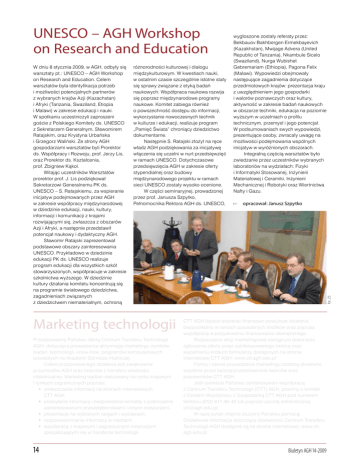 UNESCO – AGH Workshop on Research and Education różnorodności kulturowej i dialogu międzykulturowym. W kwestiach nauki, w ostatnim czasie szczególnie istotne stały się sprawy związane z etyką badań naukowych. Współpraca naukowa rozwija się poprzez międzynarodowe programy naukowe. Komitet zabiega również o powszechność dostępu do informacji, wykorzystanie nowoczesnych technik w kulturze i edukacji, realizuje program „Pamięć Świata” chroniący dziedzictwo dokumentarne. Następnie S. Ratajski złożył na ręce władz AGH podziękowania za inicjatywę włączenia się uczelni w nurt przedsięwzięć w ramach UNESCO. Dotychczasowe przedsięwzięcia AGH w zakresie oferty stypendialnej oraz budowy międzynarodowego projektu w ramach sieci UNESCO zostały wysoko ocenione. W części seminaryjnej, prowadzonej przez prof. Janusza Szpytko, Pełnomocnika Rektora AGH ds. UNESCO, Marketing technologii Przedstawiamy Państwu ofertę Centrum Transferu Technologii AGH, dotyczącą prowadzenia aktywnego marketingu wyników badań, technologii, know-how, programów komputerowych powstałych na Akademii Górniczo-Hutniczej. Celem proponowanego działania jest zwiększenie przychodów AGH oraz twórców z transferu własności intelektualnej. Marketing będzie realizowany na rynku krajowym i rynkach zagranicznych poprzez: umieszczanie informacji na stronach internetowych CTT AGH, przesyłanie informacji i bezpośrednie kontakty z potencjalnie zainteresowanymi przedsiębiorstwami i innymi instytucjami, prezentacje na wybranych targach i wystawach, rozpowszechnienie informacji w mediach, współpracę z krajowymi i zagranicznymi instytucjami specjalizującymi się w transferze technologii. 14 opracował: Janusz Szpytko fot. ZS W dniu 8 stycznia 2009, w AGH, odbyły się warsztaty pt.: UNESCO – AGH Workshop on Research and Education. Celem warsztatów była identyfikacja potrzeb i możliwości potencjalnych partnerów z wybranych krajów Azji (Kazachstan) i Afryki (Tanzania, Swaziland, Etiopia i Malawi) w zakresie edukacji i nauki. W spotkaniu uczestniczyli zaproszeni goście z Polskiego Komitety ds. UNESCO z Sekretarzem Generalnym, Sławomirem Ratajskim, oraz Krystyna Urbańska i Grzegorz Waliński. Ze strony AGH gospodarzami warsztatów byli Prorektor ds. Współpracy i Rozwoju, prof. Jerzy Lis, oraz Prorektor ds. Kształcenia, prof. Zbigniew Kąkol. Witając uczestników Warsztatów prorektor prof. J. Lis podziękował Sekretarzowi Generalnemu PK ds. UNESCO – S. Ratajskiemu, za wspieranie inicjatyw podejmowanych przez AGH w zakresie współpracy międzynarodowej w dziedzinie edukacji, nauki, kultury, informacji i komunikacji z krajami rozwijającymi się, zwłaszcza z obszarów Azji i Afryki, a następnie przedstawił potencjał naukowy i dydaktyczny AGH. Sławomir Ratajski zaprezentował podstawowe obszary zainteresowania UNESCO. Przykładowo w dziedzinie edukacji PK ds. UNESCO realizuje program edukacji dla wszystkich szkół stowarzyszonych, współpracuje w zakresie szkolnictwa wyższego. W dziedzinie kultury działania komitetu koncentrują się na programie światowego dziedzictwa, zagadnieniach związanych z dziedzictwem niematerialnym, ochroną wygłoszone zostały referaty przez: Bekbauov Bakhbergen Ermekbayevich (Kazakhstan), Mwijage Advera (United Republic of Tanzania), Nkambule Sicelo (Swaziland), Nurga Wubishet Gebremariam (Ethiopia), Pagona Felix (Malawi). Wypowiedzi obejmowały następujące zagadnienia dotyczące przedmiotowych krajów: prezentacja kraju z uwzględnieniem jego gospodarki i walorów poznawczych oraz kultury, aktywność w zakresie badań naukowych w obszarze techniki, edukacja na poziomie wyższym w uczelniach o profilu technicznym, przemysł i jego potencjał. W podsumowaniach swych wypowiedzi, prezentujące osoby, zwracały uwagę na możliwości podejmowania wspólnych inicjatyw w wyróżnionych obszarach. Integralną częścią warsztatów było zwiedzanie przez uczestników wybranych laboratoriów na wydziałach: Fizyki i Informatyki Stosowanej, Inżynierii Materiałowej i Ceramiki, Inżynierii Mechanicznej i Robotyki oraz Wiertnictwa Nafty i Gazu. CTT AGH będzie wspierać finansowo powyższe działania, bezpośrednio w ramach posiadanych środków oraz poprzez współpracę w pozyskiwaniu finansowania zewnętrznego. Rozpoczęcie akcji marketingowej nastąpi po dokonaniu zgłoszenia oferty przez zainteresowanego twórcę oraz wypełnieniu krótkich formularzy dostępnych na stronie internetowej CTT AGH: www.ctt.agh.edu.pl. Formy i zakres prowadzenia marketingu zostaną określone wspólnie przez twórcę/przedstawiciela twórców oraz pracowników CTT AGH. Jeśli jesteście Państwo zainteresowani współpracą z Centrum Transferu Technologii (CTT) AGH, prosimy o kontakt z Działem Współpracy z Gospodarką CTT AGH pod numerem telefonu (012) 617-46-42 lub poprzez pocztę elektroniczną: [email protected]. W razie pytań chętnie służymy Państwu pomocą. Dodatkowe informacje dotyczące działalności Centrum Transferu Technologii AGH dostępne są na stronie internetowej: www.ctt. agh.edu.pl. Biuletyn AGH 14-2009