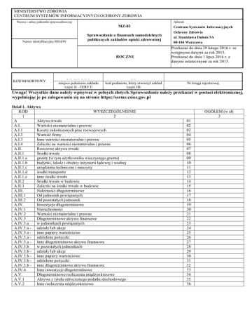 MINISTERSTWO ZDROWIA CENTRUM SYSTEMÓW INFORMACYJNYCH OCHRONY ZDROWIA Nazwa i adres jednostki sprawozdawczej Adresat: MZ-03 Numer identyfikacyjny REGON Sprawozdanie o finansach samodzielnych publicznych zakładów opieki zdrowotnej ROCZNE KOD RESORTOWY —— —— ——— miejsce położenia zakładu /część II –TERYT/ —— kod podmiotu, który utworzył zakład /część III/ Centrum Systemów Informacyjnych Ochrony Zdrowia ul. Stanisława Dubois 5A 00-184 Warszawa Przekazać do dnia 29 lutego 2016 r. ze wstępnymi danymi za rok 2015. Przekazać do dnia 1 lipca 2016 r. z danymi ostatecznymi za rok 2015. Nr księgi rejestrowej Uwaga! Wszystkie dane należy wpisywać w pełnych złotych. Sprawozdanie należy przekazać w postaci elektronicznej, wypełniając je po załogowaniu się na stronie https://ssrmz.csioz.gov.pl Dział 1. Aktywa KOD WYSZCZEGÓLNIENIE 1 2 A Aktywa trwałe A.I. Wartości niematerialne i prawne A.I.1 Koszty zakończonych prac rozwojowych A.I.2 Wartość firmy A.I.3 Inne wartości niematerialne i prawne A.I.4 Zaliczki na wartości niematerialne i prawne A.II. Rzeczowe aktywa trwałe A.II.1 Środki trwałe A.II.1.a grunty (w tym użytkownika wieczystego gruntu) A.II.1.b budynki, lokale i obiekty inżynierii lądowej i wodnej A.II.1.c urządzenia techniczne i maszyny A.II.1.d środki transportu A.II.1.e inne środki trwałe A.II.2 Środki trwałe w budowie A.II.3 Zaliczki na środki trwałe w budowie A.III. Należności długoterminowe A.III.1 Od jednostek powiązanych A.III.2 Od pozostałych jednostek A.IV. Inwestycje długoterminowe A.IV.1 Nieruchomości A.IV.2 Wartości niematerialne i prawne A.IV.3 Długoterminowe aktywa finansowe A.IV.3.a w jednostkach powiązanych A.IV.3.a - udziały lub akcje A.IV.3.a - inne papiery wartościowe A.IV.3.a - udzielone pożyczki A.IV.3.a - inne długoterminowe aktywa finansowe A.IV.3.b w pozostałych jednostkach A.IV.3.b - udziały lub akcje A.IV.3.b - inne papiery wartościowe A.IV.3.b - udzielone pożyczki A.IV.3.b - inne długoterminowe aktywa finansowe A.IV.4 Inne inwestycje długoterminowe A.V. Długoterminowe rozliczenia międzyokresowe A.V.1 Aktywa z tytułu odroczonego podatku dochodowego A.V.2 Inne rozliczenia międzyokresowe OGÓŁEM (w zł) 3 01 02 03 04 05 06 07 08 09 10 11 12 13 14 15 16 17 18 19 20 21 22 23 24 25 26 27 28 29 30 31 32 33 34 35 36 Ciąg dalszy działu 1. B. Aktywa obrotowe B.I. Zapasy B.I.1 Materiały B.I.2 Półprodukty i produkty w toku B.I.3 Produkty gotowe B.I.4 Towary B.I.5 Zaliczki na dostawy B.II. Należności krótkoterminowe B.II.1 Należności od jednostek powiązanych B.II.1.a z tytułu dostaw i usług, o okresie spłaty: B.II.1.a do 12 miesięcy B.II.1.a powyżej 12 miesięcy B.II.1.b Inne B.II.2 Należności od pozostałych jednostek B.II.2.a z tytułu dostaw i usług, o okresie spłaty: B.II.2.ado 12 miesięcy B.II.2.a powyżej 12 miesięcy B.II.2.b z tytułu podatków, dotacji, ceł, ubezpieczeń społecznych i zdrowotnych oraz innych świadczeń B.II.2.c Inne B.II.2.d dochodzone na drodze sądowej B.III. Inwestycje krótkoterminowe B.III.1 Krótkoterminowe aktywa finansowe B.III.1.a w jednostkach powiązanych B.III.1.a - udziały lub akcje B.III.1.a - inne papiery wartościowe B.III.1.a - udzielone pożyczki B.III.1.a - inne krótkoterminowe aktywa finansowe B.III.1.b w pozostałych jednostkach B.III.1.b - udziały lub akcje B.III.1.b - inne papiery wartościowe B.III.1.b - udzielone pożyczki B.III.1.b - inne krótkoterminowe aktywa finansowe B.III.1.c środki pieniężne i inne aktywa pieniężne B.III.1.c - środki pieniężne w kasie i na rachunkach B.III.1.c - inne środki pieniężne B.III.1.c - inne aktywa pieniężne B.III.2 Inne inwestycje krótkoterminowe B.IV. Krótkoterminowe rozliczenia międzyokresowe AKTYWA RAZEM 37 38 39 40 41 42 43 44 45 46 47 48 49 50 51 52 53 54 55 56 57 58 59 60 61 62 63 64 65 66 67 68 69 70 71 72 73 74 75 Dział 2. Pasywa KOD WYSZCZEGÓLNIENIE 1 2 A. Kapitał (fundusz) własny A.I. Kapitał (fundusz) podstawowy A.II. Należne wpłaty na kapitał podstawowy (wielkość ujemna) A.III. Udziały (akcje) własne (wielkość ujemna) A.IV. Kapitał (fundusz) zapasowy A.V. Kapitał (fundusz) z aktualizacji wyceny A.VI. Pozostałe kapitały (fundusze) rezerwowe A.VII. Zysk (strata) z lat ubiegłych A.VII.1 Zysk (wielkość dodatnia) A.VII.2 Strata (wielkość ujemna) A.VIII. Zysk (strata) netto A.VIII.1 Zysk (wielkość dodatnia) A.VIII.2 Strata (wielkość ujemna) A.IX. Odpisy z zysku netto w ciągu roku obrotowego (wielkość ujemna) B Zobowiązania i rezerwy na zobowiązania B.I Rezerwy na zobowiązania B.I.1 Rezerwa z tytułu odroczonego podatku dochodowego B.I.2 Rezerwa na świadczenia emerytalne i podobne B.I.2. długoterminowa B.I.2 krótkoterminowa B.I.3 Pozostałe rezerwy B.I.3. długoterminowe B.I.3. krótkoterminowe B.II Zobowiązania długoterminowe B.II.1 Wobec jednostek powiązanych B.II.2 Wobec pozostałych jednostek B.II.2.a kredyty i pożyczki B.II.2.b z tytułu emisji dłużnych papierów wartościowych B.II.2.c inne zobowiązania finansowe B.II.2.d Inne B.III Zobowiązania krótkoterminowe B.III.1 Wobec jednostek powiązanych B.III.1.a z tytułu dostaw i usług, o okresie wymagalności: B.III.1.a. - do 12 miesięcy B.III.1.a. - powyżej 12 miesięcy B.III.1.b inne B.III.2 Wobec pozostałych jednostek B.III.2.a kredyty i pożyczki B.III.2.b z tytułu emisji dłużnych papierów wartościowych B.III.2.c inne zobowiązania finansowe B.III.2.d z tytułu dostaw i usług, o okresie wymagalności: B.III.2.d. - do 12 miesięcy B.III.2.d. - powyżej 12 miesięcy B.III.2.e zaliczki otrzymane na dostawy B.III.2.f zobowiązania wekslowe B.III.2.g z tytułu podatków, ceł, ubezpieczeń i innych świadczeń B.III.2.h z tytułu wynagrodzeń B.III.2.i inne B.III.3 Fundusze specjalne w tym zakładowy fundusz świadczeń socjalnych (ZFŚS) B.IV. Rozliczenia międzyokresowe B.IV.1 Ujemna wartość firmy B.IV.2 Inne rozliczenia międzyokresowe B.IV.2.