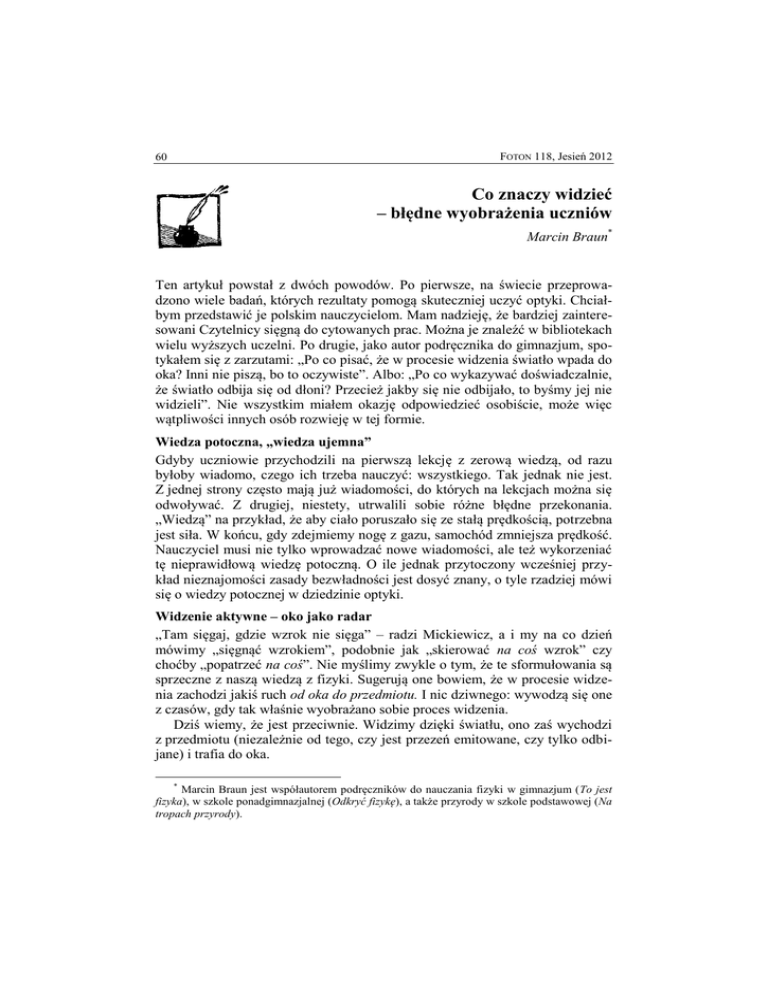 FOTON 118, Jesień 2012 60 Co znaczy widzieć – błędne wyobrażenia uczniów Marcin Braun* Ten artykuł powstał z dwóch powodów. Po pierwsze, na świecie przeprowadzono wiele badań, których rezultaty pomogą skuteczniej uczyć optyki. Chciałbym przedstawić je polskim nauczycielom. Mam nadzieję, że bardziej zainteresowani Czytelnicy sięgną do cytowanych prac. Można je znaleźć w bibliotekach wielu wyższych uczelni. Po drugie, jako autor podręcznika do gimnazjum, spotykałem się z zarzutami: „Po co pisać, że w procesie widzenia światło wpada do oka? Inni nie piszą, bo to oczywiste”. Albo: „Po co wykazywać doświadczalnie, że światło odbija się od dłoni? Przecież jakby się nie odbijało, to byśmy jej nie widzieli”. Nie wszystkim miałem okazję odpowiedzieć osobiście, może więc wątpliwości innych osób rozwieję w tej formie. Wiedza potoczna, „wiedza ujemna” Gdyby uczniowie przychodzili na pierwszą lekcję z zerową wiedzą, od razu byłoby wiadomo, czego ich trzeba nauczyć: wszystkiego. Tak jednak nie jest. Z jednej strony często mają już wiadomości, do których na lekcjach można się odwoływać. Z drugiej, niestety, utrwalili sobie różne błędne przekonania. „Wiedzą” na przykład, że aby ciało poruszało się ze stałą prędkością, potrzebna jest siła. W końcu, gdy zdejmiemy nogę z gazu, samochód zmniejsza prędkość. Nauczyciel musi nie tylko wprowadzać nowe wiadomości, ale też wykorzeniać tę nieprawidłową wiedzę potoczną. O ile jednak przytoczony wcześniej przykład nieznajomości zasady bezwładności jest dosyć znany, o tyle rzadziej mówi się o wiedzy potocznej w dziedzinie optyki. Widzenie aktywne – oko jako radar „Tam sięgaj, gdzie wzrok nie sięga” – radzi Mickiewicz, a i my na co dzień mówimy „sięgnąć wzrokiem”, podobnie jak „skierować na coś wzrok” czy choćby „popatrzeć na coś”. Nie myślimy zwykle o tym, że te sformułowania są sprzeczne z naszą wiedzą z fizyki. Sugerują one bowiem, że w procesie widzenia zachodzi jakiś ruch od oka do przedmiotu. I nic dziwnego: wywodzą się one z czasów, gdy tak właśnie wyobrażano sobie proces widzenia. Dziś wiemy, że jest przeciwnie. Widzimy dzięki światłu, ono zaś wychodzi z przedmiotu (niezależnie od tego, czy jest przezeń emitowane, czy tylko odbijane) i trafia do oka. * Marcin Braun jest współautorem podręczników do nauczania fizyki w gimnazjum (To jest fizyka), w szkole ponadgimnazjalnej (Odkryć fizykę), a także przyrody w szkole podstawowej (Na tropach przyrody). FOTON 118, Jesień 2012 61 Ten fakt bywa często traktowany jako tak oczywisty, że nie trzeba nawet o nim pisać w podręcznikach ani mówić na lekcji. Nic bardziej błędnego! Dopóki uczniowie nie dowiedzą się, na czym naprawdę polega widzenie, ich wyobrażenia są takie, jak przed wiekami – i jak to sugeruje język potoczny. Na początku lat dziewięćdziesiątych przeprowadzono w Polsce badania opisane w pracy [1]. Pytano w nich uczniów m.in. „jak to się dzieje, że widzisz trzymany w ręku długopis”. Z częścią uczniów (36 osób przed nauczaniem optyki i 24 po zakończeniu tego działu) przeprowadzono dłuższe wywiady, aby lepiej zrozumieć ich odpowiedzi. Okazało się, że prawidłowe wyjaśnienie przedstawiło prawie 2/3 uczniów po kursie optyki i ani jeden przed tym kursem. Niestety, grupa uczniów rozumujących błędnie była spora. Aż 19% uczniów przed nauczaniem optyki uważało, że jakiś promień lub impuls wychodzi z oka do przedmiotu, a następnie wraca do oka. Tak więc wyobrażali sobie oni nasz narząd wzroku jako rodzaj radaru. A teraz najciekawsza – i najbardziej niepokojąca – wiadomość. Wśród uczniów, którzy już się uczyli optyki, taki pogląd prezentowało więcej osób, bo aż 25%. Na marginesie wspomnijmy, że z całą książką, w której znajduje się praca [1], warto zapoznać się z jeszcze jednego powodu. Otóż słyszymy coraz częściej, jak wysoki poziom fizyki mieliśmy dawniej i jak strasznie spadł on w ostatnich latach. Gdy zamiast polegać na własnej pamięci zajrzymy do wyników badań, okaże się, że w „dawnych dobrych czasach” wcale nie było tak różowo. Poziom był wysoki w programach nauczania i podręcznikach, ale nie w głowach uczniów. Oko jako radar Wróćmy jednak do problemu z mechanizmem widzenia. Dotyczy on nie tylko Polski. Podobne wyniki otrzymali badacze w wielu krajach (niektóre z nich omówiono w pracach [1] i [2]). Oprócz zwolenników „aktywnego widzenia” wśród uczniów można znaleźć i takich, którzy wiedzą, że światło musi paść na przedmiot, nie rozumieją jednak, że następnie musi się ono odbić i trafić do oka. Według nich bieg światła kończy się na przedmiocie, który zmienia właściwości – staje się oświetlony i dzięki temu widoczny. Inni z kolei uważają, że światło jest potrzebne po to, aby oświetlić oko. Wreszcie niektórzy uważają, że „widzimy po prostu dlatego, że mamy oczy” i nie dostrzegają związku widzenia ze światłem. Skąd ta sytuacja? Autorzy pracy [2] piszą: Oko wspominane jest w podręcznikach w kontekście urządzeń optycznych, jako przykład „gadżetu” z zastosowaniem soczewki, wśród innych przyrządów optycznych. (...) W nauczaniu optyki często przyjmuje się za oczywisty fakt, że światło musi wpaść do oka, aby nastąpiło widzenie. Rzadko zauważa się, że ucznia trzeba do tego przekonać. 62 FOTON 118, Jesień 2012 Czy kartka odbija światło? Skoro uczniowie nie kojarzą widzenia z odbiciem światła, to możliwość zobaczenia dłoni czy kartki papieru wcale nie jest dla nich dowodem na to, że światło odbija się od tych ciał. Dzieci na ogół sądzą, że światło odbija się tylko od zwierciadła, bo światłem odbitym od zwierciadła można coś oświetlić. Przeglądanie się w zwierciadle wcale nie musi być dla dziecka dowodem n