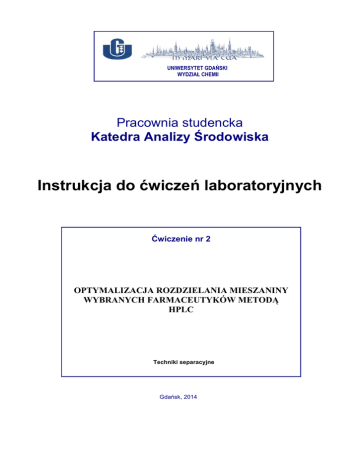 UNIWERSYTET GDAŃSKI WYDZIAŁ CHEMII Pracownia studencka Katedra Analizy Środowiska Instrukcja do ćwiczeń laboratoryjnych Ćwiczenie nr 2 OPTYMALIZACJA ROZDZIELANIA MIESZANINY WYBRANYCH FARMACEUTYKÓW METODĄ HPLC Techniki separacyjne Gdańsk, 2014 Optymalizacja rozdzielania mieszaniny wybranych farmaceutyków metodą HPLC 2 1. Wprowadzenie Układ faz odwróconych to taki układ, w którym faza stacjonarna jest mniej polarna niż faza ruchoma. Poza C18, w układach RP mogą być stosowane również inne typy faz stacjonarnych np. C8, rzadziej C2, jak również żel modyfikowany grupa cyjanową lub fenylową. W każdym przypadku kolejność elucji jest następująca: pierwsze eluują substancje polarne (hydrofilowe) a w dalszej kolejności substancje niepolarne (hydrofobowe). Rozpuszczalniki stosowane jako fazy ruchome w układach RP wg ich siły elucyjnej to woda (najsłabszy) < MeOH< ACN < EtOH < THF < iPrOH. W praktyce najczęściej stosuje się 4 rozpuszczalniki w różnych układach tj. wodę, metanol, acetonitryl i tetrahydrofuran, a parametry retencji mogą być regulowane składem fazy ruchomej. Podstawowa zależność to wzrost zawartości rozpuszczalnika bardziej polarnego w fazie ruchomej obniża wartość współczynnika retencji (k). Przy założeniu stałej siły elucyjnej fazy ruchomej korzysta się z prostej zależności: ST = Ʃ Siqi gdzie: ST – całkowita siła elucyjna fazy ruchomej, Si – siła elucyjna rozpuszczalnika qi – udział molowy rozpuszczalnika w fazie ruchomej. Dobór warunków rozdzielania jest procesem trudnym i pracochłonnym. Podstawowe zasady doboru składu eluentu w układach faz odwróconych są następujące: • przeprowadzić rozdzielenie na kolumnie C8 lub C18 z fazą ruchomą o dużej sile elucyjnej, • zmniejszając zawartość modyfikatora organicznego doprowadzić do takich warunków, aby zakres wartości k substancji mieścił się w przedziale 0,5 – 20, • w razie konieczności poprawić selektywność przez zmianę rodzaju modyfikatora organicznego, • jeżeli stopień rozdzielenia jest niezadowalający, zmienić pH fazy ruchomej lub typ wypełnienia kolumny. Jeżeli w badanej mieszaninie znajdują się substancję o różnych właściwościach sorpcyjnych (znacznie różniących się retencją) stosowana jest elucja gradientowa. Początkowy skład fazy ruchomej, powinien zapewnić rozdzielenie składników o słabej retencji, nie powodując jednak zbędnej straty czasu i rozpuszczalników. Elucję gradientową powinno się prowadzić do takiego składu fazy ruchomej i do takiej siły elucyjnej końcowego eluatu, aby zapewnić wymycie wszystkich składników mieszaniny w czasie trwania programu elucji. Optymalizacja rozdzielania mieszaniny wybranych farmaceutyków metodą HPLC 3 W przypadku zastosowania typowego układu faz odwróconych do rozdzielania mieszanin zawierających związki tak polarne jak kwasy lub zasady organiczne problemem może okazać się zbyt słaba retencja tych związków. Istnieje kilka możliwości rozwiązania tego problemu: • zmiana typu chromatografii na jonowymienną, • zmiana pH fazy ruchomej, • zastosowanie bardziej polarnej fazy ruchomej, • dodatek do fazy ruchomej elektrolitu, umożliwiającego utworzenie pary jonowej. Leki stosowane przeciwko bakteriom czy grzybom mają różne mechanizmy działania, np. sulfonamidy czy trimetoprim hamują syntezę kwasu foliowego. Dla wzmocnienia oddziaływania na mikroorganizmy często stosuje się jednocześnie trimetoprim wraz z sulfonamidami m.in. sulfadiazyną, sulfadoksyną, sulfametaksazolem, sulfametazyną, sulfadimetoksyną. Kombinację wybranych leków stosuje się nieprzypadkowo. Wzmocnienie działania jest spowodowane tym, że oba farmaceutyki blokują metabolizm kwasu foliowego, ale w inny sposób: sulfonamidy hamują wbudowywanie kwasu para-aminobenzoesowego (PABA) do powstającej cząsteczki kwasu dihydrofoliowego w komórkach bakterii, natomiast trimetoprim blokuje powstanie kwasu tetrahydrofoliowego poprzez zahamowanie enzymu reduktazy kwasu dihydrofoliowego. Tabela 1. Wzory wybranych sulfonamidów Optymalizacja rozdzielania mieszaniny wybranych farmaceutyków metodą HPLC 4 2. Cel ćwiczenia Celem ćwiczenia jest dobór optymalnych warunków rozdzielenia wybranych sulfonamidów w układzie faz odwróconych oraz analiza jakościowa sulfonamidów w próbce wody. 3. Wykonanie ćwiczenia Z roztworów podstawowych sulfamerazyny, sulfadimetoksyny i sulfametoksazolu o stężeniu 500 ppm przygotować roztwory robocze o stężeniu 50 i 10 ppm. Do rozcieńczenia używać mieszaniny wody i acetonitrylu (90:10, v/v). Z każdego roztworu roboczego o stężeniu 50 ppm pobrać po 200 µl i przenieść do naczynka chromatograficznego, a następnie uzupełnić do 1 ml mieszaniną wody i acetonitrylu (90:10, v/v). 3.1. Warunki analizy: kolumna Gemini C18 (Phenomenex, 4,6 mm x 150 mm, średnica ziarna 5 µm), długość fali 270 nm. przepływ fazy ruchomej przez kolumnę - 0,5 ml/min, Korzystając z dostępnych rozpuszczalników (woda/woda z dodatkiem TFA (0,0025%, v/v), acetonitryl, metanol) przygotować fazę ruchomą o wybranym przez studentów składzie. Po konsultacji z prowadzącym wykonać analizę HPLC próbki zawierającej mieszaninę sulfonamidów. Ocenić wynik rozdzielenia. Przygotować drugą fazę ruchomą zmieniając proporcje rozpuszczalników użyte do przygotowania fazy pierwszej. Ponownie wykonać analizę próbki zawierającej mieszaninę sulfonamidów. Ocenić wynik rozdzielenia. W razie konieczności (niewystarczające rozdzielenie sygnałów) przygotować kolejną fazę ruchomą o innym składzie. Jeśli wynik rozdzielenia będzie wystarczający wykonać analizę trzech roztworów wzorcowych o stężeniu 10 ppm. Na podstawie czasów retencji ustalić kolejność elucji farmaceutyków. Jeśli wynik rozdzielenia był niewystarczający zastosować kolejną fazę ruchomą, aż do uzyskania rozdzielenia analitów. W optymalizacji rozdzi