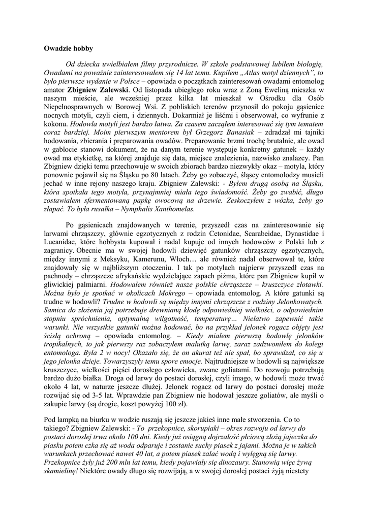 Owadzie hobby Od dziecka uwielbiałem filmy przyrodnicze. W szkole podstawowej lubiłem biologię, Owadami na poważnie zainteresowałem się 14 lat temu. Kupiłem „Atlas motyl dziennych”, to było pierwsze wydanie w Polsce – opowiada o początkach zainteresowań owadami entomolog amator Zbigniew Zalewski. Od listopada ubiegłego roku wraz z Żoną Eweliną mieszka w naszym mieście, ale wcześniej przez kilka lat mieszkał w Ośrodku dla Osób Niepełnosprawnych w Borowej Wsi. Z pobliskich terenów przynosił do pokoju gąsienice nocnych motyli, czyli ciem, i dziennych. Dokarmiał je liśćmi i obserwował, co wyfrunie z kokonu. Hodowla motyli jest bardzo łatwa. Za czasem zacząłem interesować się tym tematem coraz bardziej. Moim pierwszym mentorem był Grzegorz Banasiak – zdradzał mi tajniki hodowania, zbierania i preparowania owadów. Preparowanie brzmi trochę brutalnie, ale owad w gablocie stanowi dokument, że na danym terenie występuje konkretny gatunek – każdy owad ma etykietkę, na której znajduje się data, miejsce znalezienia, nazwisko znalazcy. Pan Zbigniew dzięki temu przechowuje w swoich zbiorach bardzo niezwykły okaz – motyla, który ponownie pojawił się na Śląsku po 80 latach. Żeby go zobaczyć, śląscy entomolodzy musieli jechać w inne rejony naszego kraju. Zbigniew Zalewski: - Byłem drugą osobą na Śląsku, która spotkała tego motyla, przynajmniej miała tego świadomość. Żeby go zwabić, długo zostawiałem sfermentowaną papkę owocową na drzewie. Zeskoczyłem z wózka, żeby go złapać. To była rusałka – Nymphalis Xanthomelas. Po gąsienicach znajdowanych w terenie, przyszedł czas na zainteresowanie się larwami chrząszczy, głównie egzotycznych z rodzin Cetonidae, Scarabeidae, Dynastidae i Lucanidae, które hobbysta kupował i nadal kupuje od innych hodowców z Polski lub z zagranicy. Obecnie ma w swojej hodowli dziewięć gatunków chrząszczy egzotycznych, między innymi z Meksyku, Kamerunu, Włoch… ale również nadal obserwował te, które znajdowały się w najbliższym otoczeniu. I tak po motylach najpierw przyszedł czas na pachnody – chrząszcze afrykańskie wydzielające zapach piżma, które pan Zbigniew kupił w gliwickiej palmiarni. Hodowałem również nasze polskie chrząszcze – kruszczyce złotawki. Można było je spotkać w okolicach Mokrego – opowiada entomolog. A które gatunki są trudne w hodowli? Trudne w hodowli są między innymi chrząszcze z rodziny Jelonkowatych. Samica do złożenia jaj potrzebuje drewnianą kłodę odpowiedniej wielkości, o odpowiednim stopniu spróchnienia, optymalną wilgotność, temperaturę… Niełatwo zapewnić takie warunki. Nie wszystkie gatunki można hodować, bo na przykład jelonek rogacz objęty jest ścisłą ochroną – opowiada entomolog. – Kiedy miałem pierwszą hodowlę jelonków tropikalnych, to jak pierwszy raz zobaczyłem malutką larwę, zaraz zadzwoniłem do kolegi entomologa. Była 2 w nocy! Okazało się, że on akurat też nie spał, bo sprawdzał, co się u jego jelonka dzieje. Towarzyszyły temu spore emocje. Najtrudniejsze w hodowli są największe kruszczyce, wielkości pięści dorosłego człowieka, zwane goliatami. Do rozwoju potrzebują bardzo dużo białka. Droga od larwy do postaci dorosłej, czyli imago, w hodowli może trwać około 4 lat, w naturze jeszcze dłużej. Jelonek rogacz od larwy do postaci dorosłej może rozwijać się od 3-5 lat. Wprawdzie pan Zbigniew nie hodował jeszcze goliatów, ale myśli o zakupie larwy (są drogie, koszt powyżej 100 zł). Pod lampką na biurku w wodzie ruszają się jeszcze jakieś inne małe stworzenia. Co to takiego? Zbigniew Zalewski: - To przekopnice, skorupiaki – okres rozwoju od larwy do postaci dorosłej trwa około 100 dni. Kiedy już osiągną dojrzałość płciową złożą jajeczka do piasku potem czka się aż woda odparuje i zostanie suchy piasek z jajami. Można je w takich warunkach przechować nawet 40 lat, a potem piasek zalać wodą i wylęgną się larwy. Przekopnice żyły już 200 mln lat temu, kiedy pojawiały się dinozaury. Stanowią więc żywą skamielinę! Niektóre owady długo się rozwijają, a w swojej dorosłej postaci żyją niestety dosyć krótko, jedynym celem staje się pozostawienie potomków – wiele gatunków dużych chrząszczy egzotycznych żyje do pół roku, jest gatunek polskiego motyla z rodziny koszówek który żyje zaledwie trzy godziny: jeżeli nie spotka się w tym krótkim czasie z samcem, ona sama się zapłodni i umrze po złożeniu jaj. Swoją pasję i płynącą z niej wiedzę mój rozmówca przekazuje najmłodszym. Od lipca ubiegłego roku prowadzi spotkania z dziećmi na Uniwersytecie Zabawy w Chorzowie, podczas których opowiada o owadach. Kiedy mieszkał w Borowej Wsi wraz z żoną tworzyli pogotowie przeróżnych stworzeń. Jeżeli ktoś złapał jakiegoś owada i nie wiedział, co z nim zrobić przynosił do nas. Trafiały do nas także pisklęta jaskółek, które karmiliśmy, zające, jeże, potem prosiliśmy, żeby strażnicy miejscy zawozili je do Pogotowia Leśnego na Kamionce – dodaje żona Ewelina. Osobiście zachęcam mieszkańców Łazisk, że jeżeli spotkają jakiegoś owada i nie będą wiedzieli, co z nim zrobić, albo będą chcieli się czegoś więcej o nim dowiedzieć, żeby kontaktowali się ze mną – proponuje pan Zbigniew. I jeszcze ciekawostka… Owady pana Zbigniewa mają za sobą… aktorski debiut. Zadzwonił kiedyś do mnie Wojciech Doroszuk i chciał, żeby moje owady zagrały w jego filmie – miały biegać po stole. Na potrzeby filmu dokupiłem modliszkę. Film ma być gotowy w lutym, więc mam nadzieję, że zobaczę efekty – zdradza miłośnik owadów. Pan Zbigniew bierze modliszkę na rękę, która z wielkim zainteresowaniem kręci główką i patrzy na mnie niczym człowiek. I jeszcze jedno pytanie do entomologa: czy nadaje imiona swoim owadom… Nie, nie nazywam ich. To dlatego, 