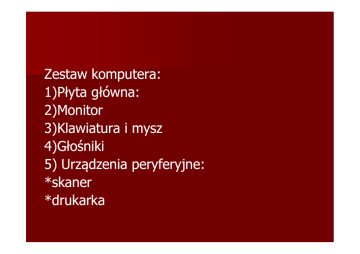 Zestaw komputera: 1)Płyta główna: 2)Monitor 3)Klawiatura i mysz 4)Głośniki 5) Urządzenia peryferyjne: *skaner *drukarka Płyta główna (ang. motherboard) – najważniejsza płyta drukowana urządzenia elektronicznego, na której zamontowano najważniejsze elementy urządzenia, umożliwiająca komunikację wszystkim pozostałym komponentom i modułom. 1)Do płyty głównej zaliczamy: -procesor -pamięć operacyjną -gniazda, karty rozszerzające np. PCI -zasilacz *urządzenia składujące: -dysk twardy -napęd optyczny *urządzenia zewnętrzne: -port szeregowy -port równoległy -USB -złącze klawiatury i myszy Procesor Procesor (ang. processor) nazywany często CPU (ang. Central Processing Unit) - urządzenie cyfrowe sekwencyjne potrafiące pobierać dane z pamięci, interpretować je i wykonywać jako rozkazy. Wykonuje on bardzo szybko ciąg prostych operacji (rozkazów) wybranych ze zbioru operacji podstawowych określonych zazwyczaj przez producenta procesora jako lista rozkazów procesora. Pamięć operacyjna Pamięć operacyjna (eng. internal memory, Primary storage). Jest to pamięć adresowana i dostępna bezpośrednio przez procesor, a nie przez urządzenia wejścia--wyjścia procesora. W pamięci tej mogą być wejścia umieszczane rozkazy (kody operacji) programu dostępnego bezpośrednio przez procesor i stąd nazwa pamięć operacyjna. W Polsce często pamięć ta jest utożsamiana z pamięcią RAM, choć jest to zawężenie pojęcia, pamięcią operacyjną jest też pamięć nieulotna czyli (ROM, EPROM i inne jej odmiany) dostępna bezpośrednio przez procesor. Obecnie pamięci operacyjne są wyłącznie pamięciami elektronicznymi. Gniazda, karty rozszerzenia PCI (ang. Peripheral Component Interconnect) - to zespół linii oraz układów przełączających służących do przesyłania sygnałów między połączonymi urządzeniami. W komputerach jest rodzajem "autostrady", którą dane przenoszą się pomiędzy poszczególnymi elementami komputera. Jest to element, który sprawia, że system komputerowy staje się określoną całością. Służy do przyłączania urządzeń do płyty głównej w komputerach klasy PC. Zasilacz Zasilacz – Urządzenie służące do dopasowania dostępnego napięcia do wymagań zasilanego urządzenia. Ze względu na sposób zmiany wielkości napięcia wyróżnić można: zasilacze transformatorowe, transformatorowe, w których elementem dopasowującym jest transformator zasilacze beztransformatorowe dopasowujące napięcie przy użyciu różnego rodzaju układów elektronicznych. Ze względu na jakość napięcia wyjściowego wyróżnia się: zasilacze stabilizowane, stabilizowane, w których napięcie utrzymywane jest na stałym poziomie zasilacze niestabilizowane, niestabilizowane, w których napięcie na wyjściu może ulegać zmianie Zasilacze budowane są jako uniwersalne lub specjalizowane do konkretnych zastosowań, np.: zasilacz komputera Urządzenia składujące Dysk twardy – jeden z typów urządzeń pamięci masowej, wykorzystujących nośnik magnetyczny do przechowywania danych. Nazwa "dysk twardy" (hard disk drive) powstała w celu odróżnienia tego typu urządzeń od tzw. "dysków miękkich", czyli dyskietek, w których nośnik magnetyczny naniesiono na elastyczne podłoże, a nie jak w dysku twardym na sztywne. Dysk optycznyoptyczny- to jeden z rodzajów nośników informacji używany w systemach komputerowych do zapisu danych. Dysk optyczny jest płaskim, plastikowym krążkiem pokrytym materiałem, na którym mogą być zapisywane bity informacji w postaci fragmentów dobrze i słabo odbijających wiązkę światła. Do pamięci optycznych zalicza się:, Laser Disc, CD , DVD, BluBlu-ray, HD DVD, HD VMD Urządzenia zewnętrzne: Port szeregowy (ang. Serial Port) - port komputerowy, przez który dane są przekazywane w formie jednego ciągu bitów. Port ten jest zwykle zaopatrzony w specjalny układ o nazwie UART, który tłumaczy ciągi bitów na bajty i na odwrót Port równoległy (ang. Parallel Port) - to port w technice komputerowej, w którym dane są przesyłane jednocześnie kilkoma przewodami, z których każdy przenosi jeden bit informacji. Przeciwieństwem portu równoległego jest port szeregowy. USB (ang. Universal Serial Bus - uniwersalna magistrala szeregowa) to opracowany przez firmy Microsoft, Intel, Compaq, IBM, DEC rodzaj portu komunikacyjnego komputerów, zastępującego stare porty szeregowe i porty równoległe. Port USB jest uniwersalny, pozwala na podłączanie do komputera wielu urządzeń, na przykład: kamery wideo, aparatu fotograficznego, modemu, skanera lub drukarki. Urządzenia są automatycznie wykrywane i rozpoznawane przez system, co umożliwia ich podłączanie i odłączanie bez konieczności wyłączania czy ponownego uruchamiania komputera. Monitor komputerowy Monitor- to ogólna nazwa jednego z urządzenia Monitorwyjścia do bezpośredniej komunikacji operatora z komputerem. Zadaniem monitora jest natychmiastowa wizualizacja wyników pracy komputera. Obecnie używany jest monitor czyli ekran komputerowy, obsługiwany przez komputer zwykle za pośrednictwem karty graficznej. Podłączany jest najczęściej do gniazda 1515-pinowego DD-Sub. Do monitora sygnały przesyłane są w postaci analogowej. Synchroskop Dalekopis Elektryczna maszyna do pisania Monitor CRT Monitor LCD Klawiatura jest to uporządkowany zestaw klawiszy służący do ręcznego sterowania urządzeniem lub ręcznego wprowadzania danych. Mysz (ang. mouse) – urządzenie wskazujące używane podczas pracy z interfejsem graficznym systemu komputerowego. Mysz umożliwia poruszanie kursorem po ekranie komputera poprzez przesuwanie jej po powierzchni płaskiej. Najczęściej wyposażona jest w kółko do przewijania ekranu. Głośnik - przetwornik elektroakustyczny. Urządzenie elektryczne przekształcające sygnał elektryczny w falę akustyczną. Idealny głośnik przekształca zmienne napięcie elektryczne o odpowi