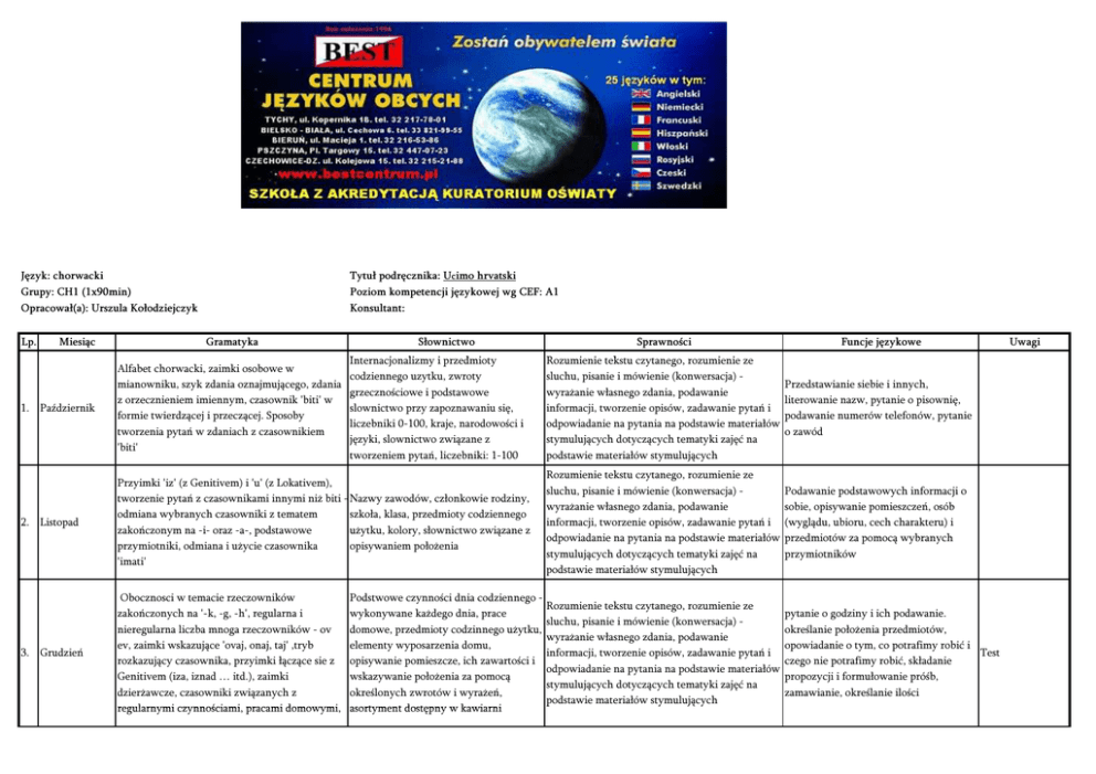 Język: chorwacki Grupy: CH1 (1x90min) Opracował(a): Urszula Kołodziejczyk Lp. Miesiąc Tytuł podręcznika: Ucimo hrvatski Poziom kompetencji językowej wg CEF: A1 Konsultant: Gramatyka Słownictwo Internacjonalizmy i przedmioty codziennego uzytku, zwroty grzecznościowe i podstawowe slownictwo przy zapoznawaniu się, liczebniki 0-100, kraje, narodowości i języki, slownictwo związane z tworzeniem pytań, liczebniki: 1-100 Sprawności Funcje językowe Rozumienie tekstu czytanego, rozumienie ze sluchu, pisanie i mówienie (konwersacja) wyrażanie własnego zdania, podawanie informacji, tworzenie opisów, zadawanie pytań i odpowiadanie na pytania na podstawie materiałów stymulujących dotyczących tematyki zajęć na podstawie materiałów stymulujących Przedstawianie siebie i innych, literowanie nazw, pytanie o pisownię, podawanie numerów telefonów, pytanie o zawód 1. Październik Alfabet chorwacki, zaimki osobowe w mianowniku, szyk zdania oznajmującego, zdania z orzecznieniem imiennym, czasownik 'biti' w formie twierdzącej i przeczącej. Sposoby tworzenia pytań w zdaniach z czasownikiem 'biti' 2. Listopad Przyimki 'iz' (z Genitivem) i 'u' (z Lokativem), tworzenie pytań z czasownikami innymi niż biti - Nazwy zawodów, członkowie rodziny, odmiana wybranych czasowniki z tematem szkoła, klasa, przedmioty codziennego zakończonym na -i- oraz -a-, podstawowe użytku, kolory, słownictwo związane z przymiotniki, odmiana i użycie czasownika opisywaniem położenia 'imati' Rozumienie tekstu czytanego, rozumienie ze sluchu, pisanie i mówienie (konwersacja) wyrażanie własnego zdania, podawanie informacji, tworzenie opisów, zadawanie pytań i odpowiadanie na pytania na podstawie materiałów stymulujących dotyczących tematyki zajęć na podstawie materiałów stymulujących Podawanie podstawowych informacji o sobie, opisywanie pomieszczeń, osób (wyglądu, ubioru, cech charakteru) i przedmiotów za pomocą wybranych przymiotników 3. Grudzień Obocznosci w temacie rzeczowników zakończonych na '-k, -g, -h', regularna i nieregularna liczba mnoga rzeczowników - ov ev, zaimki wskazujące 'ovaj, onaj, taj' ,tryb rozkazujący czasownika, przyimki łączące sie z Genitivem (iza, iznad … itd.), zaimki dzierżawcze, czasowniki związanych z regularnymi czynnościami, pracami domowymi, Rozumienie tekstu czytanego, rozumienie ze sluchu, pisanie i mówienie (konwersacja) wyrażanie własnego zdania, podawanie informacji, tworzenie opisów, zadawanie pytań i odpowiadanie na pytania na podstawie materiałów stymulujących dotyczących tematyki zajęć na podstawie materiałów stymulujących pytanie o godziny i ich podawanie. określanie położenia przedmiotów, opowiadanie o tym, co potrafimy robić i Test czego nie potrafimy robić, składanie propozycji i formułowanie próśb, zamawianie, określanie ilości Podstwowe czynności dnia codziennego wykonywane każdego dnia, prace domowe, przedmioty codzinnego użytku, elementy wyposarzenia domu, opisywanie pomieszcze, ich zawartości i wskazywanie położenia za pomocą określonych zwrotów i wyrażeń, asortyment dostępny w kawiarni Uwagi 4. Styczeń 5. Luty 6. Marzec 7. Kwiecień Porównania - stopniowanie przymiotników, czasowniki moći, morati, voljeti i żeljeti, htjeti, przemiszczaniem się typu 'ići', ich rekcja oraz powiązane wyrazy, przysłówki "częstotliwości" Opisywanie swoich zainteresowań, hobby i zwyczajów, opis ustny i pisemny swojego dnia, zadawanie pytań dotyczących codziennych czynności, Rozumienie tekstu czytanego, rozumienie ze Dni tygodnia, miesiące, pory roku i obowiązków domowych, pytanie o cenę, zwiazane z nimi aktywnosci i rodzaje sluchu, pisanie i mówienie (konwersacja) kupno i sprzedaż, rozmowa o krajobrazu, kierunki świata, przymiotniki wyrażanie własnego zdania, podawanie kupowanych produktach, dialogi w opisujące miejsca, słownictwo związane z informacji, tworzenie opisów, zadawanie pytań i restauracji i sklepie, opisywanie miejsca, Test zawodami i wykonywaniem różnych odpowiadanie na pytania na podstawie materiałów w którym mieszkamy, opowiadanie o zawodów (rozwinięcie), obowiązki i stymulujących dotyczących tematyki zajęć na czynnościach wykonywanych w sposoby spędzania czasu wolnego, zakupy podstawie materiałów stymulujących wolnym czasie, wyrażanie obowiązku, przymusu chęci, opowiadanie o ulubionych filmach, książkach, piosenkarzach, itd., opowiadanie o tym, co lubimy i czego nie lubimy Pozostałe, niepoznane dotąd, przypaki przymiotnika i rzeczownika, odmiana zaimków 'tko' i 'sto' - pytania do przypadkow, wybrane czaswoaniki 3 koniugacji, odmiana zaimkow osobowych Rozumienie tekstu czytanego, rozumienie ze sluchu, pisanie i mówienie (konwersacja) Miasto, przyimki miejsca, środki Pytanie o droge i jej wskazywanie, wyrażanie własnego zdania, podawanie transportu, pytanie o drogę i jej informacji, tworzenie opisów, zadawanie pytań i orientacja w mieście, powtórzenie wskazywanie, miejsca, obiekty w mieście odpowiadanie na pytania na podstawie materiałów dotychczasowych umiejętności i wiedzy (rozwinięcie i powtórzenie) stymulujących dotyczących tematyki zajęć na podstawie materiałów stymulujących Rozumienie tekstu czytanego, rozumienie ze sluchu, pisanie i mówienie (konwersacja) wyrażanie własnego zdania, podawanie Opowiadanie ważnych wydarzeń ze informacji, tworzenie opisów, zadawanie pytań i swojego życia i historii. odpowiadanie na pytania na podstawie materiałów stymulujących dotyczących tematyki zajęć na podstawie materiałów stymulujących Czas przeszły czasownika "biti" i innych podstawowych czasowników Liczebniki porządkowe, rozmowy o przszłości, historii i obyczajach Czas przeszły rozwinięcie - zadawanie pytań i przeczenie, tryb przypuszczający czasownika, konstrukcje z użyciem 'ako' i 'kad' Rozumienie tekstu czytanego, rozumienie ze sluchu, pisanie i mówienie (konwersacja) wyrażanie wł
