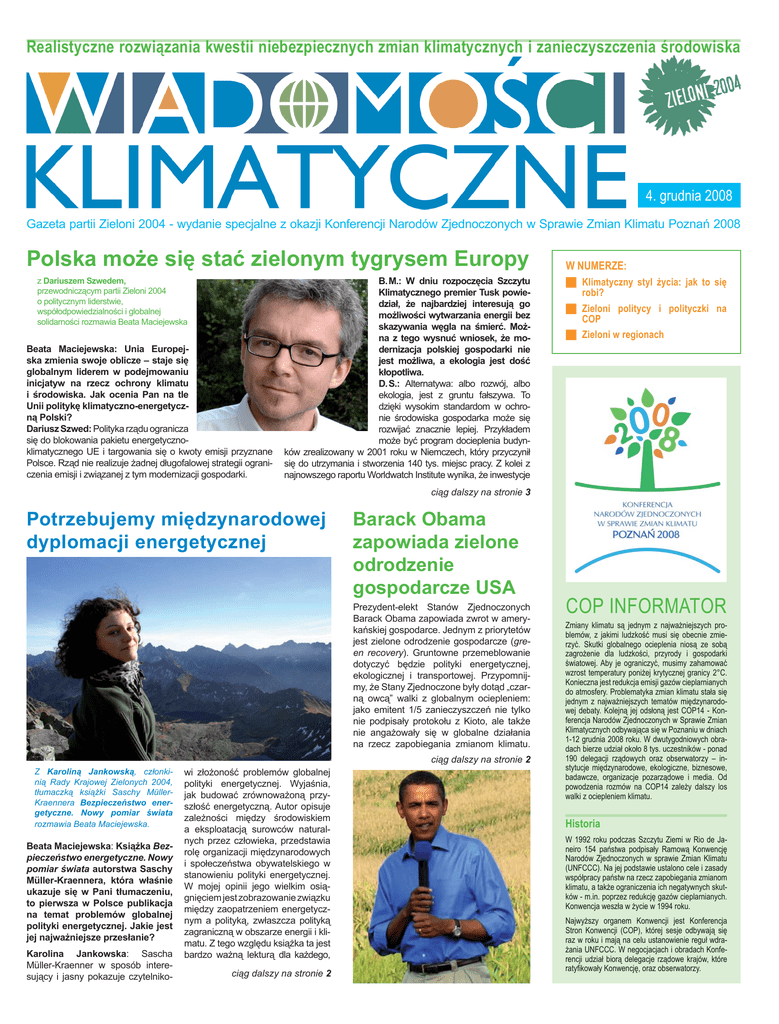 Realistyczne rozwiązania kwestii niebezpiecznych zmian klimatycznych i zanieczyszczenia środowiska 4. grudnia 2008 Gazeta partii Zieloni 2004 - wydanie specjalne z okazji Konferencji Narodów Zjednoczonych w Sprawie Zmian Klimatu Poznań 2008 Polska może się stać zielonym tygrysem Europy z Dariuszem Szwedem, przewodniczącym partii Zieloni 2004 o politycznym liderstwie, współodpowiedzialności i globalnej solidarności rozmawia Beata Maciejewska Beata Maciejewska: Unia Europejska zmienia swoje oblicze – staje się globalnym liderem w podejmowaniu inicjatyw na rzecz ochrony klimatu i środowiska. Jak ocenia Pan na tle Unii politykę klimatyczno-energetyczną Polski? Dariusz Szwed: Polityka rządu ogranicza się do blokowania pakietu energetycznoklimatycznego UE i targowania się o kwoty emisji przyznane Polsce. Rząd nie realizuje żadnej długofalowej strategii ograniczenia emisji i związanej z tym modernizacji gospodarki. B. M.: W dniu rozpoczęcia Szczytu Klimatycznego premier Tusk powiedział, że najbardziej interesują go możliwości wytwarzania energii bez skazywania węgla na śmierć. Można z tego wysnuć wniosek, że modernizacja polskiej gospodarki nie jest możliwa, a ekologia jest dość kłopotliwa. D. S.: Alternatywa: albo rozwój, albo ekologia, jest z gruntu fałszywa. To dzięki wysokim standardom w ochronie środowiska gospodarka może się rozwijać znacznie lepiej. Przykładem może być program docieplenia budynków zrealizowany w 2001 roku w Niemczech, który przyczynił się do utrzymania i stworzenia 140 tys. miejsc pracy. Z kolei z najnowszego raportu Worldwatch Institute wynika, że inwestycje W NUMERZE: J Klimatyczny styl życia: jak to się robi? J Zieloni politycy i polityczki na COP J Zieloni w regionach ciąg dalszy na stronie 3 Potrzebujemy międzynarodowej dyplomacji energetycznej Barack Obama zapowiada zielone odrodzenie gospodarcze USA Prezydent-elekt Stanów Zjednoczonych Barack Obama zapowiada zwrot w amerykańskiej gospodarce. Jednym z priorytetów jest zielone odrodzenie gospodarcze (green recovery). Gruntowne przemeblowanie dotyczyć będzie polityki energetycznej, ekologicznej i transportowej. Przypomnijmy, że Stany Zjednoczone były dotąd „czarną owcą” walki z globalnym ociepleniem: jako emitent 1/5 zanieczyszczeń nie tylko nie podpisały protokołu z Kioto, ale także nie angażowały się w globalne działania na rzecz zapobiegania zmianom klimatu. ciąg dalszy na stronie 2 Z Karoliną Jankowską, członkinią Rady Krajowej Zielonych 2004, tłumaczką książki Saschy MüllerKraennera Bezpieczeństwo energetyczne. Nowy pomiar świata rozmawia Beata Maciejewska. Beata Maciejewska: Książka Bezpieczeństwo energetyczne. Nowy pomiar świata autorstwa Saschy Müller-Kraennera, która właśnie ukazuje się w Pani tłumaczeniu, to pierwsza w Polsce publikacja na temat problemów globalnej polityki energetycznej. Jakie jest jej najważniejsze przesłanie? Karolina Jankowska: Sascha Müller-Kraenner w sposób interesujący i jasny pokazuje czytelniko- wi złożoność problemów globalnej polityki energetycznej. Wyjaśnia, jak budować zrównoważoną przyszłość energetyczną. Autor opisuje zależności między środowiskiem a eksploatacją surowców naturalnych przez człowieka, przedstawia rolę organizacji międzynarodowych i społeczeństwa obywatelskiego w stanowieniu polityki energetycznej. W mojej opinii jego wielkim osiągnięciem jest zobrazowanie związku między zaopatrzeniem energetycznym a polityką, zwłaszcza polityką zagraniczną w obszarze energii i klimatu. Z tego względu książka ta jest bardzo ważną lekturą dla każdego, ciąg dalszy na stronie 2 COP INFORMATOR Zmiany klimatu są jednym z najważniejszych problemów, z jakimi ludzkość musi się obecnie zmierzyć. Skutki globalnego ocieplenia niosą ze sobą zagrożenie dla ludzkości, przyrody i gospodarki światowej. Aby je ograniczyć, musimy zahamować wzrost temperatury poniżej krytycznej granicy 2°C. Konieczna jest redukcja emisji gazów cieplarnianych do atmosfery. Problematyka zmian klimatu stała się jednym z najważniejszych tematów międzynarodowej debaty. Kolejną jej odsłoną jest COP14 - Konferencja Narodów Zjednoczonych w Sprawie Zmian Klimatycznych odbywająca się w Poznaniu w dniach 1-12 grudnia 2008 roku. W dwutygodniowych obradach bierze udział około 8 tys. uczestników - ponad 190 delegacji rządowych oraz obserwatorzy – instytucje międzynarodowe, ekologiczne, biznesowe, badawcze, organizacje pozarządowe i media. Od powodzenia rozmów na COP14 zależy dalszy los walki z ociepleniem klimatu. Historia W 1992 roku podczas Szczytu Ziemi w Rio de Janeiro 154 państwa podpisały Ramową Konwencję Narodów Zjednoczonych w sprawie Zmian Klimatu (UNFCCC). Na jej podstawie ustalono cele i zasady współpracy państw na rzecz zapobiegania zmianom klimatu, a także ograniczenia ich negatywnych skutków - m.in. poprzez redukcję gazów cieplarnianych. Konwencja weszła w życie w 1994 roku. Najwyższy organem Konwencji jest Konferencja Stron Konwencji (COP), której sesje odbywają się raz w roku i mają na celu ustanowienie reguł wdrażania UNFCCC. W negocjacjach i obradach Konferencji udział biorą delegacje rządowe krajów, które ratyfikowały Konwencję, oraz obserwatorzy. W 1997 roku w ramach COP3 przyjęto obowiązujący od 2005 roku Protokół z Kioto, który wyznacza cele dotyczące ograniczenia emisji gazów cieplarnianych dla krajów uprzemysłowionych, ustala mechanizmy sterujące rynkiem emisji oraz określa źródła finansowania działań adaptacyjnych. Protokół podpisało 175 państw, w tym większość krajów uprzemysłowionych oraz kraje rozwijające się, takie jak Brazylia, Chiny i Indie. Protokołu nie ratyfikowały USA. Podczas ostatniej Konferencji (COP13) na Bali w 2007 roku za najbardziej miarodajne źródło informacji o zmianach klimatycznych i ich zapobieganiu uznano pochodzący z tego samego ro