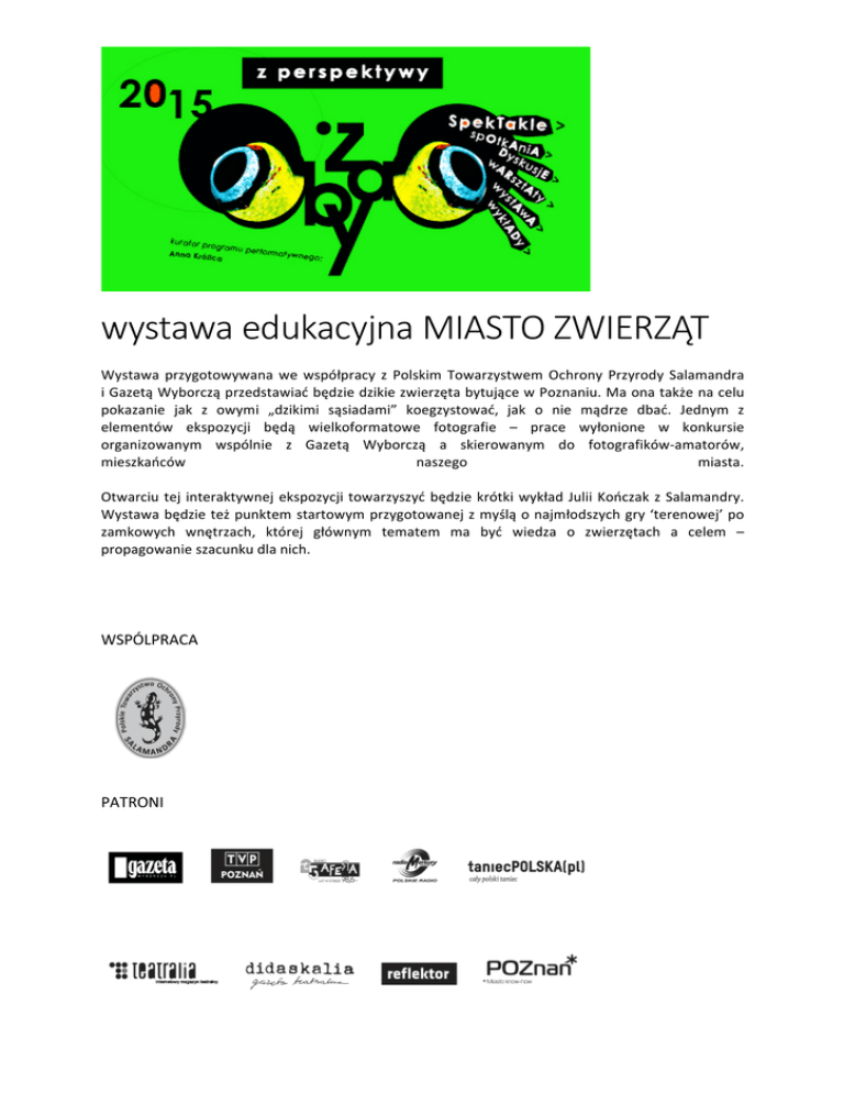 wystawa edukacyjna MIASTO ZWIERZĄT Wystawa przygotowywana we współpracy z Polskim Towarzystwem Ochrony Przyrody Salamandra i Gazetą Wyborczą przedstawiać będzie dzikie zwierzęta bytujące w Poznaniu. Ma ona także na celu pokazanie jak z owymi „dzikimi sąsiadami” koegzystować, jak o nie mądrze dbać. Jednym z elementów ekspozycji będą wielkoformatowe fotografie – prace wyłonione w konkursie organizowanym wspólnie z Gazetą Wyborczą a skierowanym do fotografików-‐amatorów, mieszkańców naszego miasta. Otwarciu tej interaktywnej ekspozycji towarzyszyć będzie krótki wykład Julii Kończak z Salamandry. Wystawa będzie też punktem startowym przygotowanej z myślą o najmłodszych gry ‘terenowej’ po zamkowych wnętrzach, której głównym tematem ma być wiedza o zwierzętach a celem – propagowanie szacunku dla nich. WSPÓLPRACA PATRONI