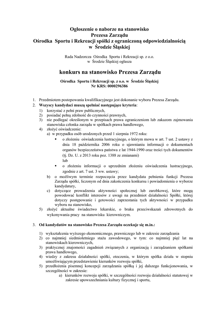 Ogłoszenie o naborze na stanowisko Prezesa Zarządu Ośrodka Sportu i Rekreacji spółki z ograniczoną odpowiedzialnością w Środzie Śląskiej Rada Nadzorcza Ośrodka Sportu i Rekreacji sp. z o.o. w Środzie Śląskiej ogłasza konkurs na stanowisko Prezesa Zarządu Ośrodka Sportu i Rekreacji sp. z o.o. w Środzie Śląskiej Nr KRS: 0000296386 1. Przedmiotem postepowania kwalifikacyjnego jest dokonanie wyboru Prezesa Zarządu. 2. Wszyscy kandydaci muszą spełniać następujące kryteria: 1) korzystać z pełni praw publicznych, 2) posiadać pełną zdolność do czynności prawnych, 3) nie podlegać określonym w przepisach prawa ograniczeniom lub zakazom zajmowania stanowiska członka zarządu w spółkach prawa handlowego, 4) złożyć oświadczenie: a) w przypadku osób urodzonych przed 1 sierpnia 1972 roku: o złożeniu oświadczenia lustracyjnego, o którym mowa w art. 7 ust. 2 ustawy z dnia 18 października 2006 roku o ujawnianiu informacji o dokumentach organów bezpieczeństwa państwa z lat 1944-1990 oraz treści tych dokumentów (tj. Dz. U. z 2013 roku poz. 1388 ze zmianami) lub o złożeniu informacji o uprzednim złożeniu oświadczenia lustracyjnego, zgodnie z art. 7 ust. 3 ww. ustawy; b) o możliwym terminie rozpoczęcia przez kandydata pełnienia funkcji Prezesa Zarządu spółki, liczonym od dnia zakończenia konkursu i powiadomienia o wyborze kandydatury, c) dotyczące prowadzenia aktywności społecznej lub zarobkowej, które mogą powodować konflikt interesów z uwagi na przedmiot działalności Spółki, której dotyczy postępowanie i gotowości zaprzestania tych aktywności w przypadku wyboru na stanowisko, 5) złożyć aktualne świadectwo lekarskie, o braku przeciwskazań zdrowotnych do wykonywania pracy na stanowisku kierowniczym. 3. Od kandydatów na stanowisko Prezesa Zarządu oczekuje się m.in.: 1) wykształcenia wyższego ekonomicznego, prawniczego lub w zakresie zarządzania 2) co najmniej siedmioletniego stażu zawodowego, w tym: co najmniej pięć lat na stanowiskach kierowniczych, 3) praktycznej znajomości zagadnień związanych z organizacją i zarządzaniem spółkami prawa handlowego, 4) wiedzy z zakresu działalności spółki, otoczenia, w którym spółka działa w stopniu umożliwiającym przedstawienie kierunków rozwoju spółki, 5) przedłożenia pisemnej koncepcji zarządzania spółką i jej dalszego funkcjonowania, w szczególności w zakresie: a) kierunków rozwoju spółki, w szczególności rozwoju działalności statutowej w zakresie upowszechniania kultury fizycznej i sportu, b) efektywnego wykorzystania zasobów spółki, w szczególności obiektów sportowo-rekreacyjnych i proponowanych kierunków inwestycji, c) proponowanych kierunków restrukturyzacji spółki w zakresie działalności niezwiązanej z upowszechnianiem kultury fizycznej i sportu d) rozwiązań organizacyjno-ekonomicznych, zmierzających do zbilansowania działalności gospodarczej spółki i wygospodarowania w przyszłości nadwyżek finansowych gwarantujących dalszy rozwój Spółki. 4. Dodatkowo preferowane będą: 1) doświadczenie na stanowiskach kierowniczych w spółkach prawa handlowego 2) doświadczenia w zarządzaniu dużymi zespołami pracowników 3) legitymowanie się zdanym egzaminem państwowym na członków rad nadzorczych spółek lub ew. ukończonym kursem dla kandydatów do rad nadzorczych i zarządów spółek 4) doświadczenie w zakresie działalności w obszarze sportu i rekreacji 5) znajomość społeczności lokalnej i jej potrzeb z zakresu sportu i rekreacji; 6) doświadczenie we współpracy z organizacjami sportowymi w zakresie upowszechniania kultury fizycznej i sportu 5. Zgłoszenie kandydata powinno zawierać: CV ze wskazaniem adresu mailowego i numerem telefonu komórkowego kandydata, list motywacyjny, kserokopie dyplomu ukończenia studiów wyższych, kserokopie dokumentów potwierdzających doświadczenie zawodowe, w tym na stanowisku kierowniczym, 5) dyplom z egzaminu państwowego na członków rad nadzorczych spółek lub zaświadczenie o ukończonym kursie dla kandydatów do rad nadzorczych i zarządów spółek 6) oświadczenie o posiadaniu pełnej zdolności do czynności prawnych, 7) oświadczenie o korzystaniu z pełni praw publicznych, 8) oświadczenie o niepodleganiu określonym w przepisach prawa ograniczeniom i zakazom zajmowania stanowiska członka zarządu w spółkach prawa handlowego, 9) aktualne zaświadczenie o niekaralności z Krajowego Rejestru Karnego wystawione nie wcześniej niż 3 miesiące przed terminem składania ofert, 10) oświadczenie kandydata o tym, iż nie toczy się wobec niego żadne postępowanie karne, 11) oświadczenia wskazane w punkcie 2 podpunkcie 4 a, b i c, 12) oświadczenie o wyrażeniu zgody przez kandydata na przetwarzanie danych osobowych do celów postępowania kwalifikacyjnego, 13) świadectwo lekarskie, o braku przeciwwskazań zdrowotnych do wykonywania pracy na stanowisku kierowniczym, 14) koncepcję zarządzania Ośrodkiem Sportu i Rekreacji sp. z o. o. w Środzie Śląskiej; 15) koncepcję funkcjonowania i rozwoju spółki na najbliższe trzy lata – w zakresie określonym w w/w pkt. 3.5.a)-d) 1) 2) 3) 4) Przed rozpoczęciem rozmowy kwalifikacyjnej kandydaci zobowiązani są do przedstawienia komisji konkursowej oryginałów dokumentów lub urzędowych odpisów potwierdzonych uprzednio przez siebie za zgodność z oryginałem dokumentów, pod rygorem wykluczenia z dalszego postępowania kwalifikacyjnego. Podstawowe informacje o spółce: a) jednolity tekst Umowy spółki, Regulamin Organizacyjny Spółki, b) sprawozdania finansowe spółki za lata 2012, 2013, 2014 c) sprawozdania zarządu z działalności spółki za lata 2012, 2013 i 2014 d) opinię i raporty z badania sprawozdania finansowego spółki za lata 2012-2013 wraz z planem finansowym roku 2015, e) wykaz obiektów sportowo-rekreacyjnych i innych nieruchomości i zasobów rzeczowych znajdujących się we władaniu 