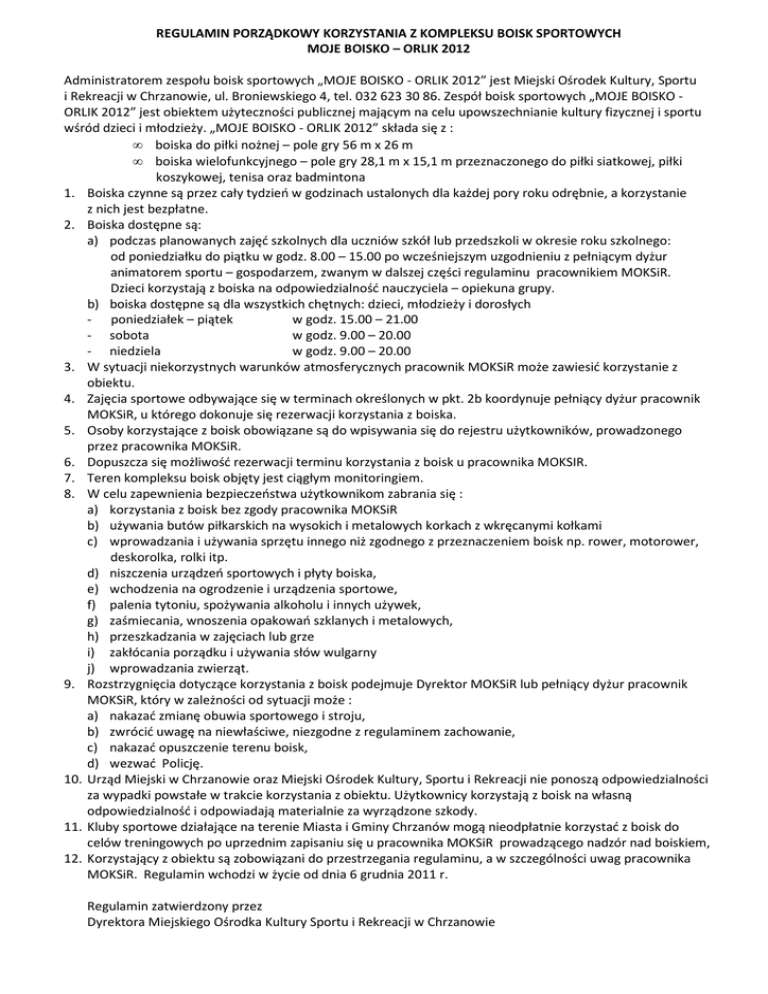 REGULAMIN PORZĄDKOWY KORZYSTANIA Z KOMPLEKSU BOISK SPORTOWYCH MOJE BOISKO – ORLIK 2012 Administratorem zespołu boisk sportowych „MOJE BOISKO - ORLIK 2012” jest Miejski Ośrodek Kultury, Sportu i Rekreacji w Chrzanowie, ul. Broniewskiego 4, tel. 032 623 30 86. Zespół boisk sportowych „MOJE BOISKO ORLIK 2012” jest obiektem użyteczności publicznej mającym na celu upowszechnianie kultury fizycznej i sportu wśród dzieci i młodzieży. „MOJE BOISKO - ORLIK 2012” składa się z : • boiska do piłki nożnej – pole gry 56 m x 26 m • boiska wielofunkcyjnego – pole gry 28,1 m x 15,1 m przeznaczonego do piłki siatkowej, piłki koszykowej, tenisa oraz badmintona 1. Boiska czynne są przez cały tydzień w godzinach ustalonych dla każdej pory roku odrębnie, a korzystanie z nich jest bezpłatne. 2. Boiska dostępne są: a) podczas planowanych zajęć szkolnych dla uczniów szkół lub przedszkoli w okresie roku szkolnego: od poniedziałku do piątku w godz. 8.00 – 15.00 po wcześniejszym uzgodnieniu z pełniącym dyżur animatorem sportu – gospodarzem, zwanym w dalszej części regulaminu pracownikiem MOKSiR. Dzieci korzystają z boiska na odpowiedzialność nauczyciela – opiekuna grupy. b) boiska dostępne są dla wszystkich chętnych: dzieci, młodzieży i dorosłych - poniedziałek – piątek w godz. 15.00 – 21.00 - sobota w godz. 9.00 – 20.00 - niedziela w godz. 9.00 – 20.00 3. W sytuacji niekorzystnych warunków atmosferycznych pracownik MOKSiR może zawiesić korzystanie z obiektu. 4. Zajęcia sportowe odbywające się w terminach określonych w pkt. 2b koordynuje pełniący dyżur pracownik MOKSiR, u którego dokonuje się rezerwacji korzystania z boiska. 5. Osoby korzystające z boisk obowiązane są do wpisywania się do rejestru użytkowników, prowadzonego przez pracownika MOKSiR. 6. Dopuszcza się możliwość rezerwacji terminu korzystania z boisk u pracownika MOKSIR. 7. Teren kompleksu boisk objęty jest ciągłym monitoringiem. 8. W celu zapewnienia bezpieczeństwa użytkownikom zabrania się : a) korzystania z boisk bez zgody pracownika MOKSiR b) używania butów piłkarskich na wysokich i metalowych korkach z wkręcanymi kołkami c) wprowadzania i używania sprzętu innego niż zgodnego z przeznaczeniem boisk np. rower, motorower, deskorolka, rolki itp. d) niszczenia urządzeń sportowych i płyty boiska, e) wchodzenia na ogrodzenie i urządzenia sportowe, f) palenia tytoniu, spożywania alkoholu i innych używek, g) zaśmiecania, wnoszenia opakowań szklanych i metalowych, h) przeszkadzania w zajęciach lub grze i) zakłócania porządku i używania słów wulgarny j) wprowadzania zwierząt. 9. Rozstrzygnięcia dotyczące korzystania z boisk podejmuje Dyrektor MOKSiR lub pełniący dyżur pracownik MOKSiR, który w zależności od sytuacji może : a) nakazać zmianę obuwia sportowego i stroju, b) zwrócić uwagę na niewłaściwe, niezgodne z regulaminem zachowanie, c) nakazać opuszczenie terenu boisk, d) wezwać Policję. 10. Urząd Miejski w Chrzanowie oraz Miejski Ośrodek Kultury, Sportu i Rekreacji nie ponoszą odpowiedzialności za wypadki powstałe w trakcie korzystania z obiektu. Użytkownicy korzystają z boisk na własną odpowiedzialność i odpowiadają materialnie za wyrządzone szkody. 11. Kluby sportowe działające na terenie Miasta i Gminy Chrzanów mogą nieodpłatnie korzystać z boisk do celów treningowych po uprzednim zapisaniu się u pracownika MOKSiR prowadzącego nadzór nad boiskiem, 12. Korzystający z obiektu są zobowiązani do przestrzegania regulaminu, a w szczególności uwag pracownika MOKSiR. Regulamin wchodzi w życie od dnia 6 grudnia 2011 r. Regulamin zatwierdzony przez Dyrektora Miejskiego Ośrodka Kultury Sportu i Rekreacji w Chrzanowie