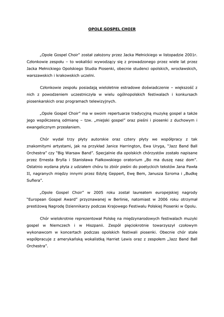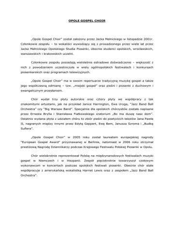 OPOLE GOSPEL CHOIR „Opole Gospel Choir" został załoŜony przez Jacka Mełnickiego w listopadzie 2001r. Członkowie zespołu – to wokaliści wywodzący się z prowadzonego przez wiele lat przez Jacka Mełnickiego Opolskiego Studia Piosenki, obecnie studenci opolskich, wrocławskich, warszawskich i krakowskich uczelni. Członkowie zespołu posiadają wieloletnie estradowe doświadczenie – większość z nich z powodzeniem uczestniczyła w wielu ogólnopolskich festiwalach i konkursach piosenkarskich oraz programach telewizyjnych. „Opole Gospel Choir” ma w swoim repertuarze tradycyjną muzykę gospel a takŜe jego współczesną odmianę – tzw. „miejski gospel” oraz pieśni i piosenki z duchowym i ewangelicznym przesłaniem. Chór wydał trzy płyty autorskie oraz cztery płyty we współpracy z tak znakomitymi artystami, jak na przykład Janice Harrington, Ewa Uryga, “Jazz Band Ball Orchestra” czy “Big Warsaw Band”. Specjalnie dla opolskich chórzystów zostało napisane przez Ernesta Brylla i Stanisława Fiałkowskiego oratorium „Bo ma duszę nasz dom”. Ostatnio wydana płyta z udziałem chóru to zbiór pieśni do poetyckich tekstów Jana Pawła II, nagranych między innymi przez Edytę Geppert, Ewę Bem, Janusza Szroma i „Budkę Suflera”. „Opole Gospel Choir” w 2005 roku został laureatem europejskiej nagrody “European Gospel Award” przyznawanej w Berlinie, natomiast w 2006 roku otrzymał prestiŜową Nagrodę Dziennikarzy podczas Krajowego Festiwalu Polskiej Piosenki w Opolu. Chór wielokrotnie reprezentował Polskę na międzynarodowych festiwalach muzyki gospel w Niemczech i w Hiszpanii. Zespół pięciokrotnie towarzyszył czołowym wykonawcom w koncertach podczas opolskich festiwali piosenki. Obecnie chór stale współpracuje z amerykańską wokalistką Harriet Lewis oraz z zespołem „Jazz Band Ball Orchestra”.