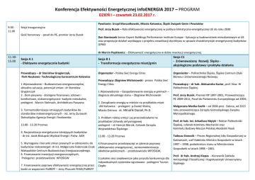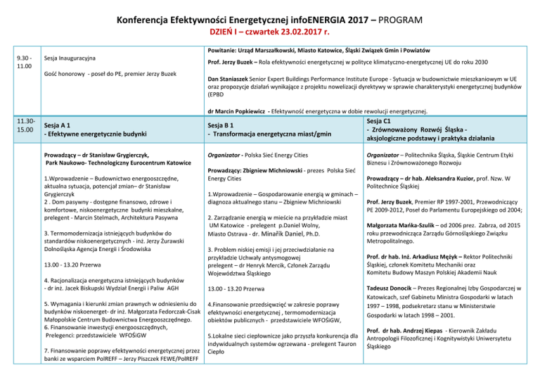 Konferencja Efektywności Energetycznej infoENERGIA 2017 – PROGRAM DZIEŃ I – czwartek 23.02.2017 r. Powitanie: Urząd Marszałkowski, Miasto Katowice, Śląski Związek Gmin i Powiatów 9.30 11.00 Sesja Inauguracyjna Gość honorowy - poseł do PE, premier Jerzy Buzek Prof. Jerzy Buzek – Rola efektywności energetycznej w polityce klimatyczno-energetycznej UE do roku 2030 Dan Staniaszek Senior Expert Buildings Performance Institute Europe - Sytuacja w budownictwie mieszkaniowym w UE oraz propozycje działań wynikające z projektu nowelizacji dyrektywy w sprawie charakterystyki energetycznej budynków (EPBD dr Marcin Popkiewicz - Efektywność energetyczna w dobie rewolucji energetycznej. 11.3015.00 Sesja A 1 - Efektywne energetycznie budynki Sesja B 1 - Transformacja energetyczna miast/gmin Prowadzący – dr Stanisław Grygierczyk, Park Naukowo- Technologiczny Eurocentrum Katowice Organizator - Polska Sieć Energy Cities 1.Wprowadzenie – Budownictwo energooszczędne, aktualna sytuacja, potencjał zmian– dr Stanisław Grygierczyk 2 . Dom pasywny - dostępne finansowo, zdrowe i komfortowe, niskoenergetyczne budynki mieszkalne, prelegent - Marcin Stelmach, Architektura Pasywna 3. Termomodernizacja istniejących budynków do standardów niskoenergetycznych - inż. Jerzy Żurawski Dolnośląska Agencja Energii i Środowiska 13.00 - 13.20 Przerwa 4. Racjonalizacja energetyczna istniejących budynków - dr inż. Jacek Biskupski Wydział Energii i Paliw AGH 5. Wymagania i kierunki zmian prawnych w odniesieniu do budynków niskoenerget- dr inż. Małgorzata Fedorczak-Cisak Małopolskie Centrum Budownictwa Energooszczędnego. 6. Finansowanie inwestycji energooszczędnych, Prelegenci: przedstawiciele WFOŚiGW 7. Finansowanie poprawy efektywności energetycznej przez banki ze wsparciem PolREFF – Jerzy Piszczek FEWE/PolREFF Prowadzący: Zbigniew Michniowski - prezes Polska Sieć Energy Cities 1.Wprowadzenie – Gospodarowanie energią w gminach – diagnoza aktualnego stanu – Zbigniew Michniowski 2. Zarządzanie energią w mieście na przykładzie miast UM Katowice - prelegent p.Daniel Wolny, Miasto Ostrava - dr. Minařík Daniel, Ph.D. 3. Problem niskiej emisji i jej przeciwdziałanie na przykładzie Uchwały antysmogowej prelegent – dr Henryk Mercik, Członek Zarządu Województwa Śląskiego 13.00 - 13.20 Przerwa 4.Finansowanie przedsięwzięć w zakresie poprawy efektywności energetycznej , termomodernizacja obiektów publicznych - przedstawiciele WFOŚiGW, 5.Lokalne sieci ciepłownicze jako przyszła konkurencja dla indywidualnych systemów ogrzewana - prelegent Tauron Ciepło Sesja C1 - Zrównoważony Rozwój Śląska aksjologiczne podstawy i praktyka działania Organizator – Politechnika Śląska, Śląskie Centrum Etyki Biznesu i Zrównoważonego Rozwoju Prowadzący – dr hab. Aleksandra Kuzior, prof. Nzw. W Politechnice Śląskiej Prof. Jerzy Buzek, Premier RP 1997-2001, Przewodniczący PE 2009-2012, Poseł do Parlamentu Europejskiego od 2004; Małgorzata Mańka-Szulik – od 2006 prez. Zabrza, od 2015 roku przewodnicząca Zarządu Górnośląskiego Związku Metropolitalnego. Prof. dr hab. Inż. Arkadiusz Mężyk – Rektor Politechniki Śląskiej, członek Komitetu Mechaniki oraz Komitetu Budowy Maszyn Polskiej Akademii Nauk Tadeusz Donocik – Prezes Regionalnej Izby Gospodarczej w Katowicach, szef Gabinetu Ministra Gospodarki w latach 1997 – 1998, podsekretarz stanu w Ministerstwie Gospodarki w latach 1998 – 2001. Prof. dr hab. Andrzej Kiepas - Kierownik Zakładu Antropologii Filozoficznej i Kognitywistyki Uniwersytetu Śląskiego 8. Prezentacja rozwiązań systemowych w zakresie dostawy technologii dla poprawy efektywności enenergenerget. 14.0016.30 6.Sprawny, niskoemisyjny transport miejski - prelegent Ryszard Wróbel, Miejski Zarząd Komunikacji Kraków 7. Finansowanie w formule Partnerstwa Publiczno – Prywatnego w obszarze efektywności Energetycznej prelegent – Jan Twardowski Fundacja Efektywnego Wykorzystania Energii. Sesja D1 Szkolenie dla firm obciążonych nadmiernymi kosztami zakupu energii elektrycznej Temat - Kiedy opłaca się stosować odnawialne źródła energii w małej firmie. Prowadzący szkolenie- Instytut Energetyki Odnawialnej DZIEŃ II – piątek 24.02.2017 r. zagadnienia techniczno-ekonomiczne 9.30 12.30 Sesja A2 Efektywność energetyczna budynków - aspekty techniczne, najnowsze rozwiązania Prowadzący: dr inż. Jacek Biskupski, Politech. Krakowska Sesja B2 Perspektywy dla wykorzystania OZE przez prosumentów prywatnych i biznesowych – w świetle Ustawy OZE i uwarunkowań rynku Prowadzący : Grzegorz Wiśniewski – prezes Instytutu Energii Odnawialnych Sesja C2 Transformacja energetyczna miast/gmin Otwarte posiedzenie wyjazdowe Komisji d/s Lokalnej Polityki Energetycznej Organizator :Śląski Związek Gmin i Powiatów 1.Nakłady finansowe i korzyści wynikające z budowy różnych typów budynków energooszczędnych, Prelegent - dr inż. Arkadiusz Węglarz, KAPE 1.Perspektywy rozwoju OZE w Polsce - wpływ ustawy o odnawialnych źródłach energii - G. Wiśniewski IEO. 2.Systemy zarządzania energią w budynkach dla zwiększenia efektywności energetycznej – dr inż. Jacek Biskupski, Politechnika Krakowska 2.Jak rozsądnie inwestować w mikroinstalacje prosumenckie i efektywnie z nich korzystać? prelegent- dr Marcin Fice, Politechnika Śląska 3..Sprawdzone techniki w zakresie zaopatrzenia w ciepło – nowoczesne systemy grzewcze, pompy ciepła - Grzegorz Ojczyk, specjalista d/s systemów grzewczych i OZE 3.Szanse i ryzyka dla prosumenckiego modelu OZE prelegent Kamil Pluskwa-Dabrowa, prezes Rady Krajowej Federacji Konsumentów 11.00 - 11.20 Przerwa 4.Zintegrowane systemy do wytwarzania ciepła i energii elektrycznej z magazynowaniem energii. 2. Inwestowanie w poprawę efektywności energetycznej i systemy energetyczne – oferta doradców WFOŚiGW – p. Łukasz Balion, Doradca energetyczny WFOŚiGW Katowice 5. Przykłady 