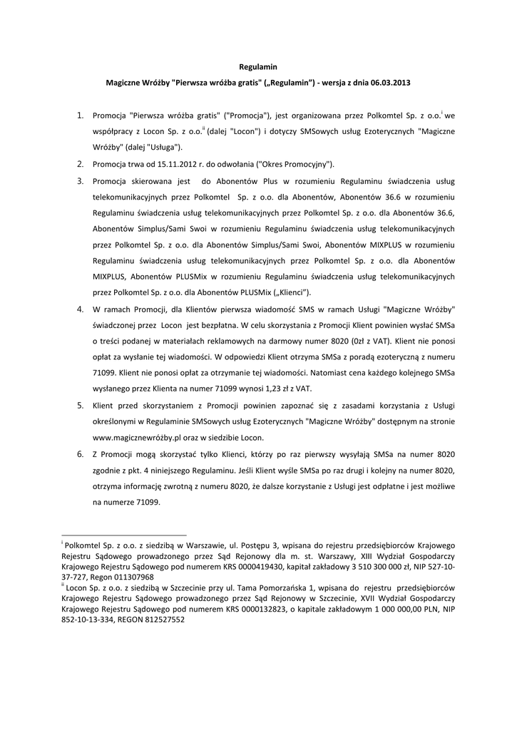 Magiczne Wróżby "Pierwsza wróżba gratis" („Regulamin”) - wersja z dnia 06.03.2013