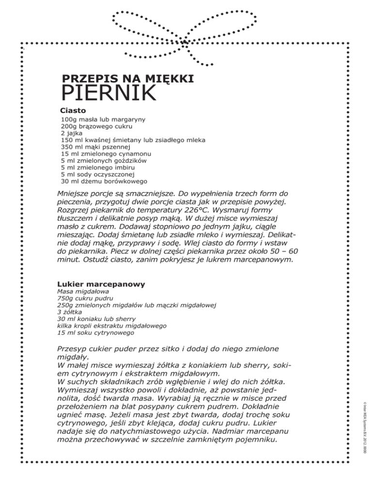 . PRZEPIS NA MIĘKKI PIERNIK Ciasto 100g masła lub margaryny 200g brązowego cukru 2 jajka 150 ml kwaśnej śmietany lub zsiadłego mleka 350 ml mąki pszennej 15 ml zmielonego cynamonu 5 ml zmielonych goździków 5 ml zmielonego imbiru 5 ml sody oczyszczonej 30 ml dżemu borówkowego Mniejsze porcje są smaczniejsze. Do wypełnienia trzech form do pieczenia, przygotuj dwie porcje ciasta jak w przepisie powyżej. Rozgrzej piekarnik do temperatury 226°C. Wysmaruj formy tłuszczem i delikatnie posyp mąką. W dużej misce wymieszaj masło z cukrem. Dodawaj stopniowo po jednym jajku, ciągle mieszając. Dodaj śmietanę lub zsiadłe mleko i wymieszaj. Delikatnie dodaj mąkę, przyprawy i sodę. Wlej ciasto do formy i wstaw do piekarnika. Piecz w dolnej części piekarnika przez około 50 – 60 minut. Ostudź ciasto, zanim pokryjesz je lukrem marcepanowym. Lukier marcepanowy Masa migdałowa 750g cukru pudru 250g zmielonych migdałów lub mączki migdałowej 3 żółtka 30 ml koniaku lub sherry kilka kropli ekstraktu migdałowego 15 ml soku cytrynowego © Inter IKEA Systems B.V. 2012. 0000 Przesyp cukier puder przez sitko i dodaj do niego zmielone migdały. W małej misce wymieszaj żółtka z koniakiem lub sherry, sokiem cytrynowym i ekstraktem migdałowym. W suchych składnikach zrób wgłębienie i wlej do nich żółtka. Wymieszaj wszystko powoli i dokładnie, aż powstanie jednolita, dość twarda masa. Wyrabiaj ją ręcznie w misce przed przełożeniem na blat posypany cukrem pudrem. Dokładnie ugnieć masę. Jeżeli masa jest zbyt twarda, dodaj trochę soku cytrynowego, jeśli zbyt klejąca, dodaj cukru pudru. Lukier nadaje się do natychmiastowego użycia. Nadmiar marcepanu można przechowywać w szczelnie zamkniętym pojemniku.