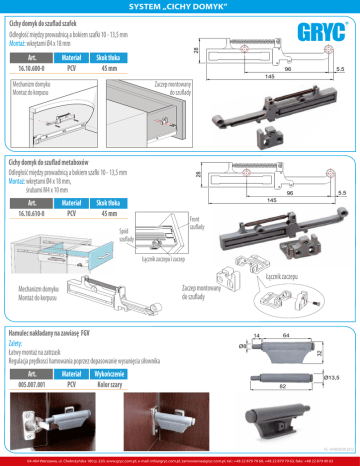 SYSTEM „CICHY DOMYK” Art. 16.10.600-0 Materiał PCV 28 Cichy domyk do szuflad szafek Odległość między prowadnicą a bokiem szafki 10 - 13,5 mm Montaż: wkrętami Ø4 x 18 mm Skok tłoka 45 mm Zaczep montowany do szuflady Mechanizm domyku Montaż do korpusu Materiał PCV 28 Cichy domyk do szuflad metaboxów Odległość między prowadnicą a bokiem szafki 10 - 13,5 mm Montaż: wkrętami Ø4 x 18 mm, śrubami M4 x 10 mm Art. 16.10.610-0 5.5 96 145 5.5 96 145 Skok tłoka 45 mm Front szuflady Spód szuflady Łącznik zaczepu i zaczep Łącznik zaczepu Zaczep montowany do szuflady Hamulec nakładany na zawiasę FGV Zalety: Łatwy montaż na zatrzask Regulacja prędkosci hamowania poprzez dopasowanie wysunięcia siłownika Art. 005.007.001 Materiał PCV Wykończenie Kolor szary 14 64 Ø8 32 Mechanizm domyku Montaż do korpusu Ø13,5 82 FG - 0108/09.09.2012 04-464 Warszawa, ul. Chełmżyńska 180 p. 220, www.gryc.com.pl, e-mail: [email protected], [email protected], tel.: +48 22 879 79 60, +48 22 879 79 63, faks: +48 22 879 90 62 SYSTEM „CICHY DOMYK” Amortyzator cichego domykania „BLUES” - wpuszczany, wymagane wiercenie w panelu Zastosowanie: Do drzwi szaf i szafek Art. 15.04.517 Materiał ABS - Wymiary Trwałość Ø10 mm x 50 mm 80 tys. cykli Wykończenie Kolor szary n. Mi + Odległość od krawędzi ok. 150 - 200 mm Wymiary otworu Ø10 x 52 mm Ø 10 mm Adapter podwójny do amortyzatora cichego domykania „Blues” Zastosowanie: Do drzwi szaf i szafek Amortyzator i śruby dostępne osobno 32 Materiał ABS 52 Wymiary Odległość otworów Wykończenie 46 mm x 52 mm 32 mm Kolor szary 46 Art. 15.04.516 m m 52 Ø4,5 Dostępny osobno Adatper pojedynczy do amortyzatora cichego domykania „Blues” Zastosowanie: Do drzwi szaf i szafek Amortyzator i śruby dostępne osobno Materiał ABS Wymiary Odległość otworów Wykończenie 20 mm x 53,5 mm 32 mm Kolor szary Ø5 ,5 53 ,6 52 20 Art. 15.04.515 32 Dostępny osobno 04-464 Warszawa, ul. Chełmżyńska 180 p. 220, www.gryc.com.pl, e-mail: [email protected], [email protected], tel.: +48 22 879 79 60, +48 22 879 79 63, faks: +48 22 879 90 62