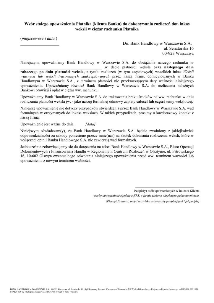 Wzór stałego upoważnienia Płatnika (klienta Banku) do dokonywania rozliczeń dot. inkas weksli w ciężar rachunku Płatnika (miejscowość i data ) __________________ Do: Bank Handlowy w Warszawie S.A. ul. Senatorska 16 00-923 Warszawa Niniejszym, upoważniamy Bank Handlowy w Warszawie S.A. do obciążania naszego rachunku nr _________________________________________ w dacie płatności weksla oraz następnego dnia roboczego po dniu płatności weksla, z tytułu rozliczeń (w tym częściowych) wszelkich inkas Weksli własnych lub weksli trasowanych zaakceptowanych przez naszą firmę, domicylowanych w Banku Handlowym w Warszawie S.A., z terminem płatności nie przekraczającym daty ważności niniejszego upoważnienia. Upoważniamy również Bank Handlowy w Warszawie S.A. do rozliczania należnych Bankowi prowizji i opłat w ciężar ww. rachunku. Upoważniamy Bank Handlowy w Warszawie S.A. do traktowania braku środków na ww. rachunku w dniu rozliczania płatności weksla jw. - jako naszej formalnej odmowy zapłaty całości lub części sumy wekslowej. Niniejsze upoważnienie nie dotyczy przypadków stwierdzenia przez Bank Handlowy w Warszawie S.A. wad formalnych w otrzymanych do inkasa wekslach. W takich przypadkach, prosimy o każdorazowy kontakt z naszą firmą. Upoważnienie jest ważne do dnia _____ [data]. Niniejszym oświadczam(y), że Bank Handlowy w Warszawie S.A. będzie zwolniony z jakiejkolwiek odpowiedzialności za szkody poniesione przeze mnie(nas) na skutek dokonania rozliczenia weksli, które w wyłącznej opinii Banku Handlowego S.A. nie zawierają wad formalnych. Jednocześnie zobowiązujemy się do doręczenia na adres Bank Handlowy w Warszawie S.A., Biuro Operacji Dokumentowych i Finansowania Handlu w Regionalnym Centrum Rozliczeń w Olsztynie, ul. Pstrowskiego 16, 10-602 Olsztyn ewentualnego odwołania niniejszego upoważnienia przed ww. terminem ważności lub upoważnienia z nowym terminem ważności. ___________________________ Podpis(y) osób upoważnionych w imieniu Klienta -osoby upoważnione zgodnie z KRS, o ile nie złożono odrębnego pełnomocnictwa, (Pieczęć firmowa, imię i nazwisko osób/osoby podpisującej i jej podpis) BANK HANDLOWY w WARSZAWIE S.A.; 00-923 Warszawa; ul. Senatorska 16; ;Sąd Rejonowy dla m.st. Warszawy w Warszawie, XII Wydział Gospodarczy Krajowego Rejestru Sądowego, nr KRS 000 000 1538; NIP 526-030-02-91; kapitał zakładowy 522.638.400 złotych w pełni opłacony.
