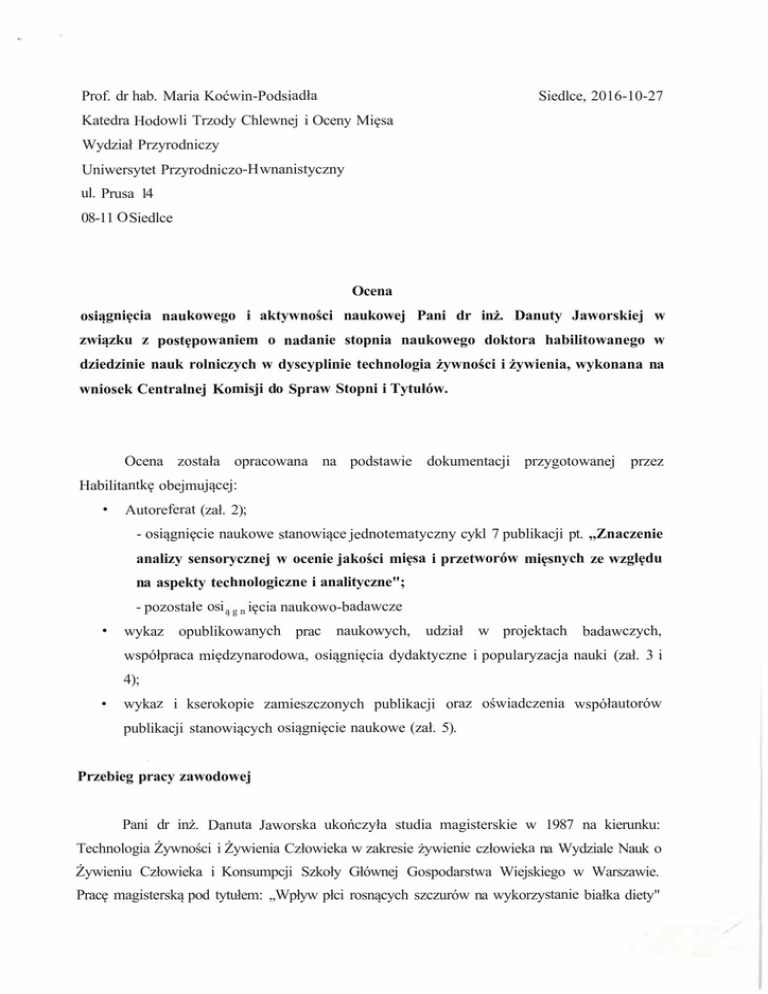 Prof. dr hab. Maria Koćwin-Podsiadła Siedlce, 2016-10-27 Katedra Hodowli Trzody Chlewnej i Oceny Mięsa Wydział Przyrodniczy Uniwersytet Przyrodniczo-H wnanistyczny ul. Prusa 14 08-11 O Siedlce Ocena osiągnięcia naukowego i aktywności naukowej Pani dr inż. Danuty Jaworskiej w związku z postępowaniem o nadanie stopnia naukowego doktora habilitowanego w dziedzinie nauk rolniczych w dyscyplinie technologia żywności i żywienia, wykonana na wniosek Centralnej Komisji do Spraw Stopni i Tytułów. Ocena została opracowana na podstawie dokumentacji przygotowanej przez Habilitantkę obejmującej: • Autoreferat (zał. 2); - osiągnięcie naukowe stanowiące jednotematyczny cykl 7 publikacji pt. ,,Znaczenie analizy sensorycznej w ocenie jakości mięsa i przetworów mięsnych ze względu na aspekty technologiczne i analityczne"; - pozostałe osi ą g n ięcia naukowo-badawcze • wykaz opublikowanych prac naukowych, udział w projektach badawczych, współpraca międzynarodowa, osiągnięcia dydaktyczne i popularyzacja nauki (zał. 3 i 4); • wykaz i kserokopie zamieszczonych publikacji oraz oświadczenia współautorów publikacji stanowiących osiągnięcie naukowe (zał. 5). Przebieg pracy zawodowej Pani dr inż. Danuta Jaworska ukończyła studia magisterskie w 1987 na kierunku: Technologia Żywności i Żywienia Człowieka w zakresie żywienie człowieka na Wydziale Nauk o Żywieniu Człowieka i Konsumpcji Szkoły Głównej Gospodarstwa Wiejskiego w Warszawie. Pracę magisterską pod tytułem: ,,Wpływ płci rosnących szczurów na wykorzystanie białka diety" 2 wykonała pod kierunkiem prof. dr hab. Janusza Kellera z Instytutu Genetyki i Hodowli Zwierząt w Jastrzębcu PAN. W latach 1987 - 2005 (miała 8 letnią przerwę w pracy na urlopy wychowawcze) ale była zatrudniona jako asystent w Katedrze Żywności Funkcjonalnej, Ekologicznej i Towaroznawstwa na Wydziale Nauk o Żywieniu Człowieka i Konsumpcji SGGW w Warszawie,jednocześnie uczęszczając na studia doktoranckie (2001-2004) W 2004 roku uzyskała stopień naukowy doktora z wyróżnieniem w dziedzinie Nauk Rolniczych w dyscyplinie Technologia Żywności i Żywienia. Po obronie rozprawy doktorskiej nt: ,,Wpływ cech tekstury na ogólną jakość sensoryczną i akceptację wybranych produktów spożywczych" wykonanej pod kierunkiem prof. dr hab. Franciszka Świderskiego, w 2005 r rozpoczęła pracę jako adiunkt w Katedrze Technologii Gastronomicznej i Higieny Żywności na Wydziale Nauk o Żywieniu Człowieka i Konsumpcji SGGW w Warszawie, gdzie pracuje do chwili obecnej. Prowadzenie badań poprzedzone było zorganizowaniem laboratorium przez Kandydatkę i właściwym przeszkoleniem osób do stosowania metody profilowania jakości (Quantitive Descriptive Analysis - QDA) zgodnie z wymaganiami ISO 13299:2003. Od 2005 roku rozpoczęła pracę, zgodnie ze standardem ISO 8586-2:1996, nad podnoszeniem kwalifikacji osób tworzących zespół oceniający, poprzez odpowiednie przygotowanie teoretyczne i praktyczne, które Habilitantka uzyskała w wyniku wieloletniej współpracy z wielkim autorytetem naukowym Panią prof. dr hab. Niną Baryłko-Pikielną oraz doświadczenia zdobytego w trakcie staży w pracowni analiz sensorycznych na Uniwersytecie w Bonn (w latach 2004-2007). W konsekwencji prowadzonych szkoleń, poszczególni oceniający uzyskali wieloletnie doświadczenie w sensorycznych ocenach mięsa i jego produktów. Zespół działa pod kierownictwem dr inż. D. Jaworskiej, którego była i jest liderem. W ocenach laboratoryjnych Habilitantkę cechuje 14 letnie doświadczenie. Badania dotyczące wpływu różnych czynników na jakość produktów spożywczych w tym mięsa i jego przetworów Kandydatka opublikowała w wielu artykułach, z czego 6 przedstawiono do osiągnięcia. W pracach, które dotyczyły innych aspektów badawczych rola Habilitantki polegała na zaplanowaniu i przeprowadzeniu doświadczeń sensorycznych, opracowaniu wyników, ich omówieniu i przedyskutowaniu. Ponadto do osiągnięcia dr inż. D. Jaworska włączyła rozdział w monografii angielskojęzycznej opublikowanej w Wydawnictwie CRC Press Taylor and Franis Group, gdzie został przedstawiony stan wiedzy oraz proponowane kryteria w zakresie oceny jakości mięsa, ustalone w oparciu o własne doświadczenia Habilitantki oraz dane piśmiennictwa, dotyczące metodycznych aspektów badania jakości mięsa. 3 Ocena osiągnięcia naukowego Osiągnięcie naukowe Pani dr inż. Danuty Jaworskiej pt. ,,Znaczenie analizy sensorycznej w ocenie jakości mięsa i przetworów mięsnych ze względu na aspekty technologiczne i analityczne" dokumentuje cykl 7 jednotematycznych publikacji naukowych opublikowanych po uzyskaniu stopnia naukowego doktora. Prace te opublikowane zostały w latach 2008-2016. Spośród cyklu prac, 6 anglojęzycznych oryginalnych prac twórczych zostało opublikowane w czasopismach wyróżnionych przez Journal Citation Reports (Meat Science-I, Food Science and Technology Research - 1, International Journal of Food Science and Technology - 1, Journal of Biomedicine and Biotechnology - 1, Meat Quality. Genetic and Enviromental Factors - 1, Żywność, Nauka, Technologia, Jakość -2. Łączna wartość tych publikacji wg kryteriów Ministra Nauki i Szkolnictwa Wyższego z maja 2010 roku wynosi 114 punktów a sumaryczny ich Impast Factor wg listy Journal Citation Reports zgodnie z rokiem opublikowania wynosi 5,882. W 4 pracach stanowiących jednotematyczny cykl publikacji Pani dr inż. Danuta Jaworska jest pierwszym autorem, w 3 występuje więcej niż jeden współautor. Udział Habilitantki w tych pracach jest jednak wiodący i wynosi śr 52% (1 -80%, 1-70%, 1-60%, 3 40%, 1- 34%). Kandydatka swój udział uzasadnia pomysłowością koncepcji badań oraz przeprowadzeniem badań. Wkład Habilitantki w przygotowanie manuskryptu odnotowano w 6 pracach, zaś w ostatniej 1 pracy o charakterze monografii napisała część rozdziału. W przedstawi