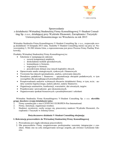 Sprawozdanie z działalności Wirtualnej Studenckiej Firmy Konsultingowej V-Student Consulting Sp. z o.o., działającej przy Wydziale Ekonomii, Zarządzania i Turystyki Uniwersytetu Ekonomicznego we Wrocławiu za rok 2015 Wirtualna Studencka Firma Konsultingowa V-Student Consulting Sp. z o.o., rozpoczęła swoją działalność 14 listopada 2013 roku. Siedziba V-Student Consulting mieści się przy ul. Nowowiejskiej 3, 58-500 Jelenia Góra, a reprezentowana jest przez Prezesa Firmy Paulinę Waśkowską. Produkty Wirtualnej Studenckiej Firmy Konsultingowej to: Szkolenia w następującym zakresie: o rozwój kompetencji miękkich, o doskonalenie technik sprzedażowych, o komunikacja w biznesie, o negocjacje w biznesie, o pozyskiwanie dotacji oraz innych kapitałów obcych. Opracowanie analiz strategicznych, rynkowych i finansowych. Tworzenie baz danych (gromadzenie, analiza, sortowanie danych). Doradztwo podatkowe i finansowe – optymalizacja obciążeń podatkowych, w tym szczególnie dla początkujących przedsiębiorstw. Przeprowadzanie audytów wybranych obszarów działalności firmy, w tym, m.in.: audyty systemu logistycznego, audyty jakości, audyty finansowe. Organizacja seminariów, konferencji, warsztatów, dni otwartych, targów. Projektowanie i prowadzenie gier ekonomicznych. Organizowanie spotkań biznesowych z przedsiębiorcami i szkołami Wirtualna Studencka Firma Konsultingowa V-Student Consulting Sp. z o.o. określiła grupy docelowe swojej działalności jako: 1. Firmy symulacyjne z sieci CENSYM I EUROPEN-Pen International. 2. Firmy, instytucje, organizacje (realne). 3. Studenci, uczniowie, osoby uczące się, pracownicy naukowi Wydziału Ekonomii, Zarządzania i Turystyki w Jeleniej Górze. Dotychczasowe działania V-Student Consulting obejmują: I. Rekrutację pracowników do Wirtualnej Studenckiej Firmy Konsultingowej 1. Prowadzona jest ciągła rekrutacja pracowników. 2. Dla pracowników Firmy zorganizowano profesjonalne warsztaty integracyjne z coachem. Miały one na celu zintegrowanie nowego zespołu, jak również wyłonienie liderów. II. Opracowanie misji, wizji Wirtualnej Studenckiej Firmy Konsultingowej 1. Dokonano aktualizacji misji firmy. Dzięki zaangażowaniu wszystkich pracowników udało nam się stworzyć misję naszej firmy, która jednoznacznie identyfikuje nasze cele: „Wirtualna firma – realne sukcesy” 2. Nie mniej emocji wywołała „burza mózgów”, w efekcie której powstała druga bardzo ważna podstawa naszych działań – wizja Wirtualnej Studenckiej Firmy Konsultingowej w brzmieniu: „Na przestrzeni najbliższych lat pragniemy stać się najlepszą studencką firmą konsultingową na świecie. Nieustanne samodoskonalenie i podnoszenie kwalifikacji umożliwi nam poszerzenie oferty od tworzenia prostych baz danych do kompleksowych analiz. Poprzez nieszablonowość i wzajemną uczciwość zdobędziemy zaufanie stałych klientów. Rozwijając dynamicznie naszą firmę będziemy aktywnie wspierać doskonalenie kultury jakości kształcenia na Wydziale zbliżając jego ofertę edukacyjną do środowiska rynku pracy”. III. Cele strategiczne, cząstkowe oraz funkcjonalne Wirtualnej Studenckiej Firmy Konsultingowej Celem strategicznym Firmy jest – zdobycie i utrzymanie pozycji lidera na rynku usług konsultingowych na poziomie wirtualnych studenckich firm konsultingowych. Tabela 1. Cele cząstkowe, ich wskaźniki, projekty realizujące i osoby odpowiedzialni. Lp. Cele cząstkowe Sposób pomiaru Projekty badawcze i Kierownik projektu i Zerealizujące spół projektowy 1a. Ustalenie aktualne- 1a go poziomu rozpoznawalności Firmy na Wydziale (badania ankietowe, analiza obecności i aktywności w sieci / liczba polubień) 1 Uzyskanie wysokiego poziomu (min 80%) rozpoznawalności marki firmy Liczba respondentów znająoraz WEZiT na poziomie wirtual- cych markę / liczba wszystkich nych firm studenckich oraz w regio- badanych respondentów x nie dolnośląskim 100% 1b. „Zobaczcie, jacy 1b jesteśmy ponadprzeciętni” – kontakt z mediami i ośrodkami kreowania opinii (lista mediów i innych obiektów oraz harmonogram komunikacji z nimi). 1c. Film promujący 1c Firmę oraz towarzyszące mu działania publicity. 1d. Katalog ofertowy 1d dla klientów oraz innych członków otoczenia. Ustalenie standardów dla strony internetowej i procedura pracy z nią. 1e. Budowanie Kapita- 1e łu relacyjnego – patron, sponsorzy, partnerzy, Firma jako przyjaciel (akcje charytatywne). 2 Liczba kontaktów (zleceń) zreUzyskanie wysokiej jakości usług alizowanych bezbłędnie (czas, (poziom obsługi klienta 99%) do kompletność) / liczbę wszyst2015 i utrzymanie jej na danym pokich kontaktów (zleceń) x ziomie 100% 2a. Utworzenie bazy 2a klientów (CRM) pozwalającej m.in. na śledzenie jakości i poziomu obsługi klienta 2b. Ustalenie konstruk- 2b cji wskaźnika poziomu obsługi klienta i narzędzia kontroli tego wskaźnika 2c. Badanie aktualnego 2c poziomu obsługi klienta 3a. Wykaz aktualnych 3a kompetencji Pracowników Firmy 3 3b. Ustalenie kompe- 3b tencji niezbędnych do świadczenia usług określonych w ofercie i Liczba pożądanych kompeten- związanych z realizaZamknięcie luki kompetencyjnej cji vs liczba posiadanych kom- cją strategii rozwoju firmy do końca 2015 roku Firmy. Zbadanie luki petencji kompetencyjnej. 3c. Projekt szkoleń i 3c warsztatów 3d. Utworzenie bazy 3d poddostawców i ustalenie ich kompetencji. 4 4a. Baza danych firm 4a w Regionie oraz firm wirtualnych na świecie. Pozyskiwanie minimum 3 nowych Liczba klientów rocznie oraz Badanie ich potrzeb. klientów rocznie i utrzymywanie do- liczba klientów w danym roku / tychczasowych (na poziomie min liczbę klientów w roku po- 4b. Powołanie mene- 4b dżerów klienta (CEN80%) przednim x 100% SYM i inne wirtualne, firmy zewnętrzne, Wydział) 5 5a. Badanie rynku pod 5a kątem potrzeb w zakreWprowadzenie min 1 nowego proLiczba nowych produktów / sie szkoleń i konsultinduktu 